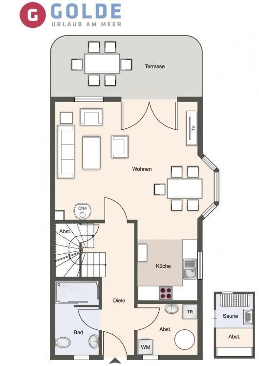 Im Erdgeschoss befindet sich der lichtdurchflutete Wohnraum mit TV, Apple TV, kleine Musikanlage mit Dockingstation für iPhone, Kaminofen, einer offenen Küche sowie einem stilvollen hellen Essbereich mit Blick auf die Düne. Die Wohnräume sind mit exklusiven Möbeln ausgestattet. Die Küche verfügt über hochwertige Elektrogeräte und lässt von der Nespressomaschine über ein Waffeleisen bis zur Salatschleuder keinen Wunsch offen. An den Wohnbereich schließen sich ein Flur mit eingebauter Garderobe, ein Hauswirtschaftsraum mit Waschmaschine und Trockner und ein Duschbad an. Das gesamte Erdgeschoss verfügt über ein hochwertiges weiß gekalktes Eichenparkett, welches über Fußbodenheizung beheizt werden kann.