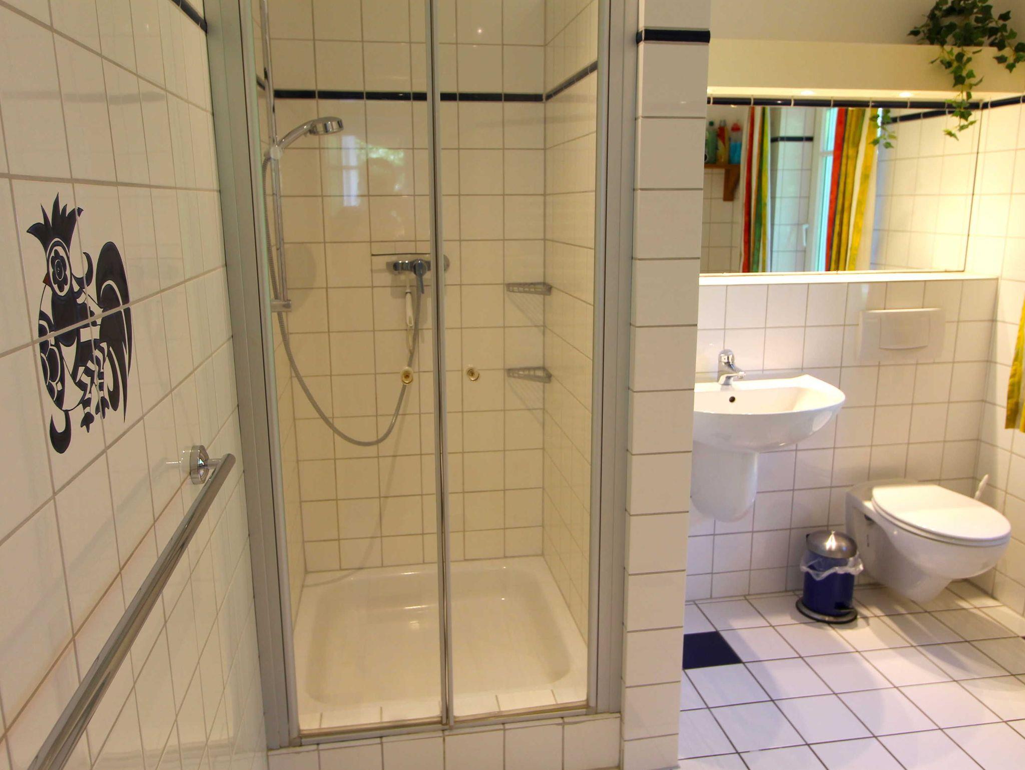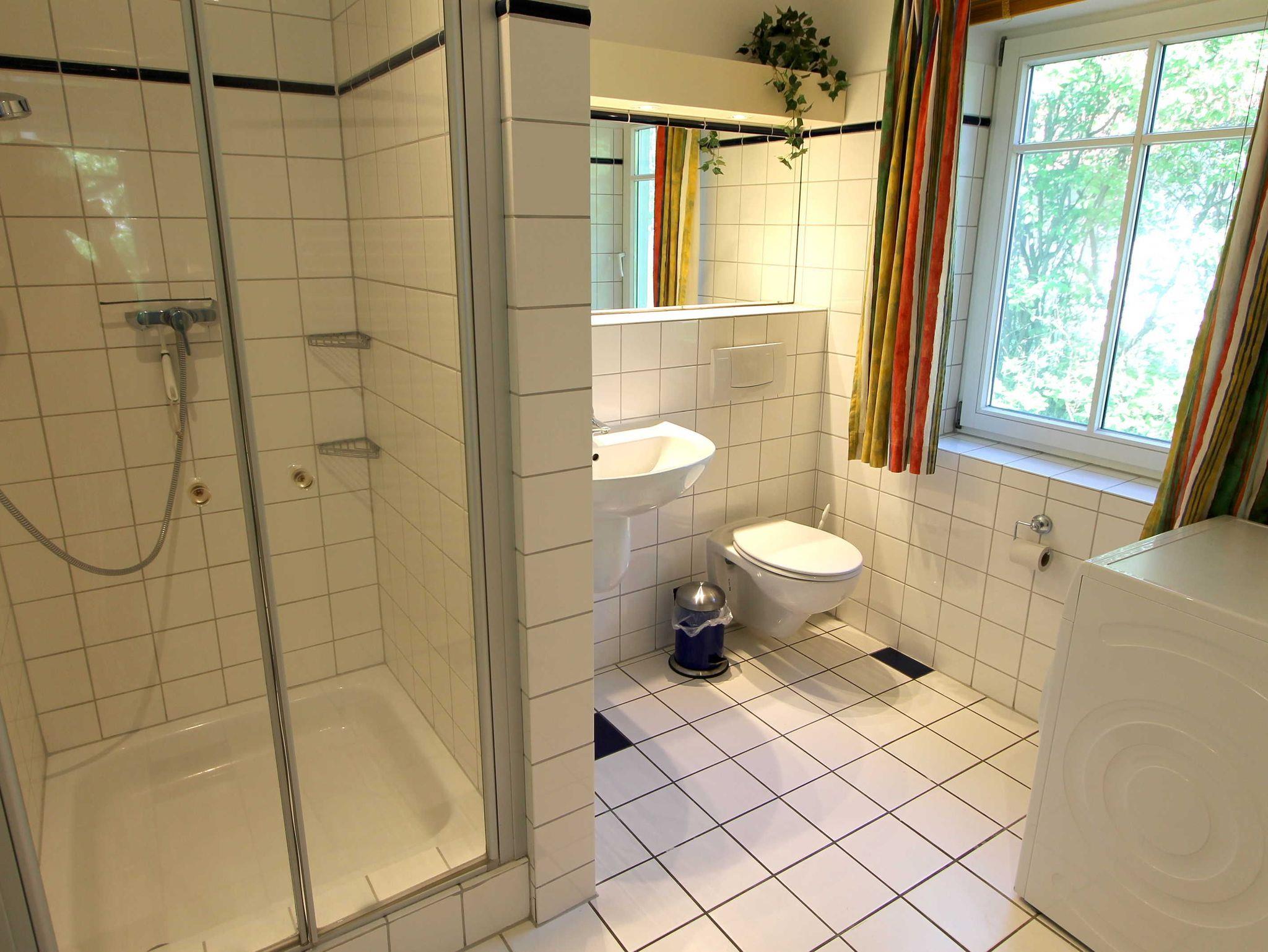 Das Badezimmer verfügt über eine Dusche, WC und Waschmaschine, es ist zusätzlich ein Gäste- WC vorhanden.