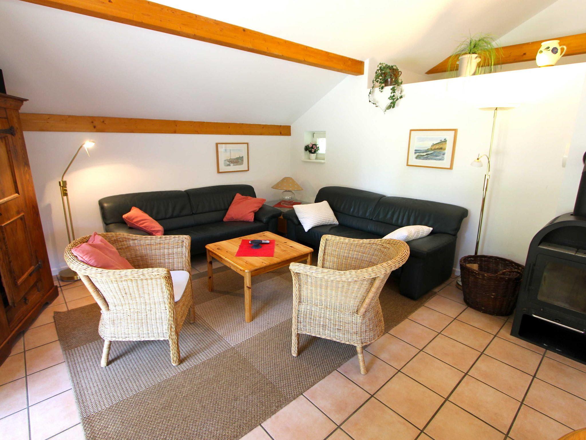 Im Wohnraum finden Sie eine gemütliche Couchecke mit Sat- TV und Kamin, darin integriert befindet sich der Essbereich mit Tisch und Stühlen.