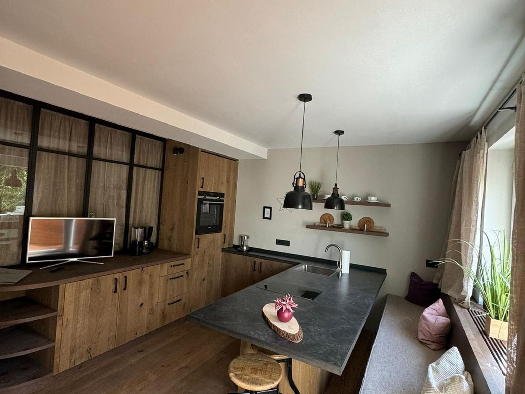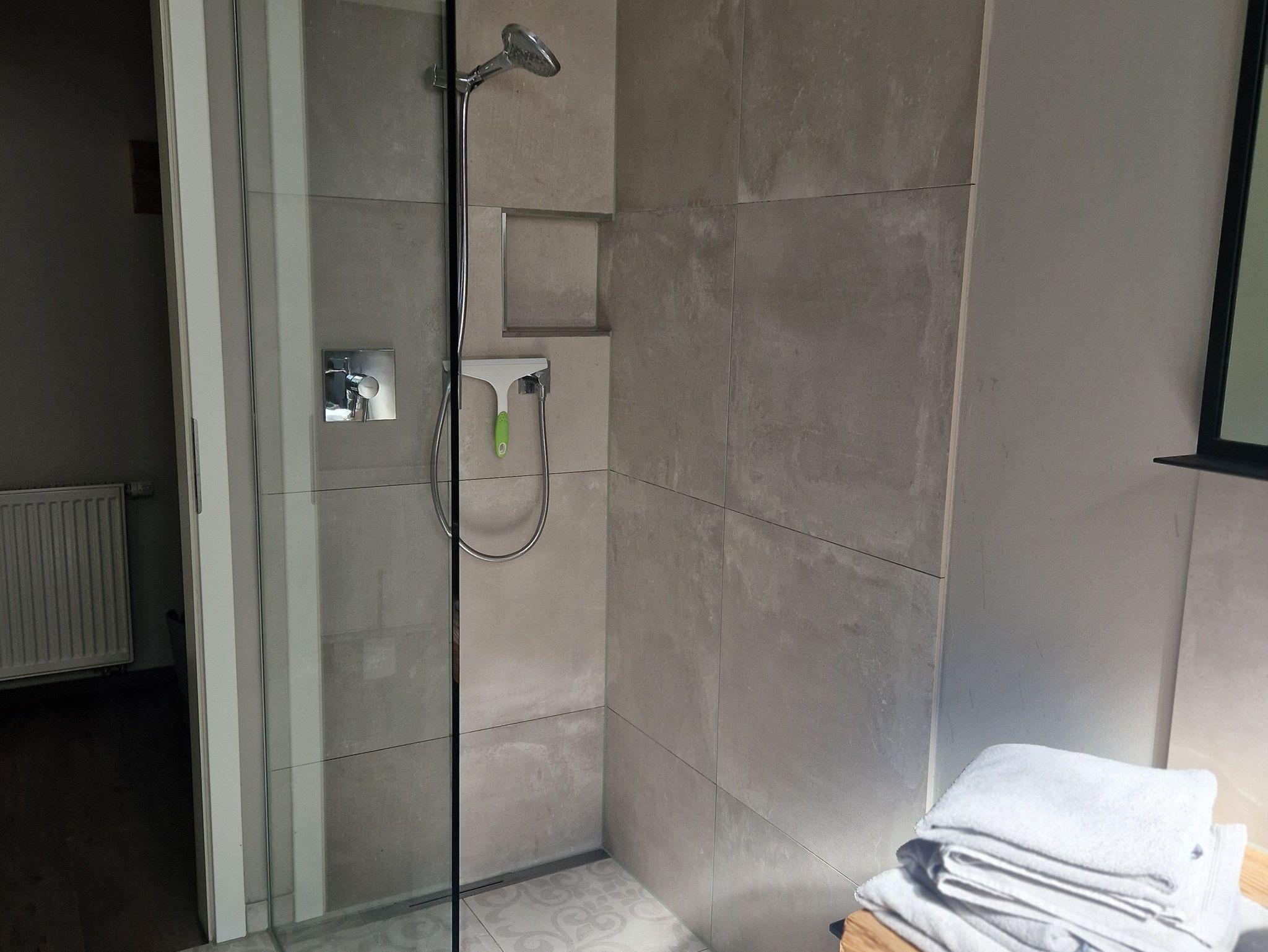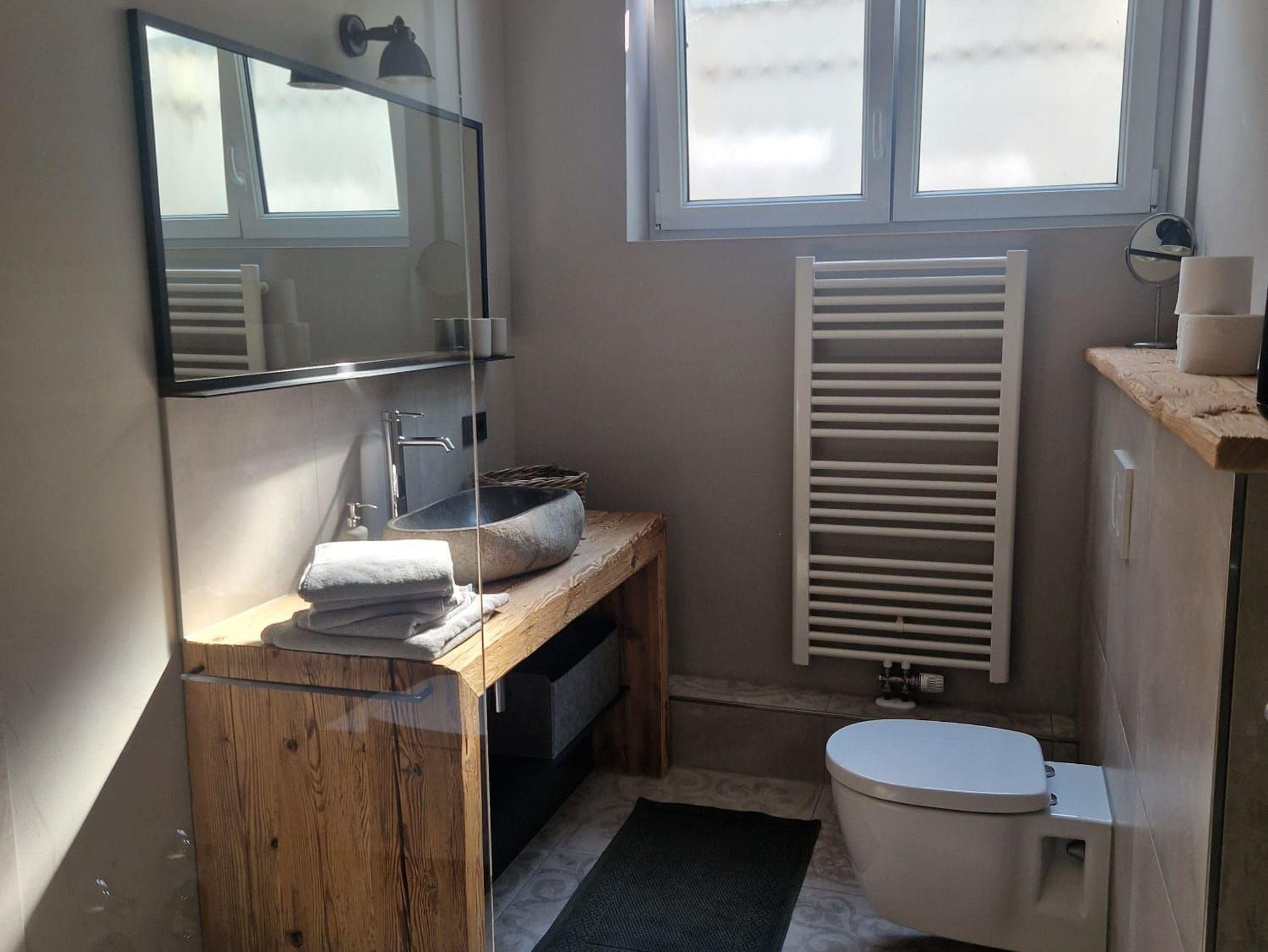 Das Bad besticht mit seinen hochwertigen Materialien aus Holz, einem Natur-Steinwaschbecken, einem großen Spiegel und einer begehbaren Dusche.