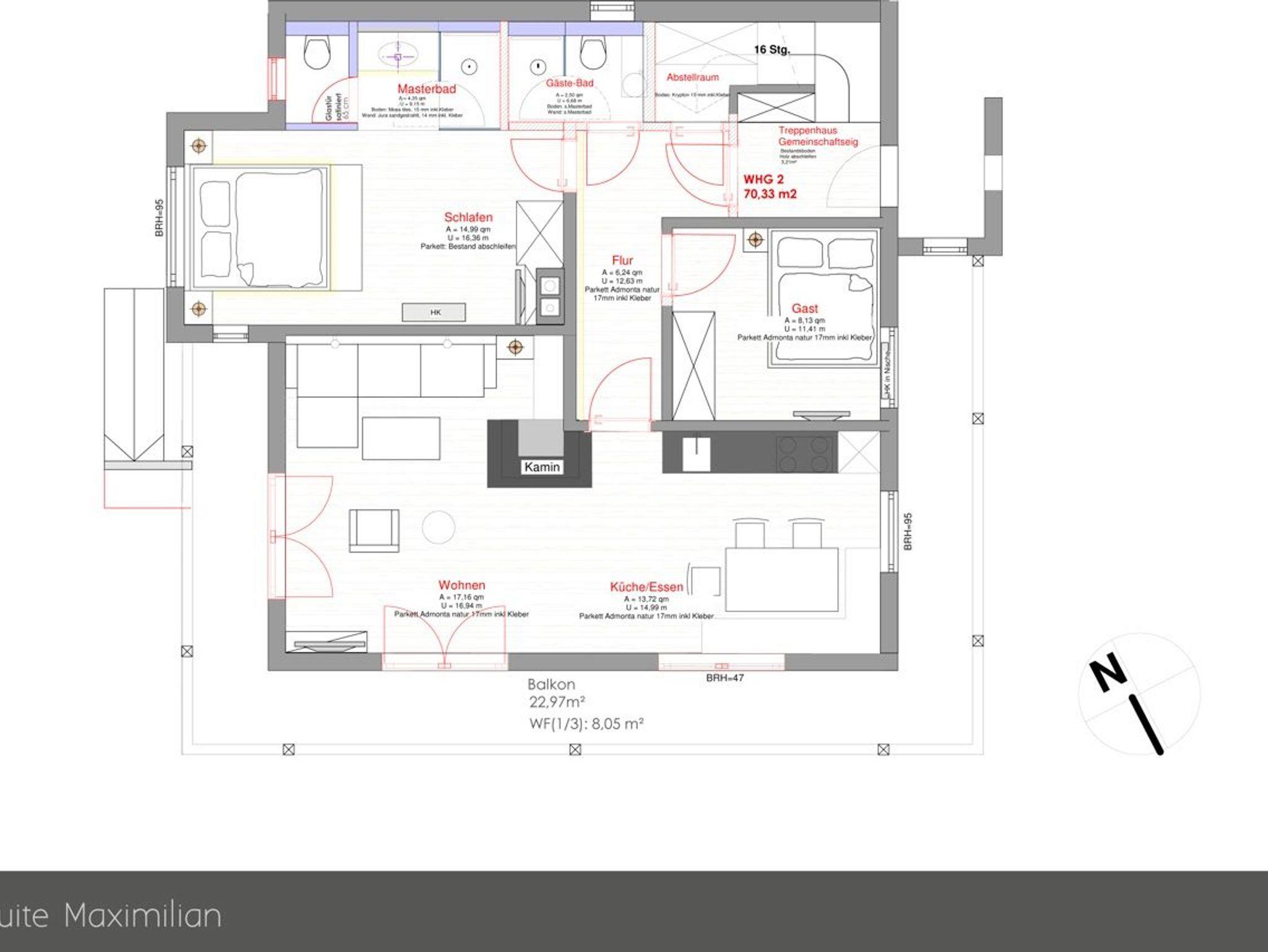 Zusätzlich zum großen, offenen Wohn-/Essbereich mit gemütlicher Sitzecke bietet die Suite Maximilian zwei helle und liebevoll eingerichtete Schlafzimmer mit Doppelbetten und zwei vollwertige Bäder - viel Raum zum Entspannen und Wohlfühlen! Eine exklusive Ausstattung mit Luxusküche, Flatscreen TV-Geräten, Fussbodenheizung sowie großzügigen Rain-Shower Glas-Duschen lassen keine Wünsche offen und den Urlaub unbeschwert genießen.