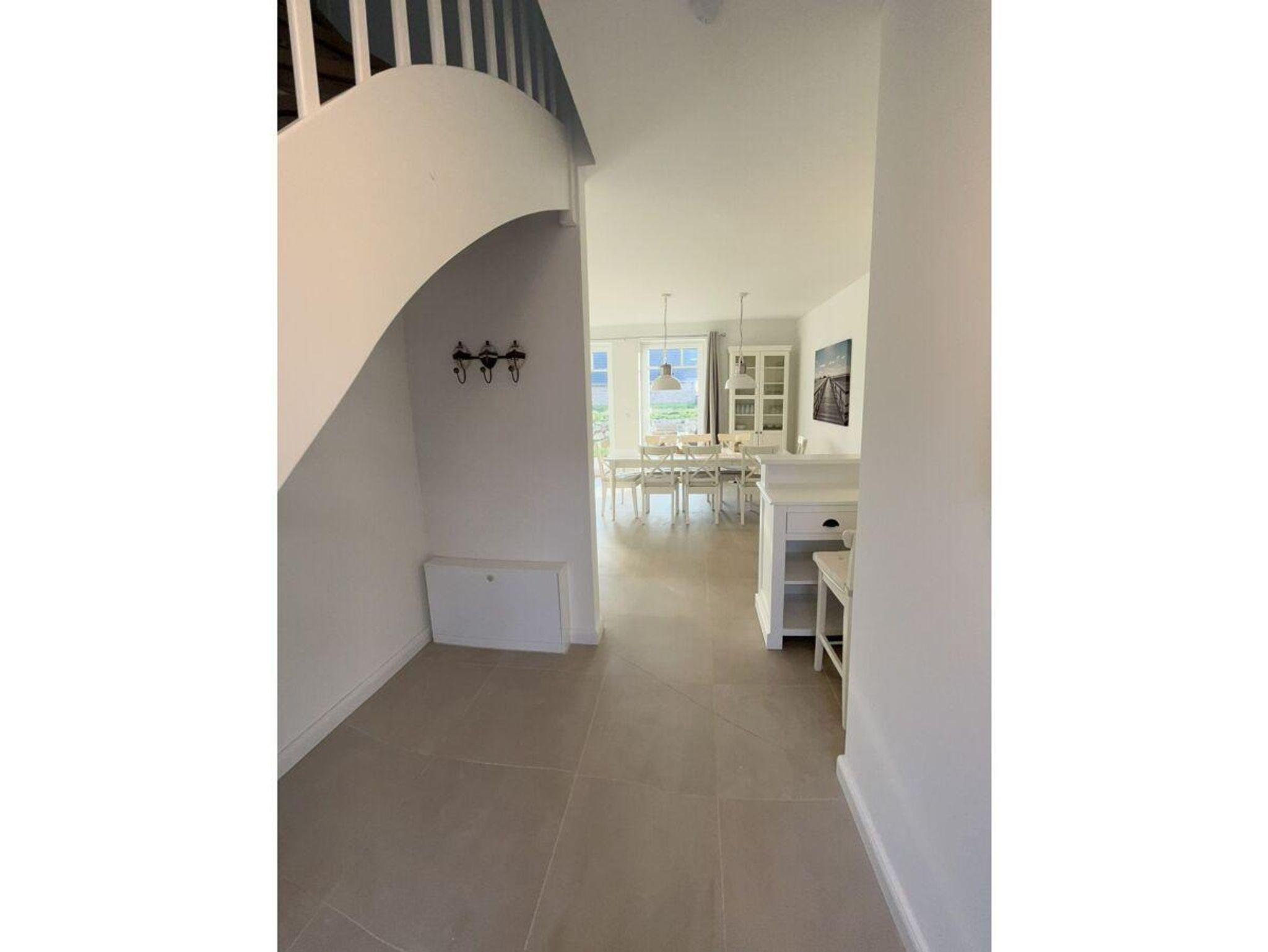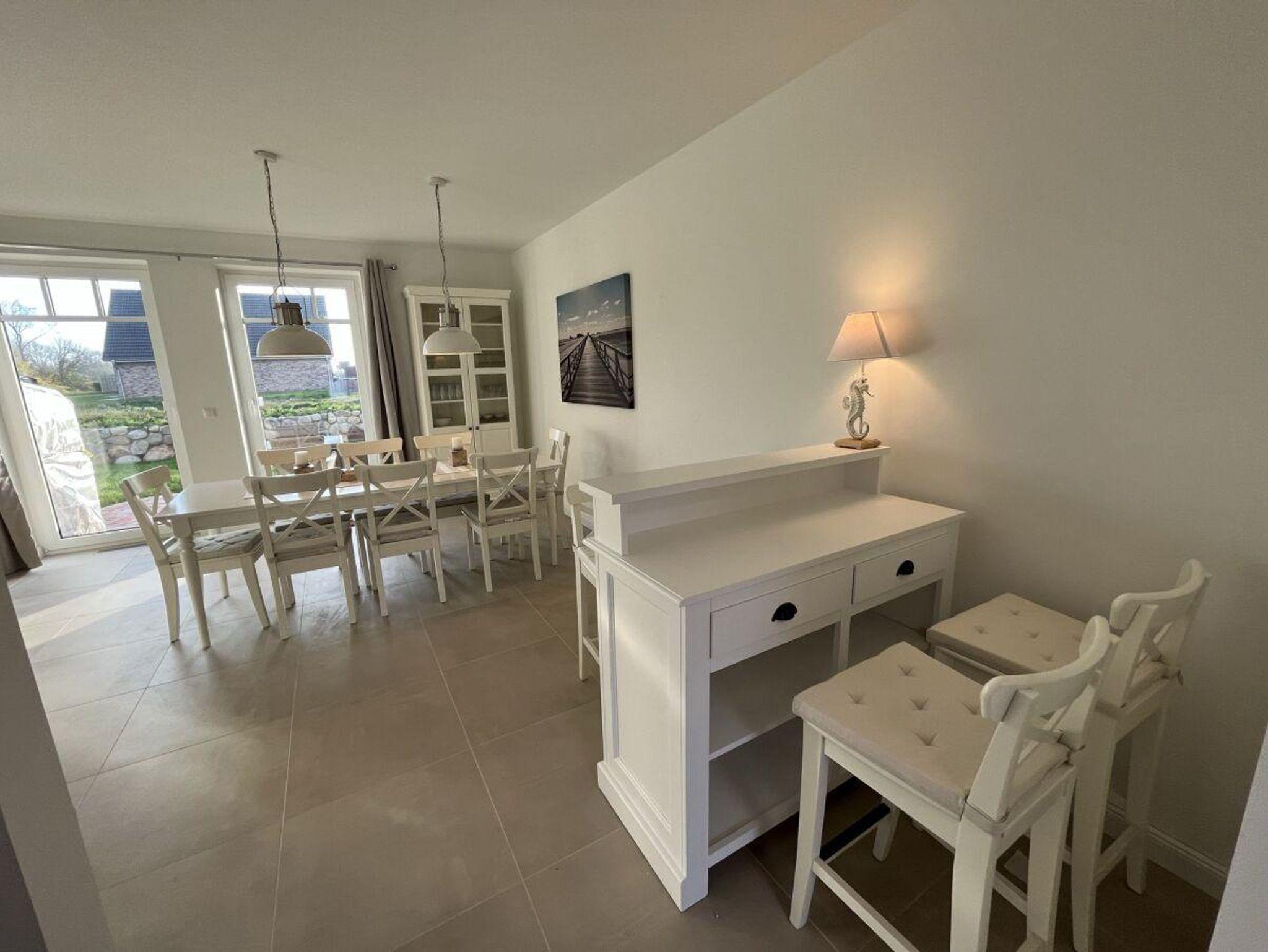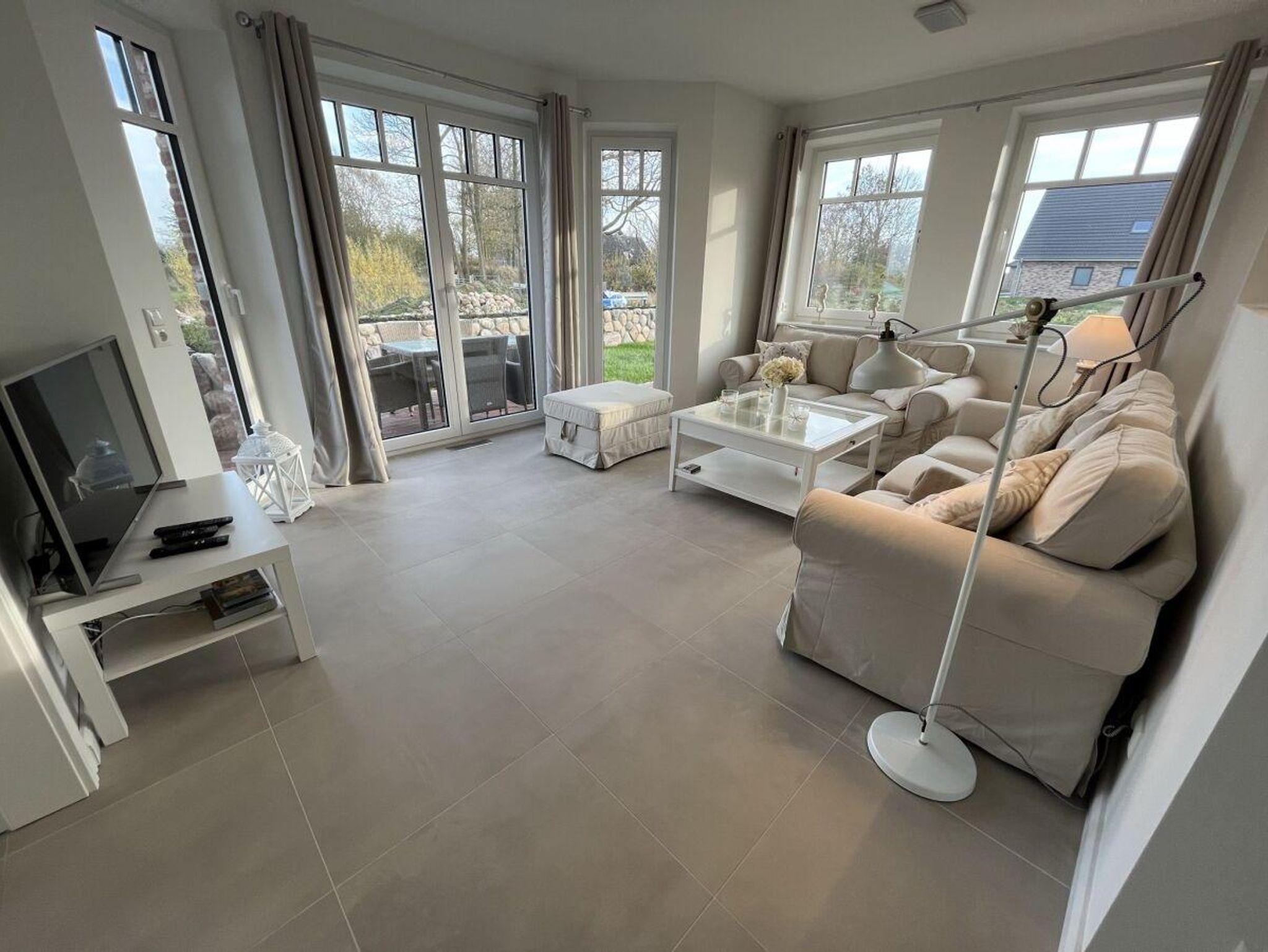 Traumhaftes Neubau - Friesenhaus, geschmackvoll und sonnig eingerichtet in weiss und beige Tönen. Die Haushälfte mit dem Erker ( diese wird vermietet ) verfügt über zwei Terrassen. Von der Östlichen Terasse schauen sie in die Weiten von grünen Wiesen.