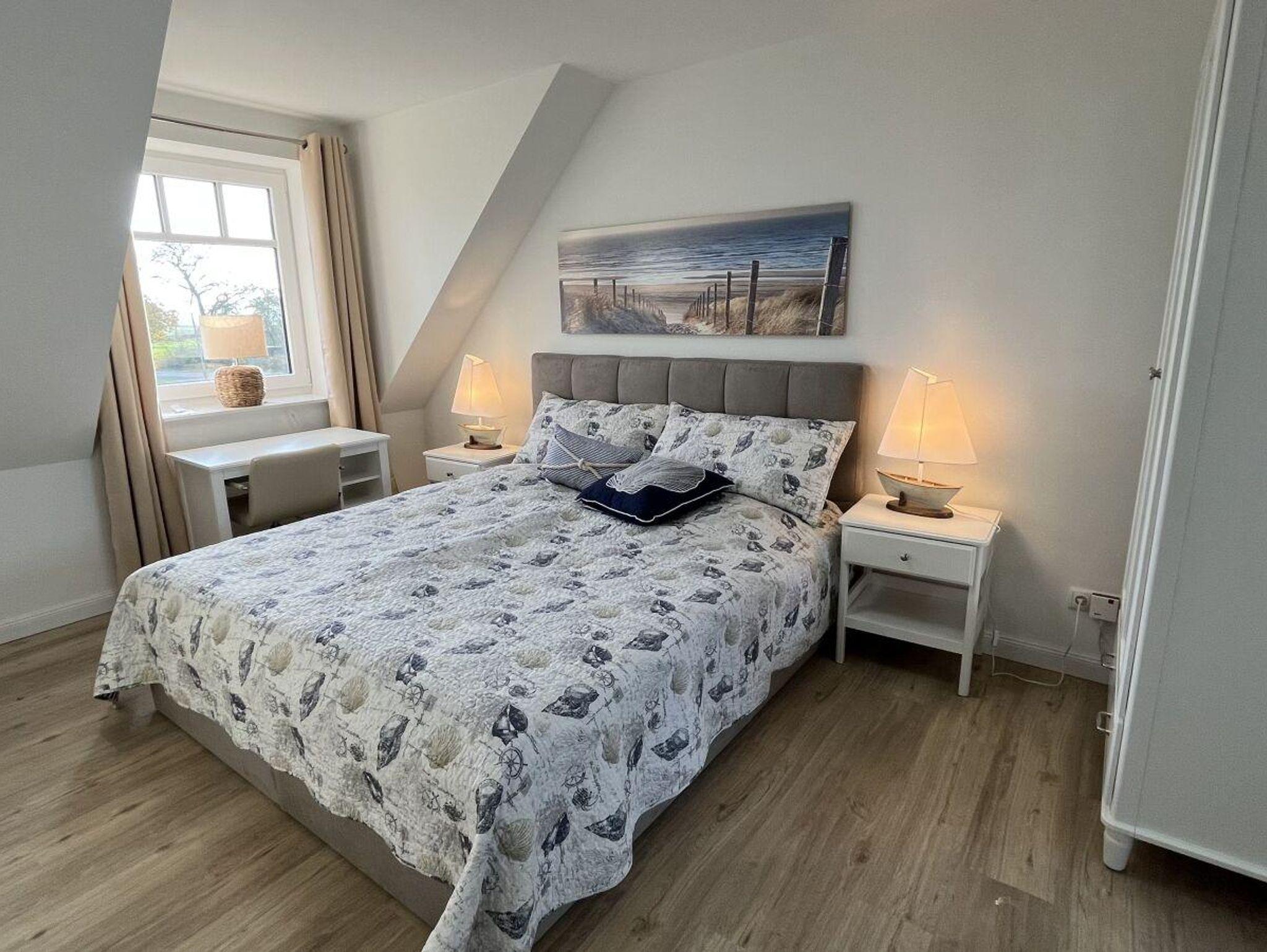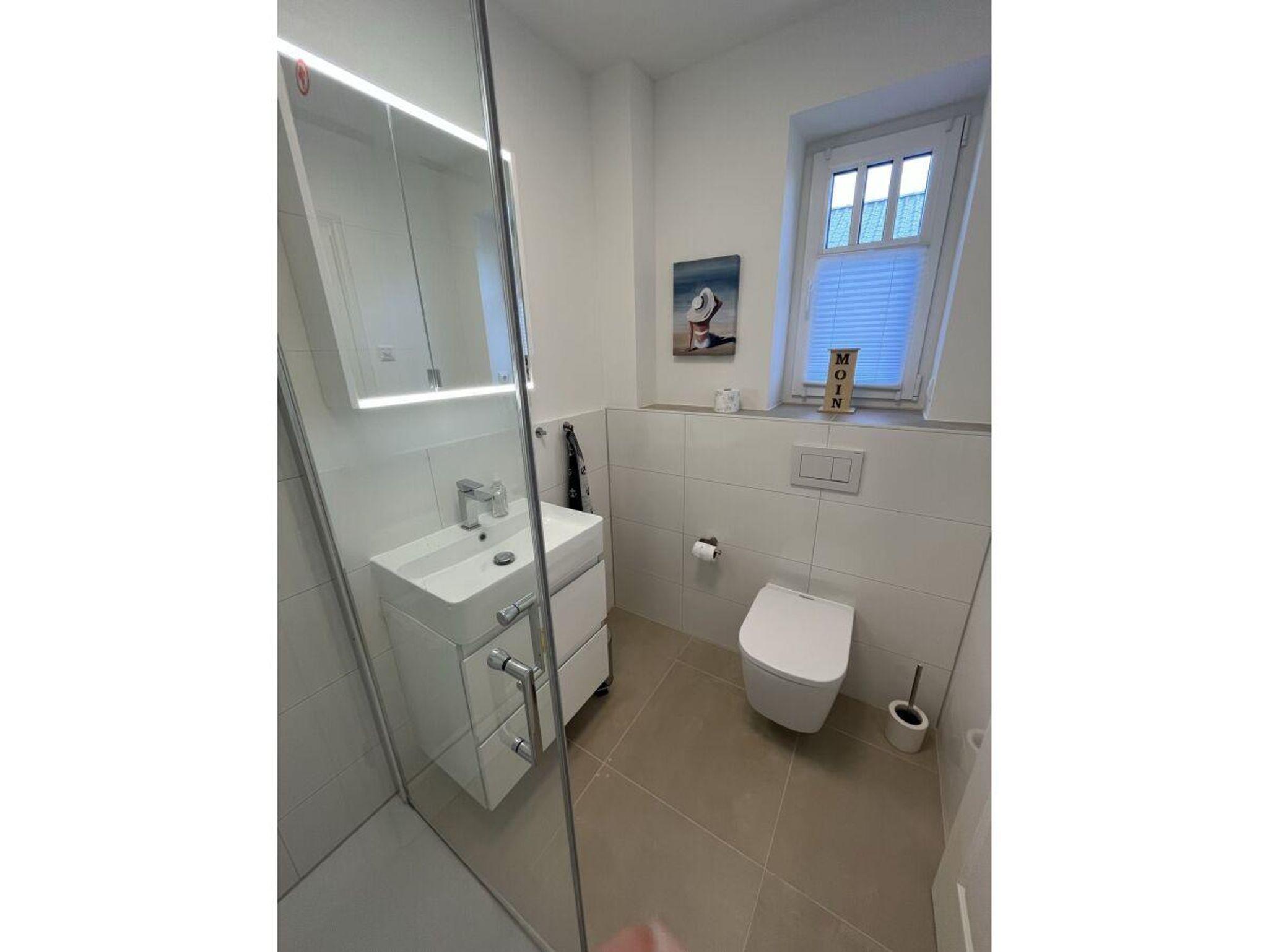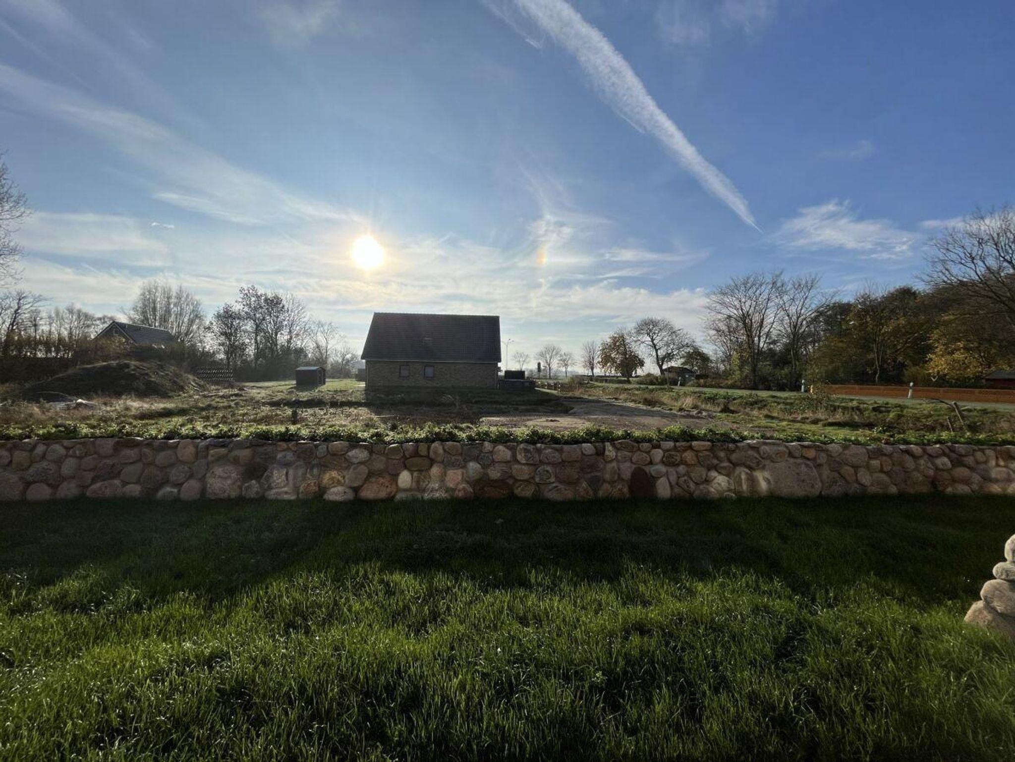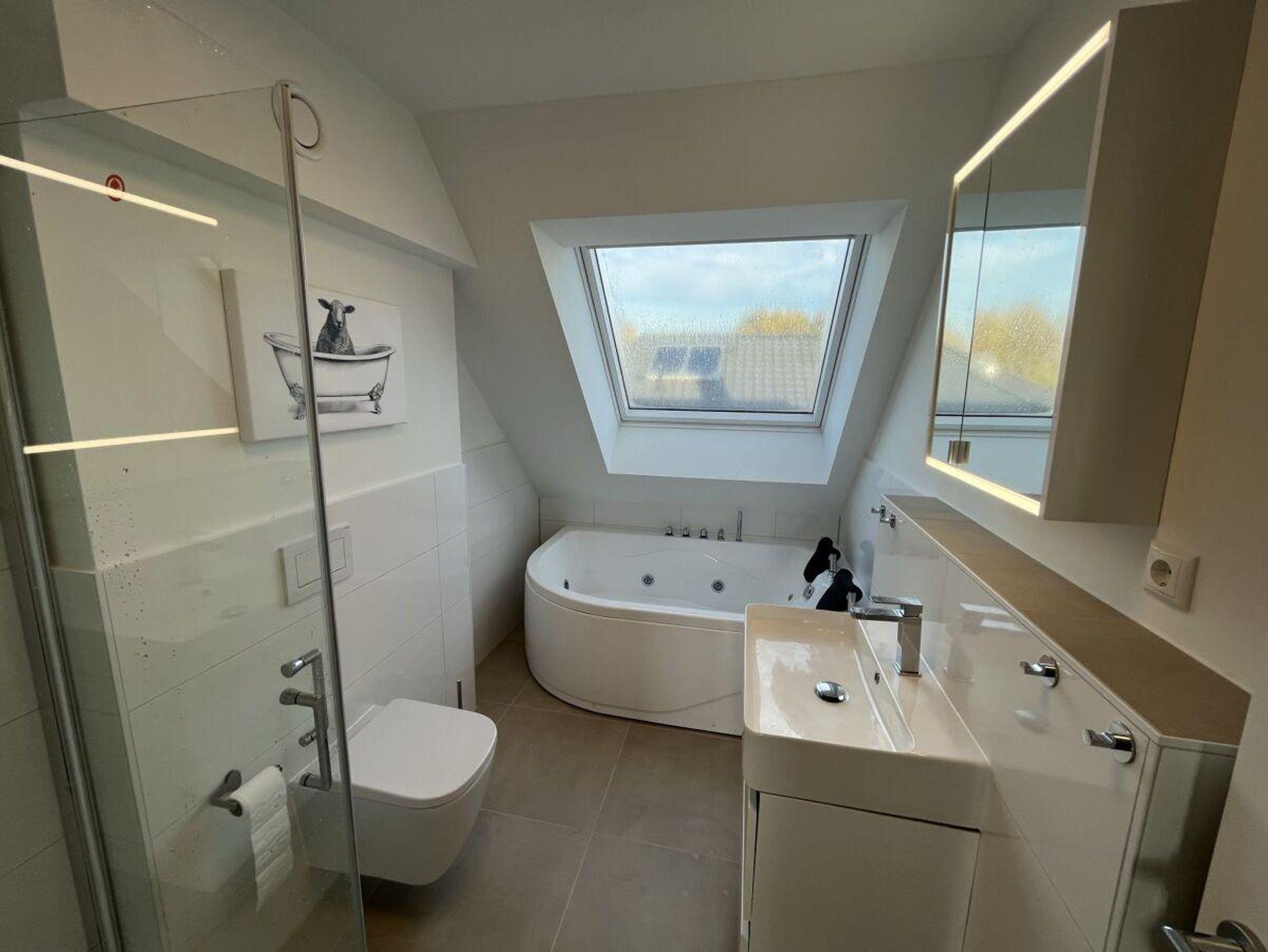 Traumhaftes Neubau - Friesenhaus, geschmackvoll und sonnig eingerichtet in weiss und beige Tönen. Die Haushälfte mit dem Erker ( diese wird vermietet ) verfügt über zwei Terrassen. Von der Östlichen Terasse schauen sie in die Weiten von grünen Wiesen.