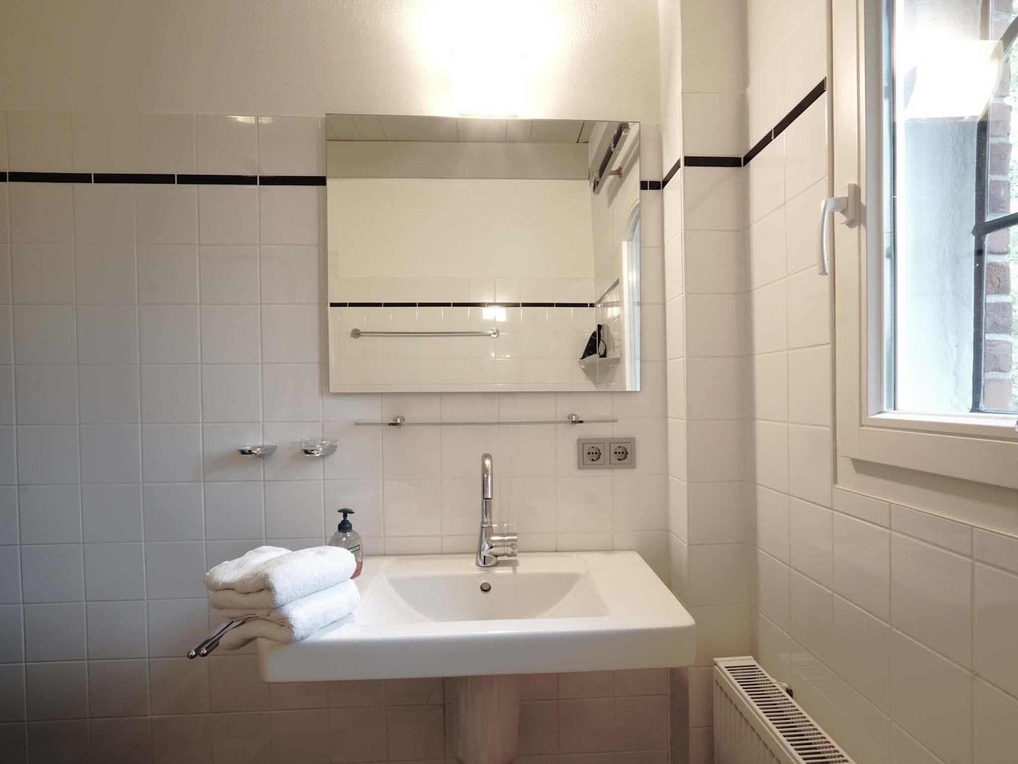 Die große, offene Küche hat einen geräumigen Frühstückstisch und alle wichtigen Geräte (großer Kühlschrank mit Gefrierfach, Herd mit Backofen, Geschirrspüler etc.). Mikrowelle, Kaffeevollautomat (DeLonghi) und Filterkaffee-Maschine, Wasserkocher und ein Toaster befinden sich in der historischen Herd-Nische. Der angrenzende Hauswirtschaftsraum beherbergt Waschmaschine und Trockner.