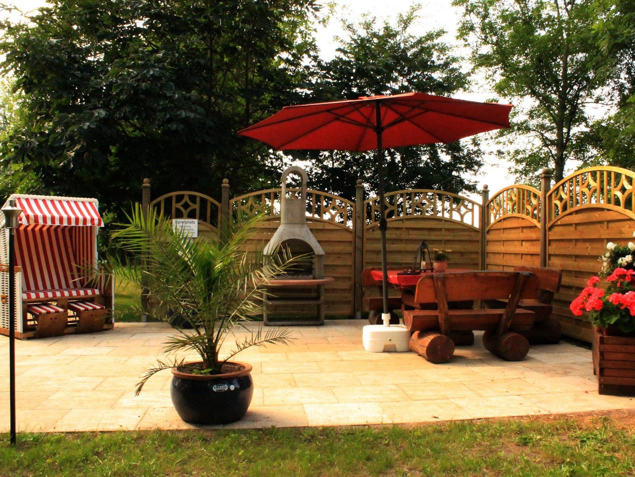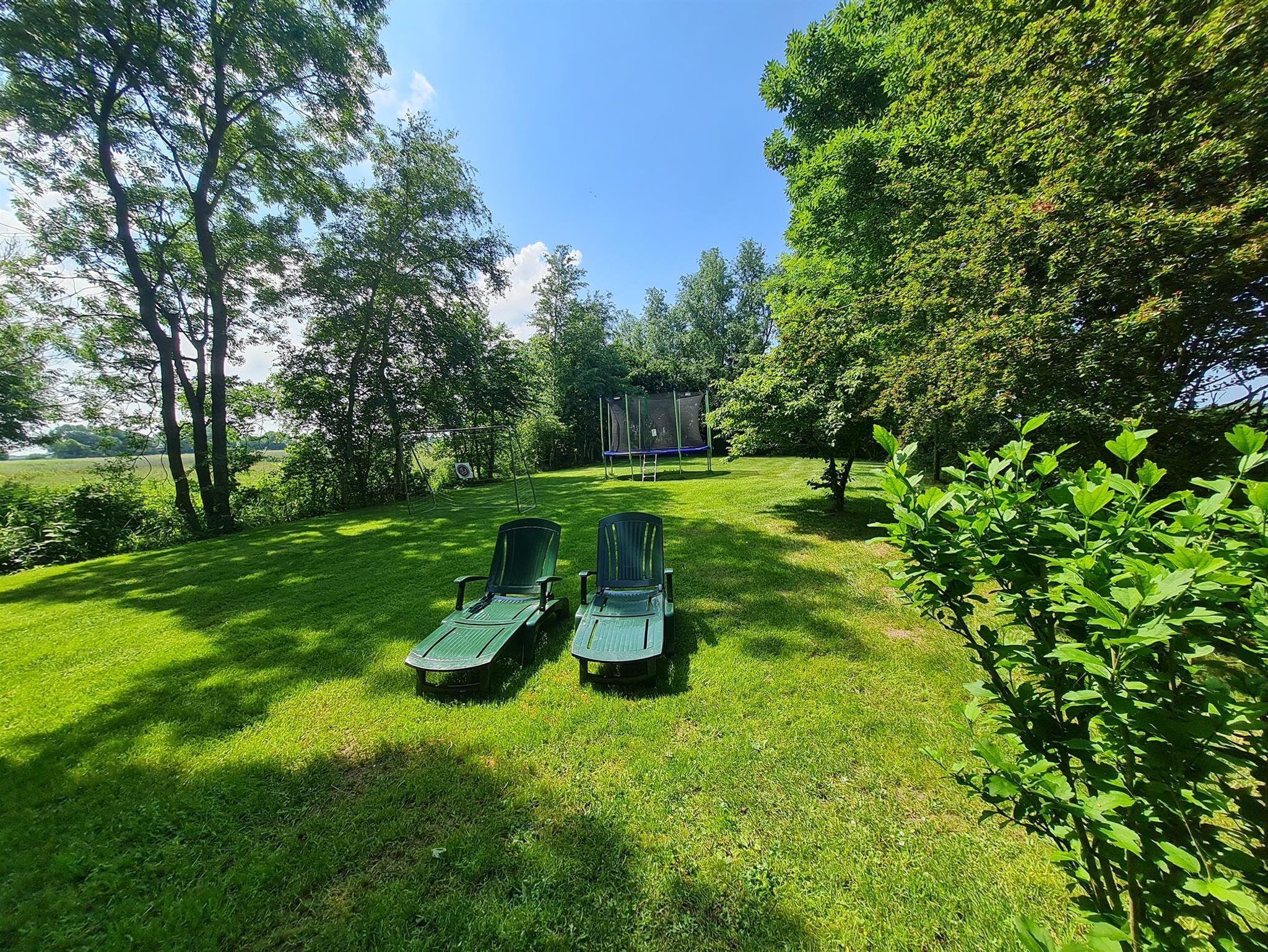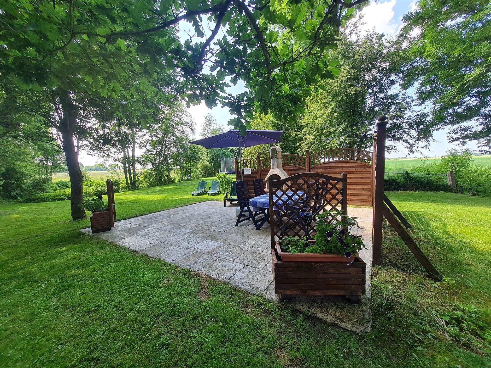 Eine Terassezum Grillen liegt direkt am Haus. Ein Spielplatz mit Trampolin und Fußballtor.