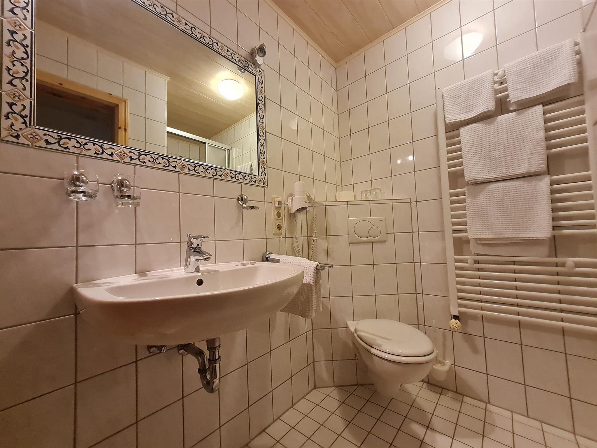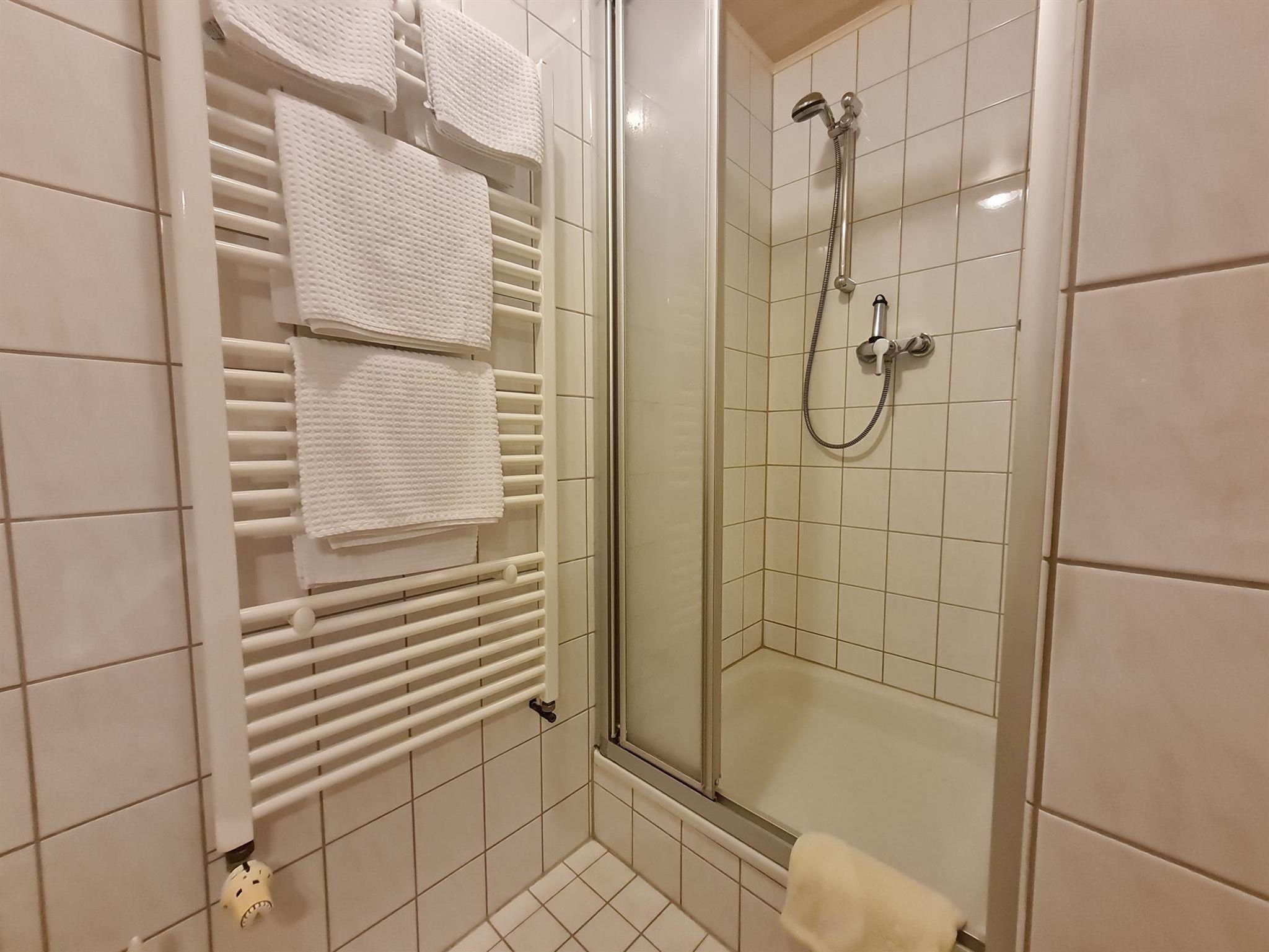 Das Badezimmer verfügt über eine Dusche/WC mit Fön & Kosmetikspiegel.