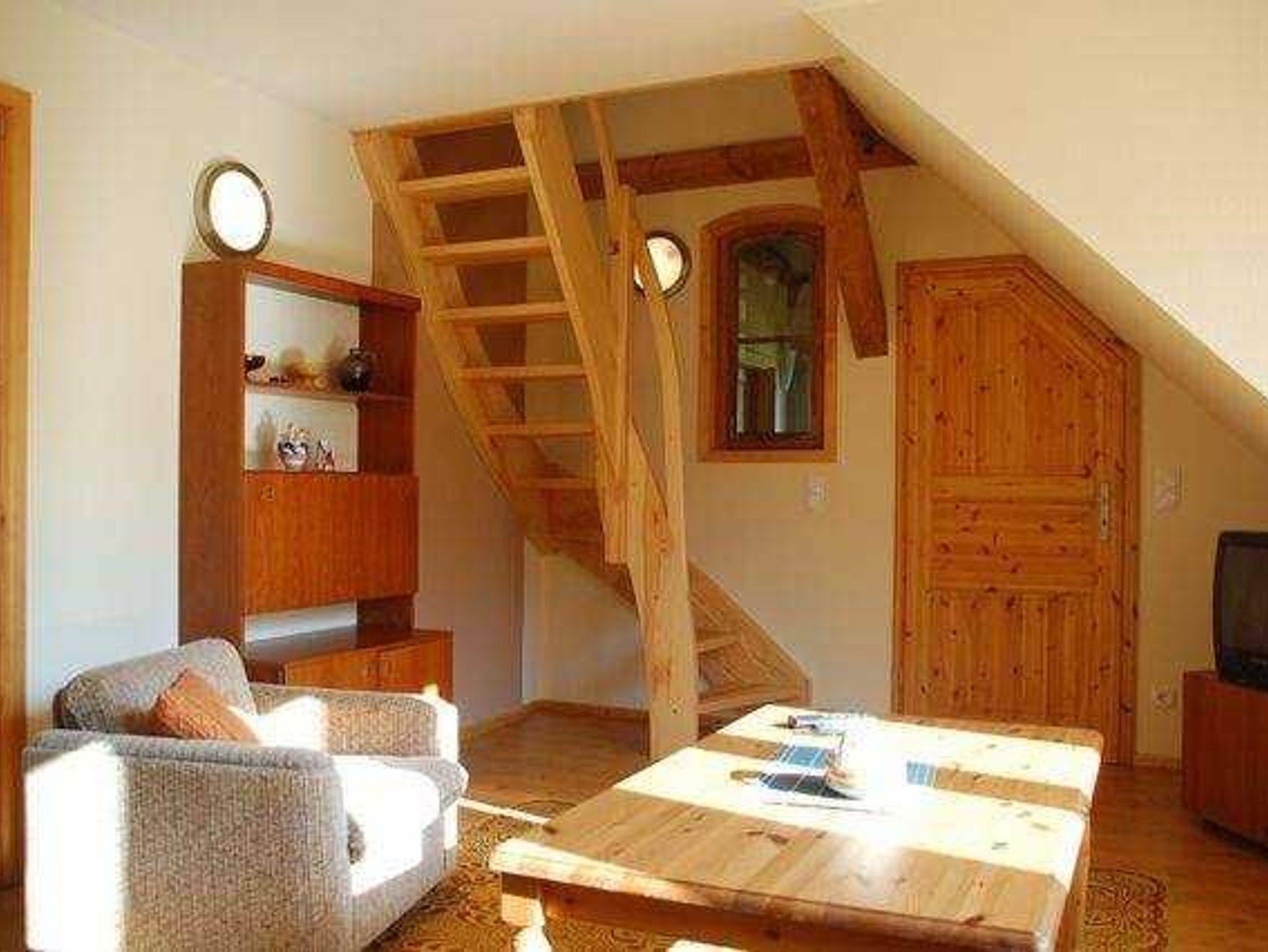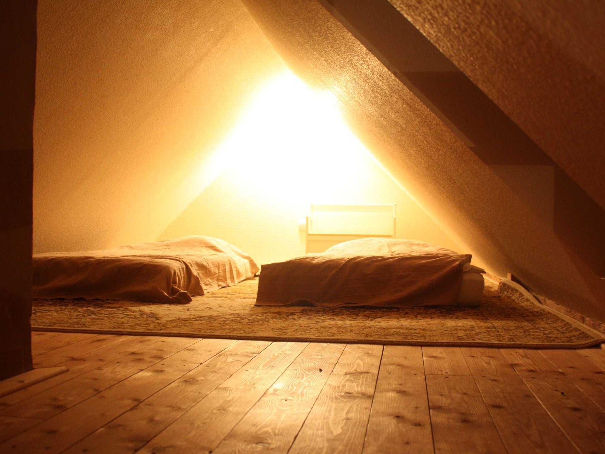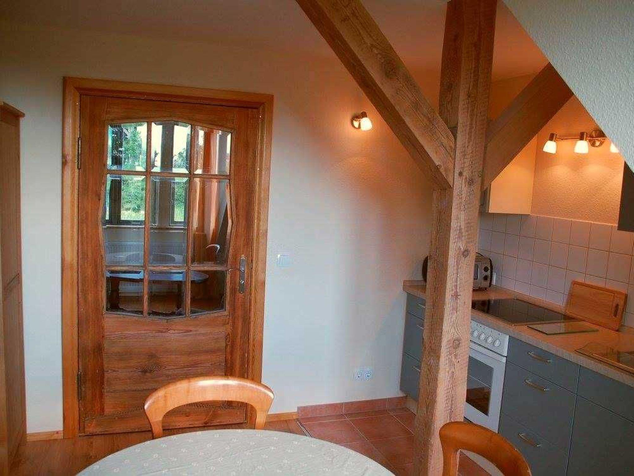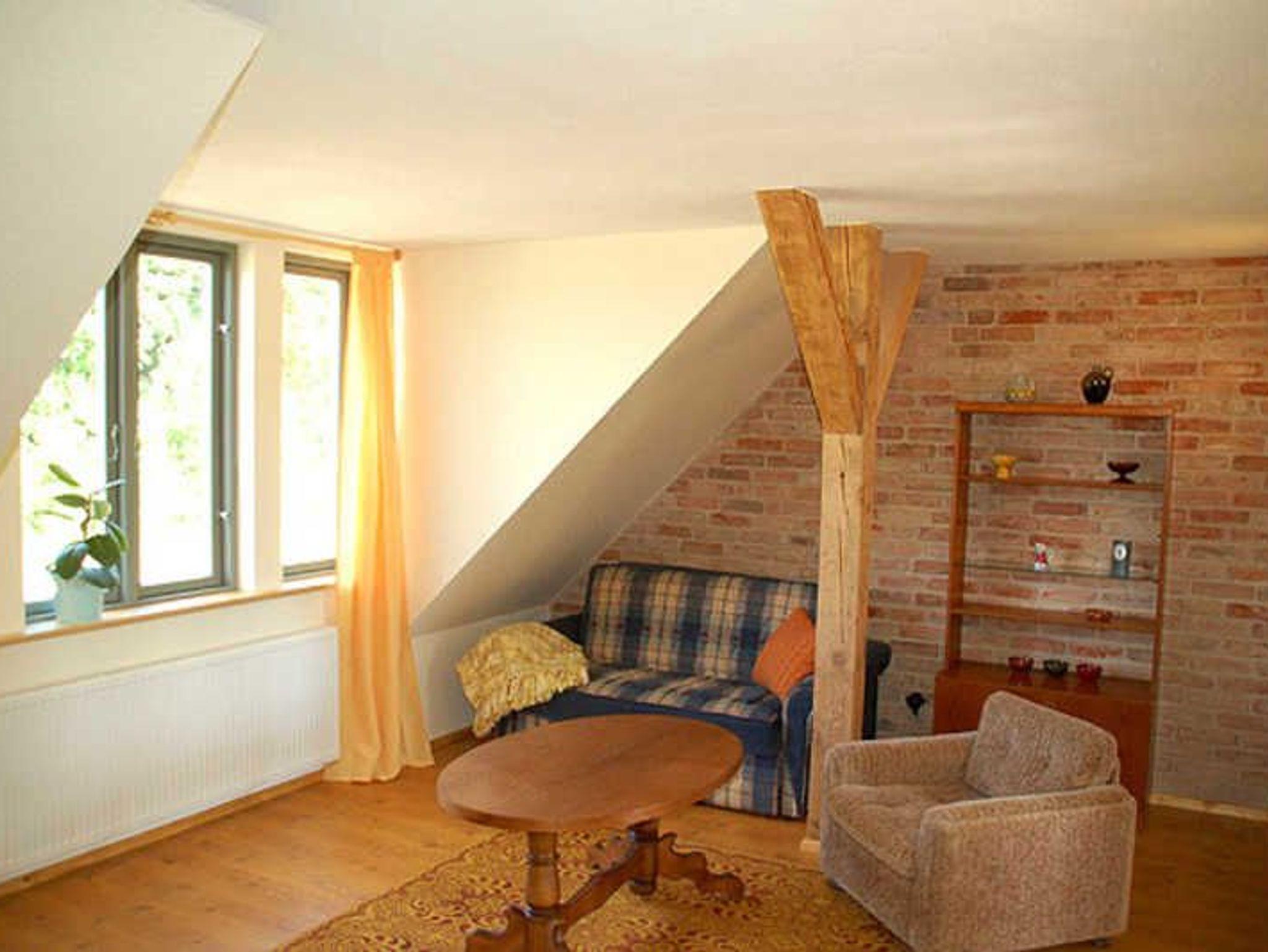 Die große Wohnung für bis zu 4 Personen liegt im Obergeschoss des Hauses. Balken & Schrägen verleihen ihr ein gemütliches Ambiente. So wohnen Sie: