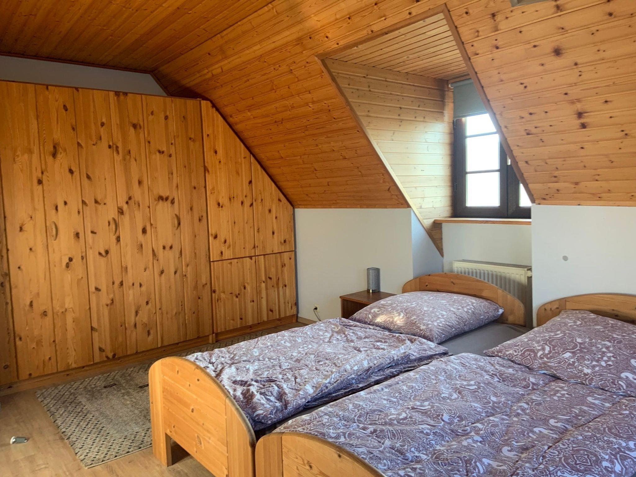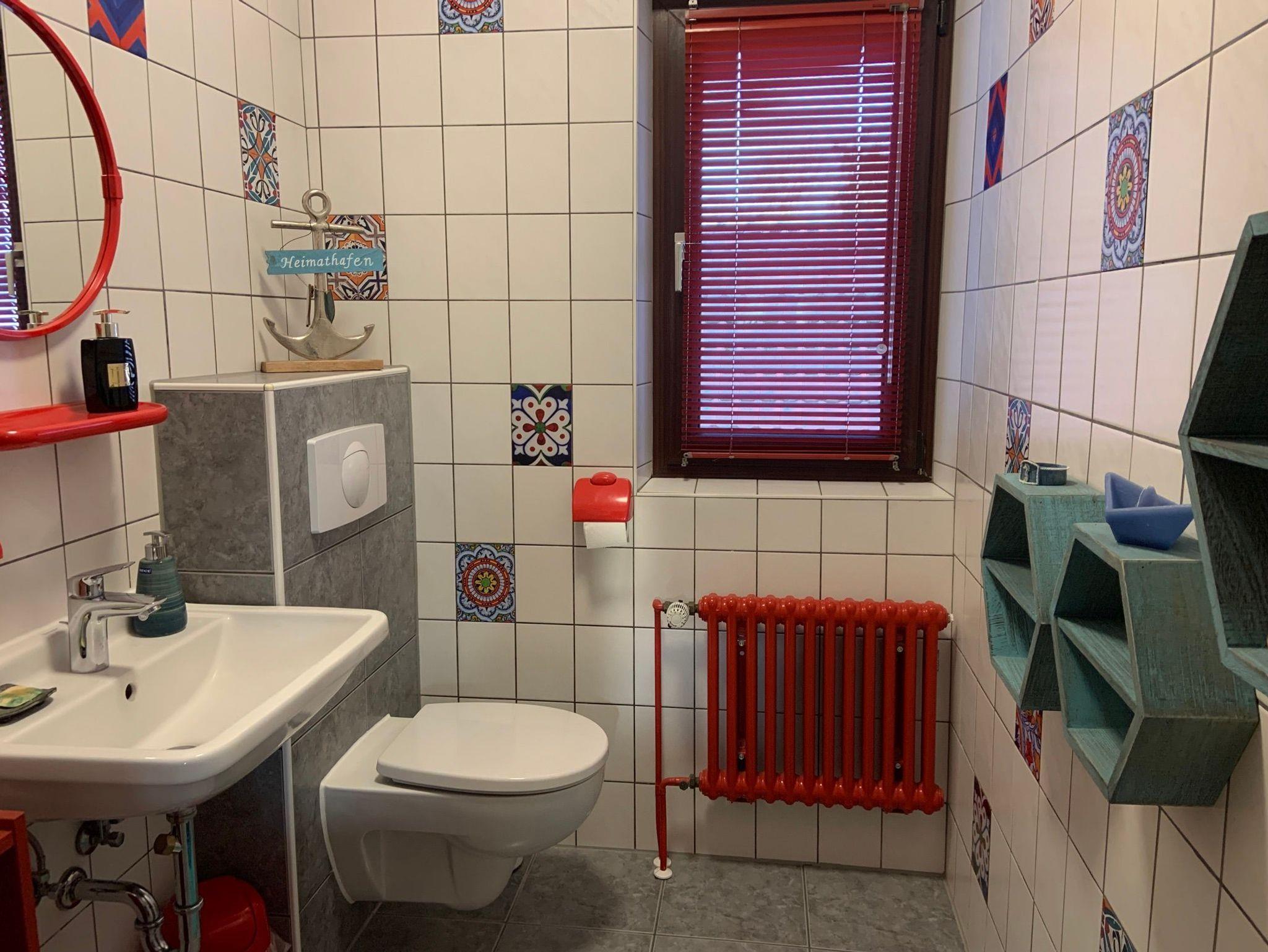 In der ersten Wohnetage befindet sich darüber hinaus ein Gästezimmer mit Dielenfußboden, ausgestattet mit einer Ausziehcouch mit Dauerschläfermatratze (Breite 140 cm). Auf dieser Etage gibt es ein Bad mit Badewanne und Dusche sowie ein separates WC.