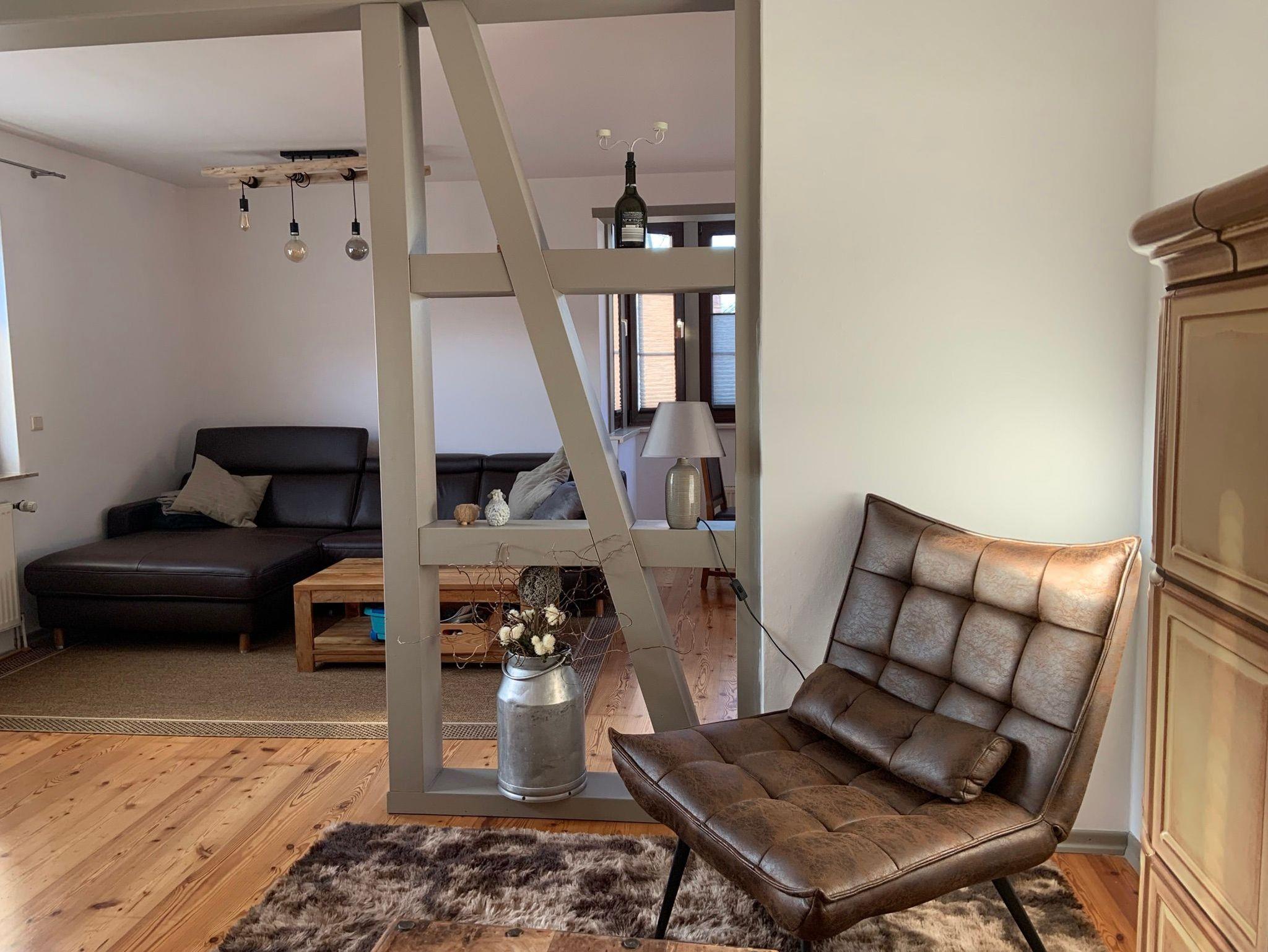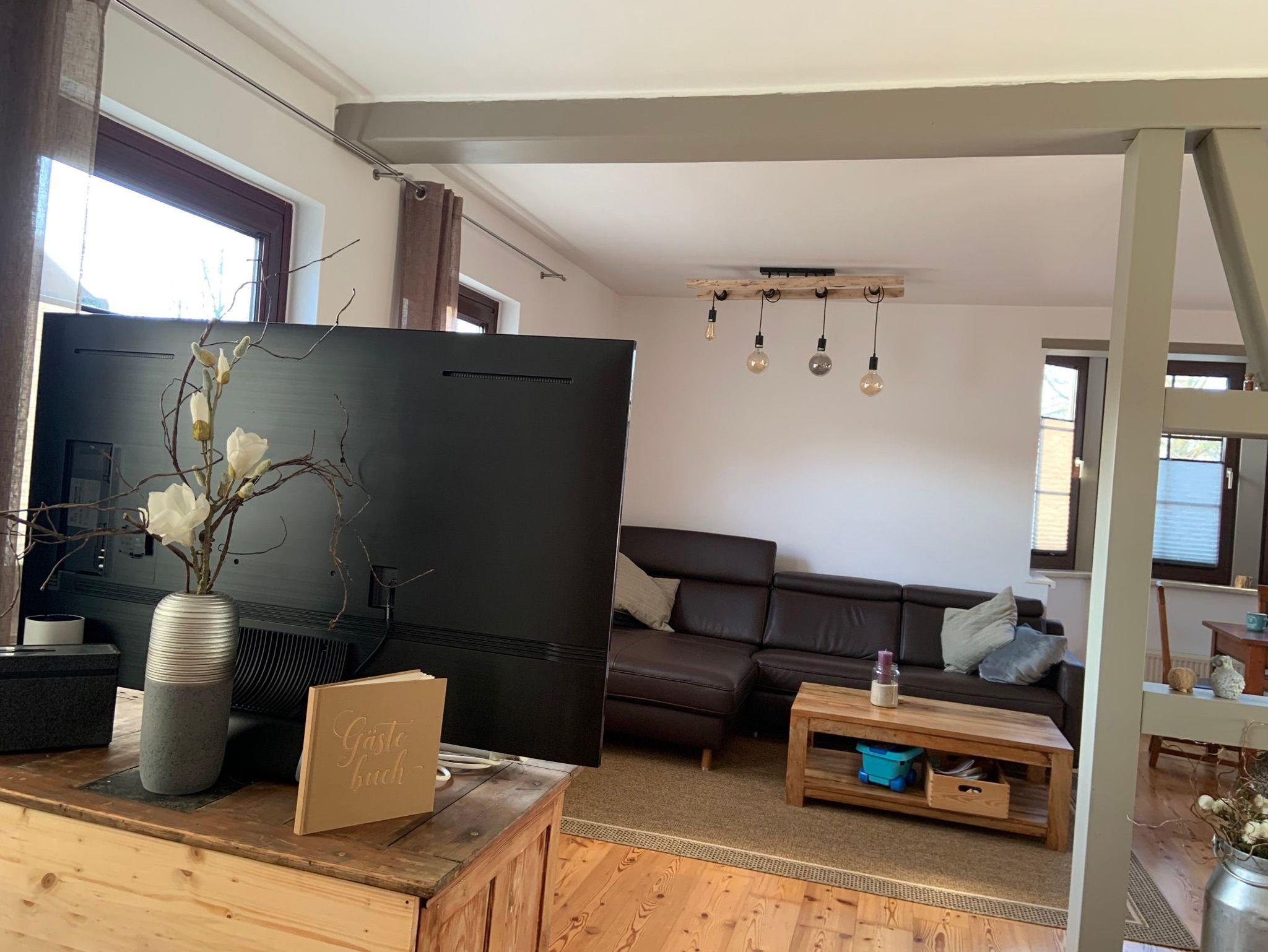 Das Ferienhaus verfügt insgesamt über drei Etagen. Im Erdgeschoss befindet sich der Eingangsbereich. Eine Treppe führt hinauf ins erste Obergeschoss. Hier erwartet die Gäste ein geräumiges Wohn-/Eßzimmer. Es bietet Ihnen eine gemütliche Ecke zum Verweilen am Kachelofen sowie eine geräumige Couch mit extrabreiter Ottomane. Ebenfalls ausgestattet ist das Zimmer mit einem Flachbild TV, schönen antiken Möbelstücken und einem Dielenfußboden. Am Esstisch ist ausreichend Platz für 6 Personen. Die Couch im Wohnzimmer bietet bei Bedarf einen zusätzlichen Schlafplatz (1,20 m breit).