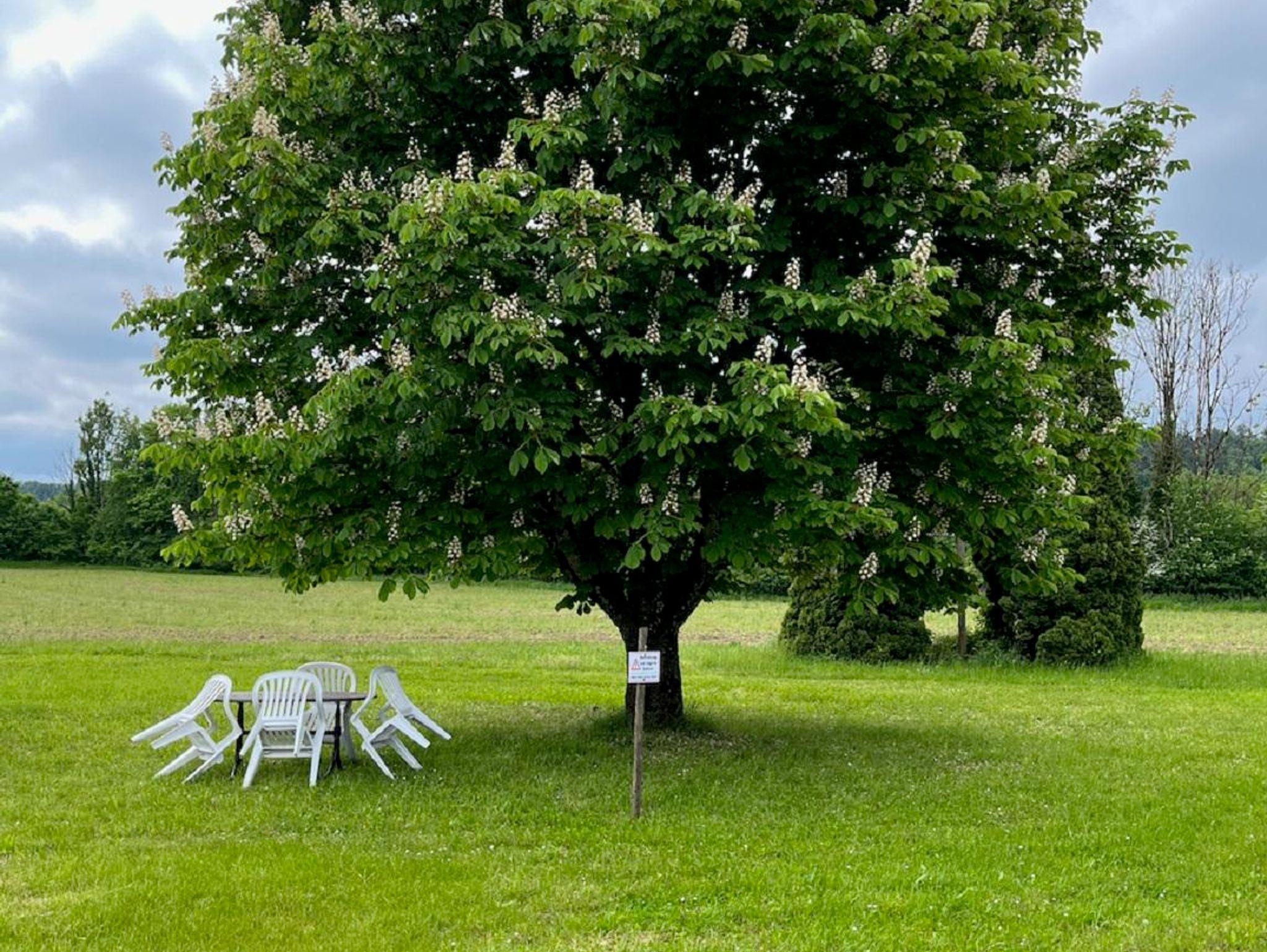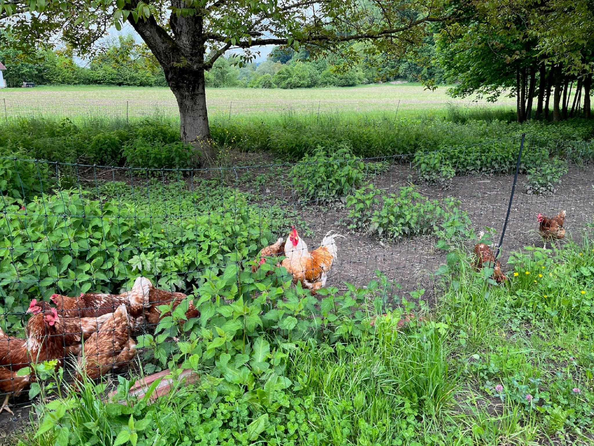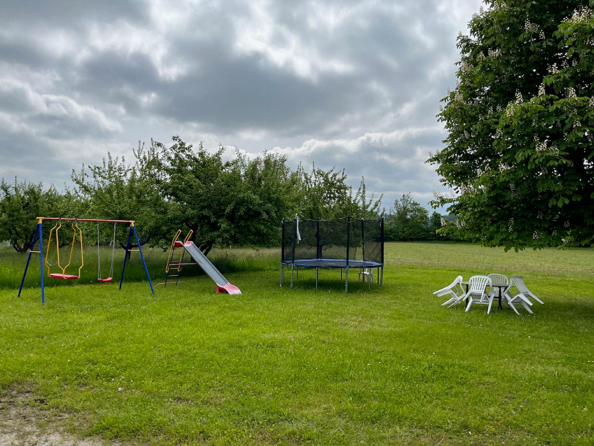 Im Freien erwartet Sie ein Sitzplatz auf der Wiese mit Spielgeräten für unsere kleinen Gäste, die sich bestimmt auch über Katze und Hühner freuen.