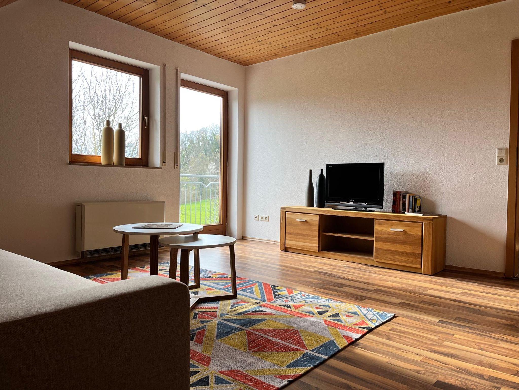 Die Wohnung mit ca. 70 qm bietet Platz für bis zu 4 Erwachsene oder 1 erwachsene Person und 3 Kinder. Sie verfügt über 1 Wohnzimmer, 1 Schlafzimmer, 1 großes Bad mit Wanne, eine gut ausgestattet Wohnküche und einen West-Balkon mit Blick ins Grüne.