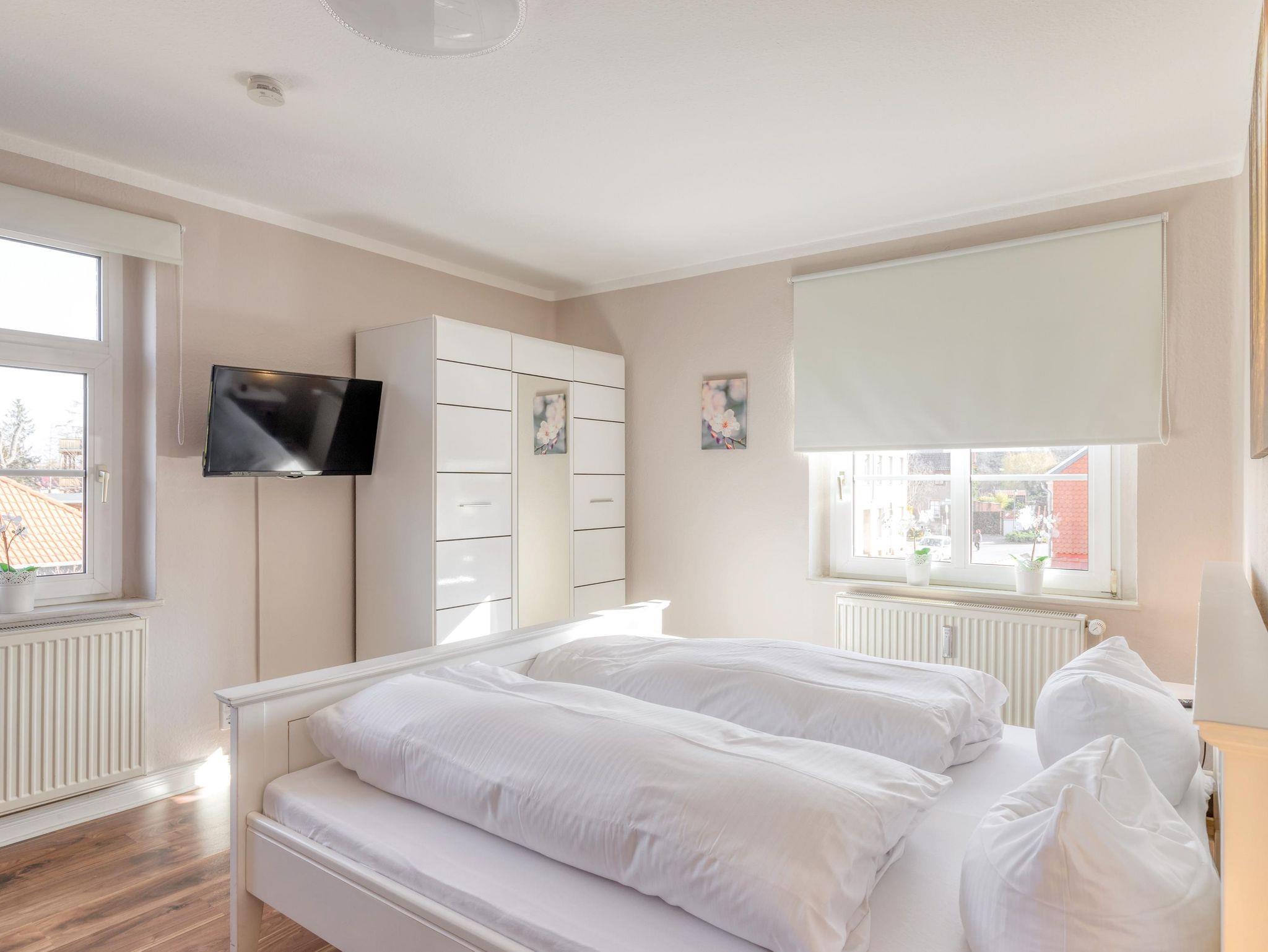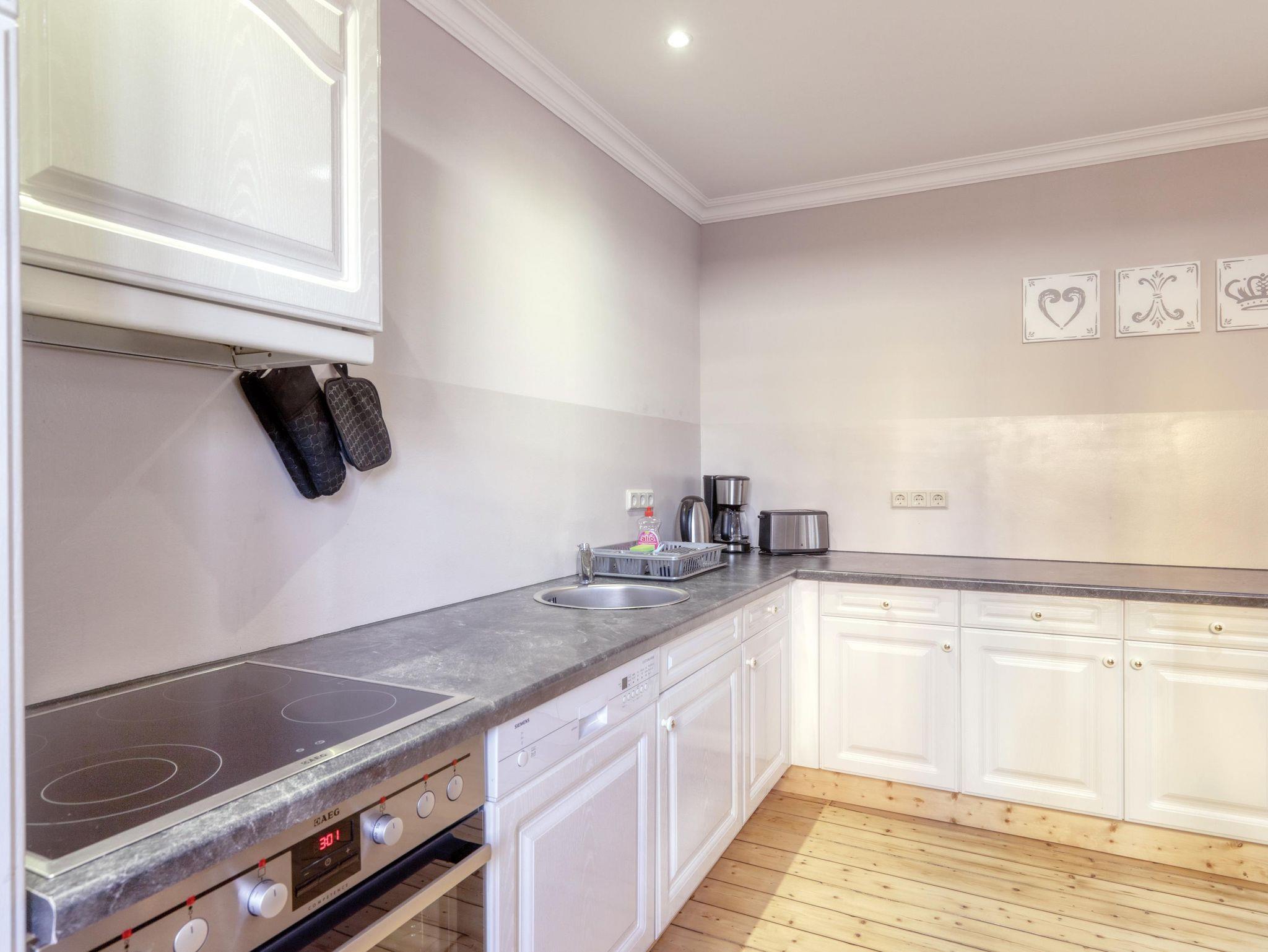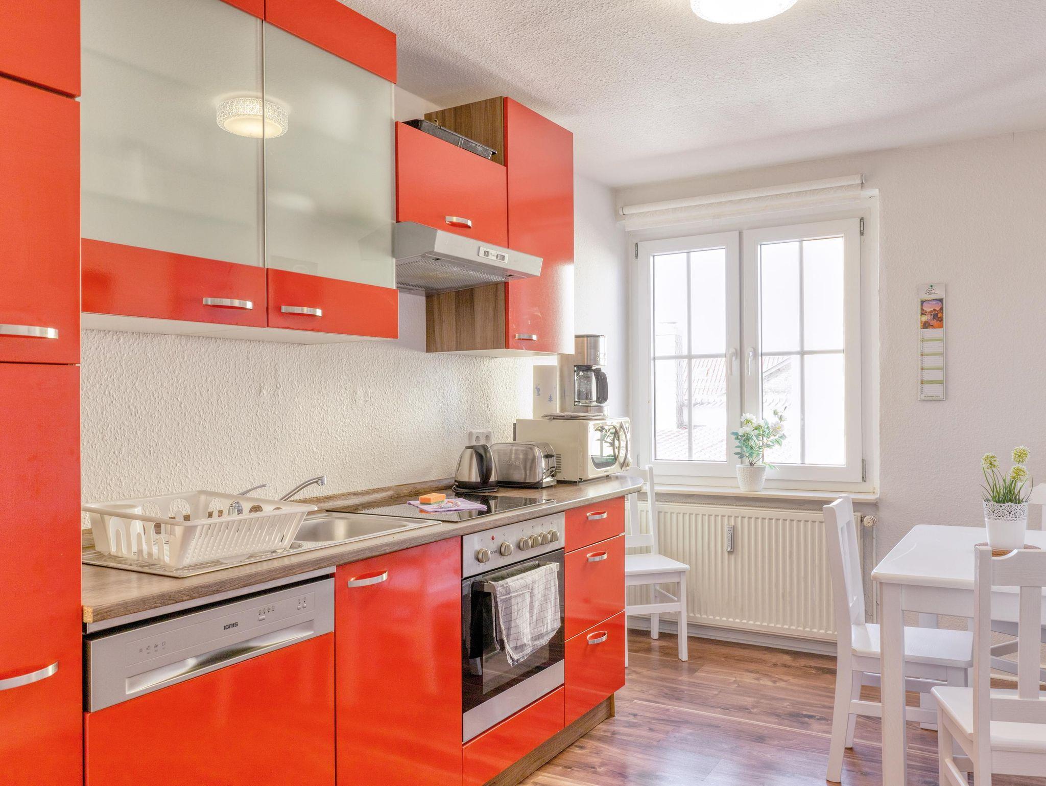 4 komfortabel eingerichtete Ferienwohnungen (zwei Wohnungen in der 1. Etage und eine Wohnung im Dachgeschoss). Mobiliar zum Wohlfühlen und kostenfreies WLAN! Die Wohnungen verfügen über Wohnzimmer mit gemütlicher Sitzecke (Aufbettung möglich) und SAT-TV. Schlafzimmer. Küche mit Geschirrspüler, Backofen, Mikrowelle, E-Herd mit Dunstabzugshaube, große Kühlgefrierkombination, Küchengeräte - Kaffeemaschine, Wasserkocher, Toaster. Anspruchsvolles Bad mit einer Dusche mit ebenerdigem Einstieg. Ansprechende Flurgestaltung. Hofbereich mit Freisitz und Gartenmöbel. Grill. Kostenfreie PKW-Stellplätze. Bei Bedarf Wäscheservice.