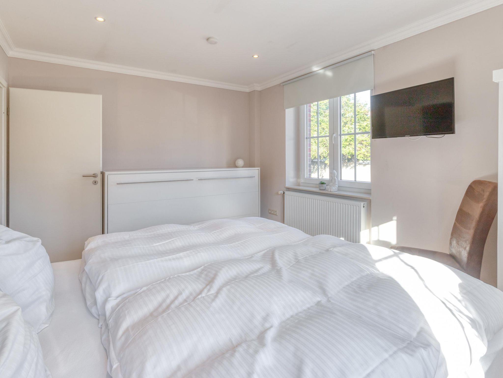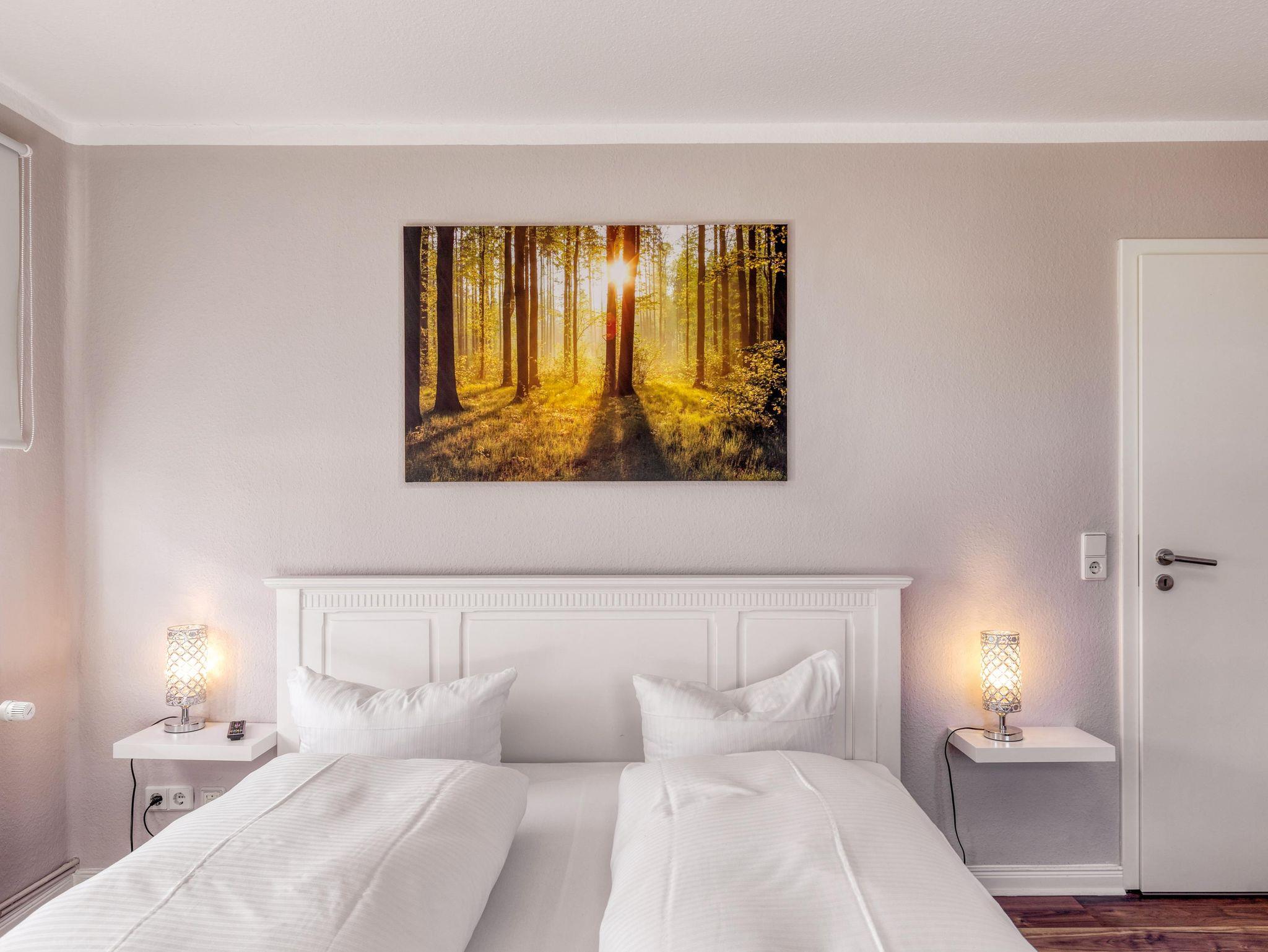 Schlafzimmer mit Doppelbett und Einzelbett (Wandklappbett). Seperate Küche/Einbauküche mit Geschirrspüler, Backofen, Mikrowelle, Kühlschrank, Kaffeemaschine, Toaster, Wasserkocher, Geschirr. Geräumiges Bad mit Dusche/WC. Bettwäsche und Handtücher in der Erstausstattung vorhanden. Endpreis inklusive Energie-/Wasserkosten und Endreinigung. Kostenfreier PKW-Stellplatz auf dem Grundstück. Bei Bedarf Wäsche-Service.