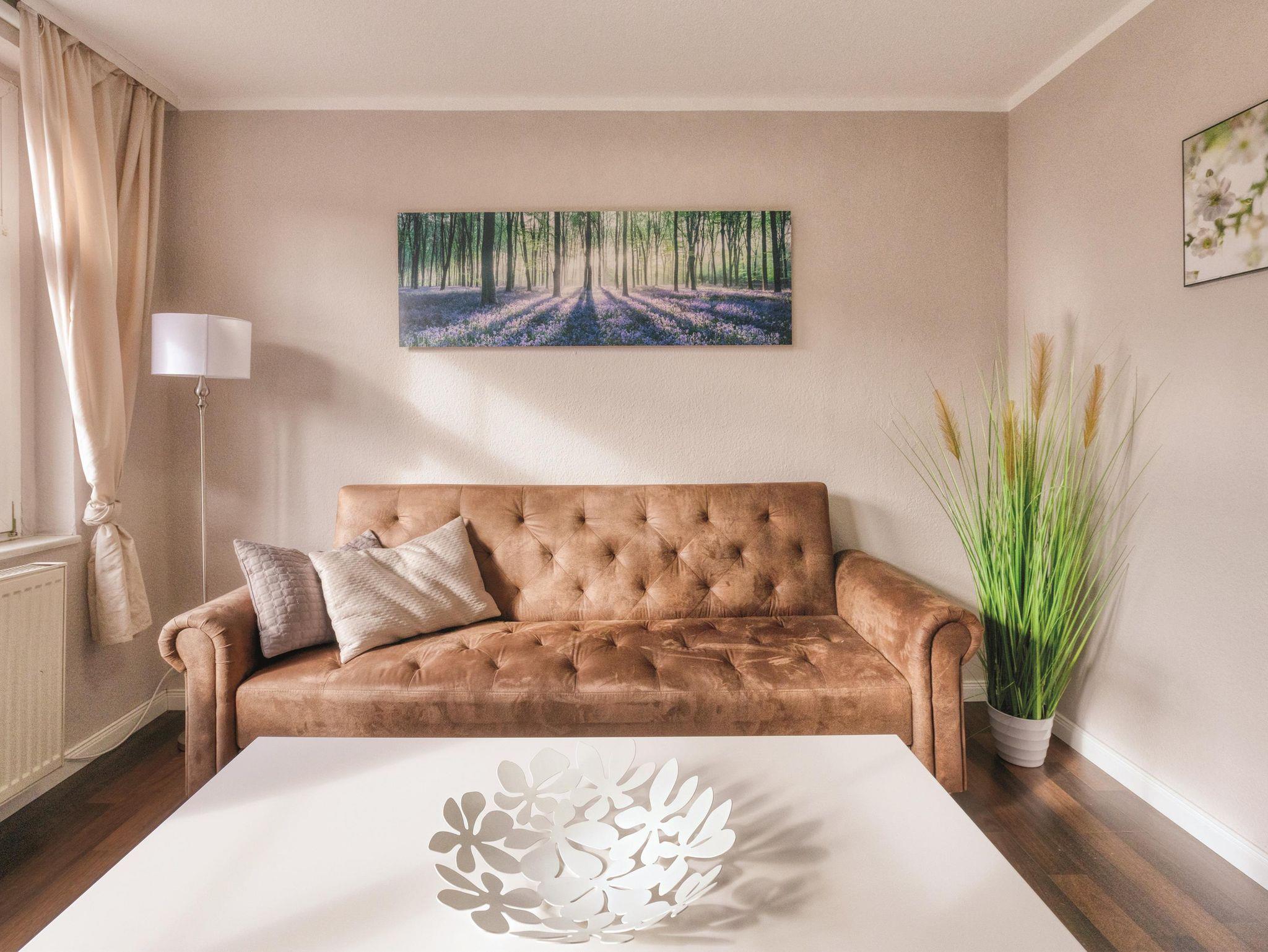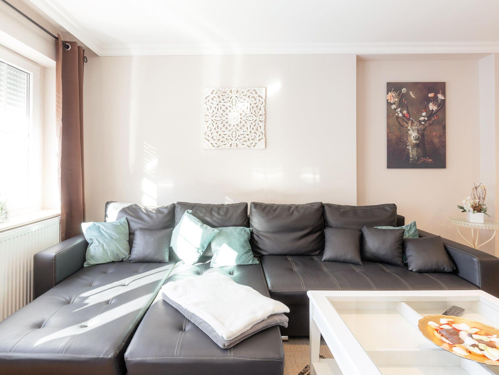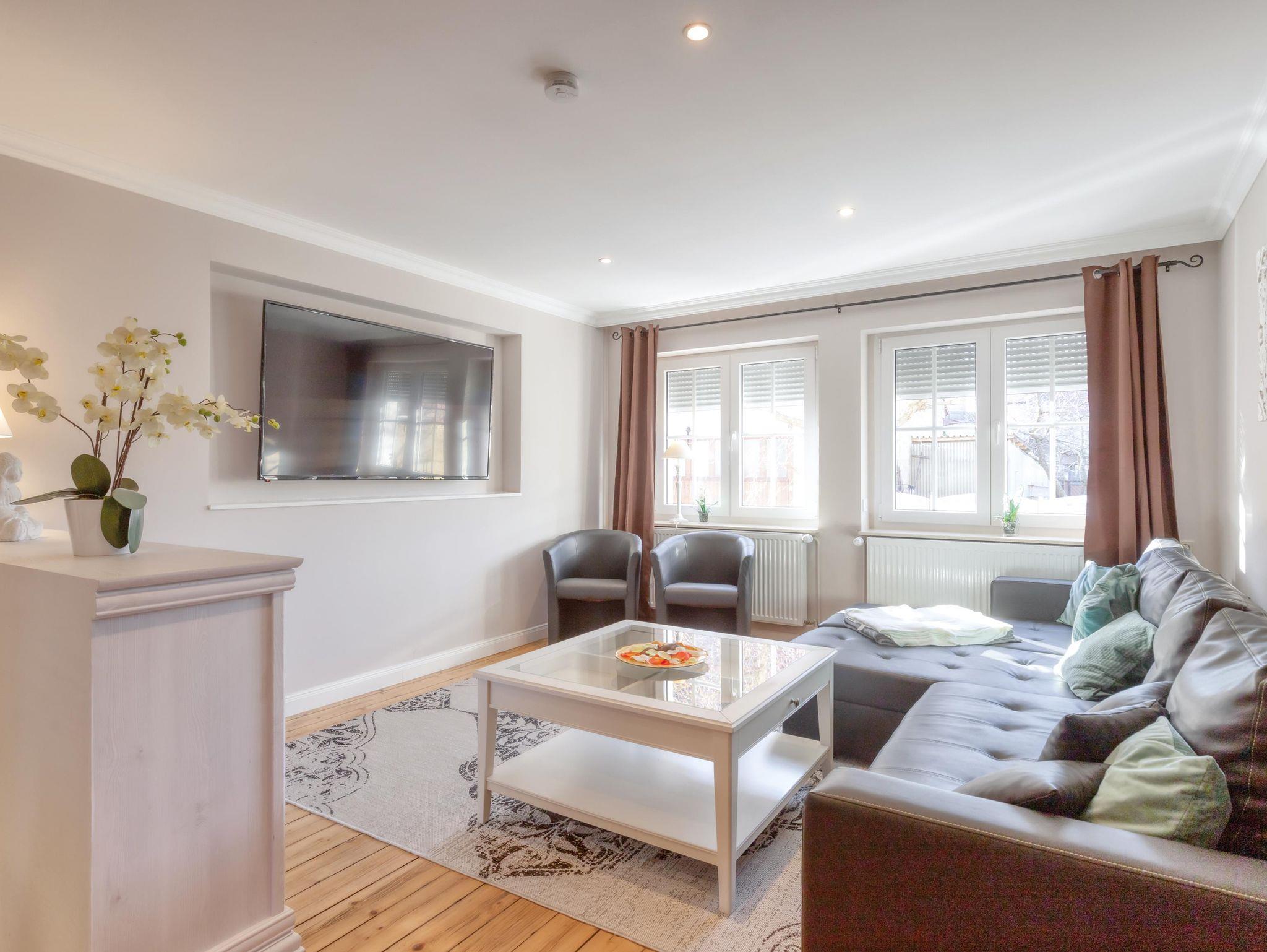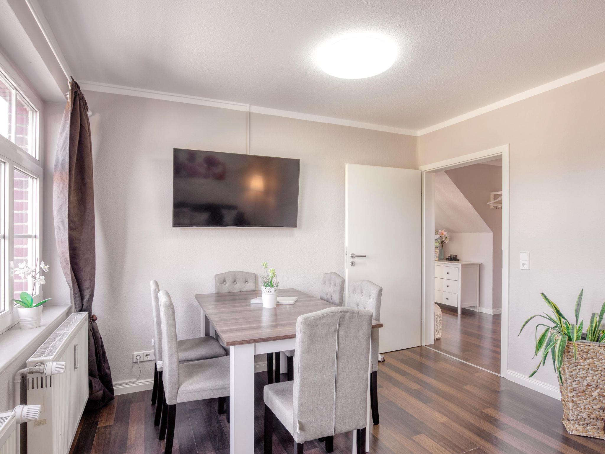 Großzügige Ferienwohnung in der 1. Etage, bis zu 5 Personen buchbar. Mobiliar zum Wohlfühlen und kostenfreies W-LAN! Wohnzimmer mit TV (Netflix), Schlafcouch (2 Aufbettungen möglich) und Essecke.