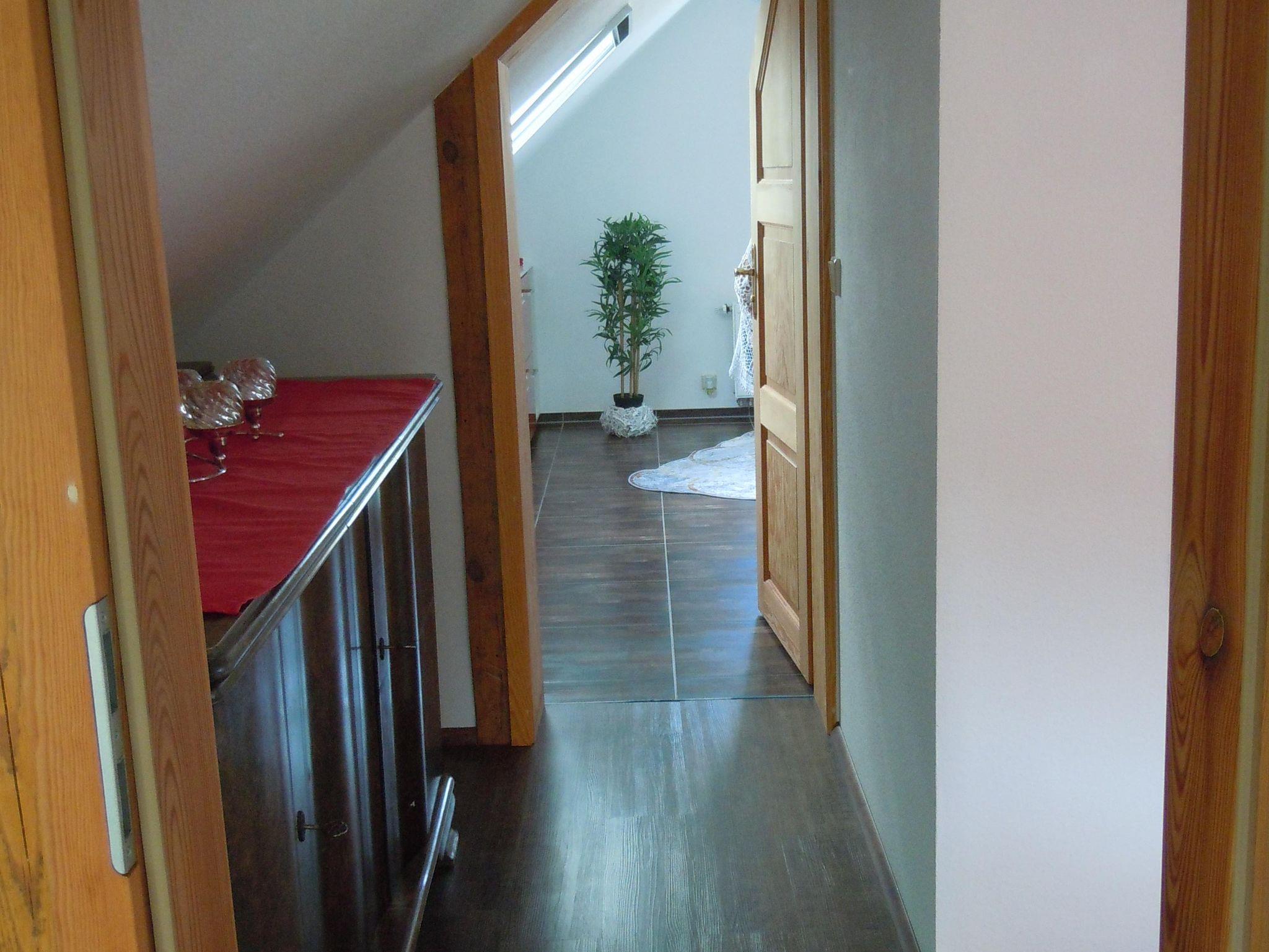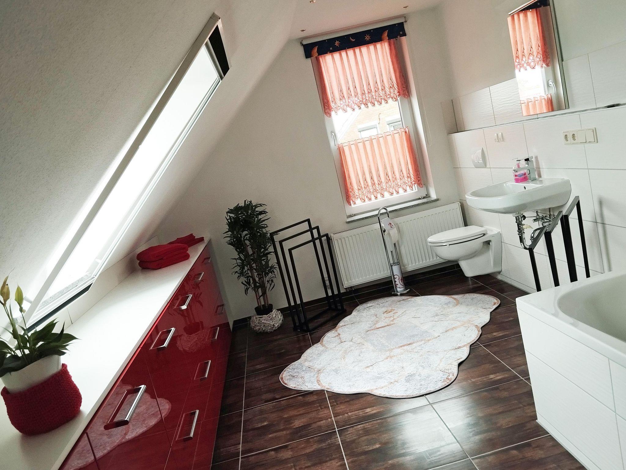 Die Ferienwohnung/Etagenwohnung befindet sich in der 1./2. Etage und bietet auf 78m² Wohnfläche Wohnzimmer mit TV, zwei getrennten Schlafzimmer mit Doppelbett. Eine Aufbettung für 2 weitere Personen im Wohnzimmer ist möglich. Bad mit Badewanne/ WC großzügig gestaltet. Küche/Einbauküche mit E-Herd/Ceranfeld, Kühlschrank, Mikrowelle, Toaster, Wasserkocher, Kaffeemaschine.