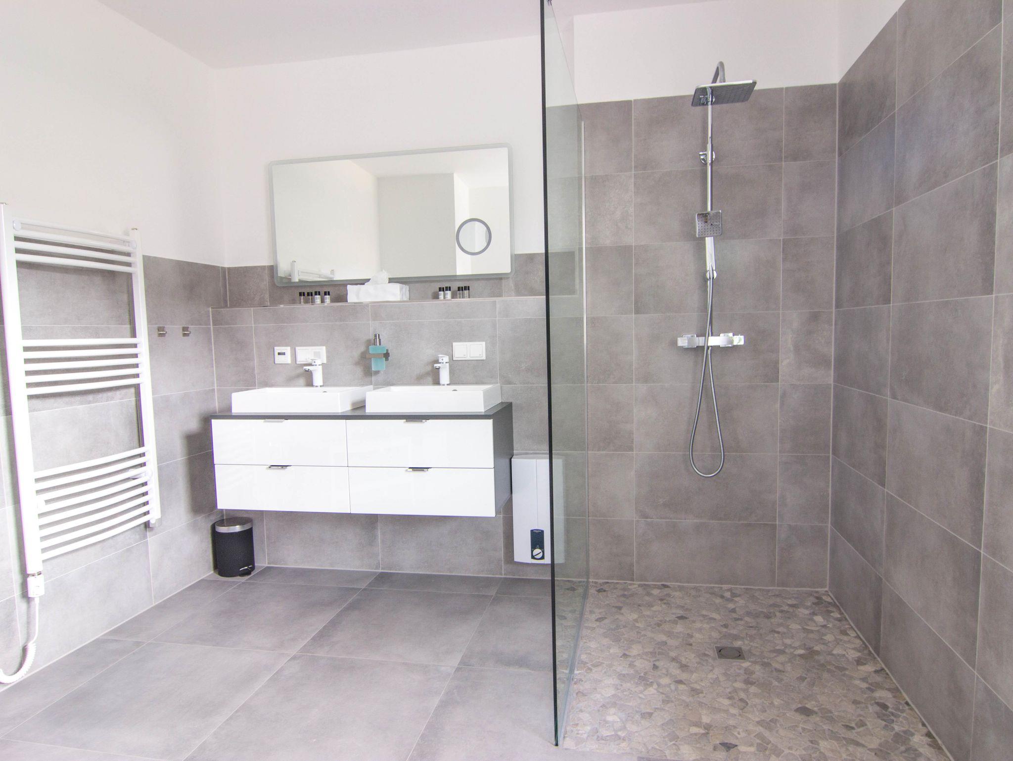 • Badezimmer mit ebenerdiger Dusche, Doppelwaschbecken, Fön, Handtuchheizung und erste Pflegeprodukte