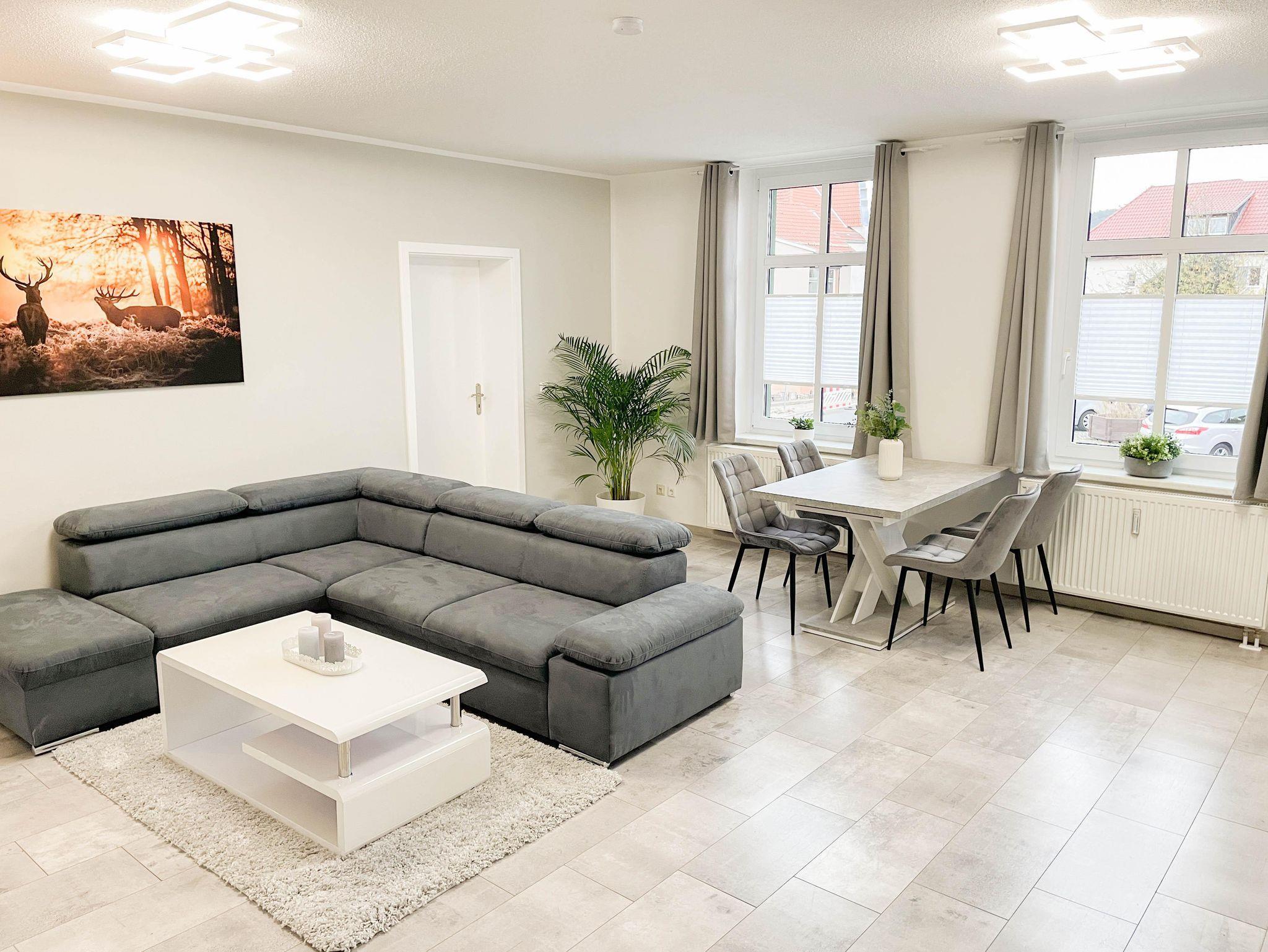 Die Ende 2023 fertiggestellte Ferienwohnung ist modern und komfortabel eingerichtet. Die Wohnung befindet sich im Erdgeschoss eines Mehrfamilienhauses, im Zentrum von Thale, und ist optimal für 1-4 Personen. Die 69 qm große Ferienwohnung besitzt eine komplett ausgestattete Wohnküche mit Geschirrspüler, Filterkaffeemaschine, Wasserkocher, Toaster, Ceranfeld, Backofen, Kühlschrank mit Gefrierfach und Mikrowelle. Der Wohnbereich ist mit einer Eckcouch und einem Smart-TV ausgestattet. Das Schlafzimmer hat ein Doppelbett (180 x 200), ein Tagesbett (80 x 200 - welches zum Doppelbett ausgezogen werden kann), einen TV und einen großen Kleiderschrank. Das Badezimmer ist mit Dusche,WC,Waschbecken und Fön ausgestattet.