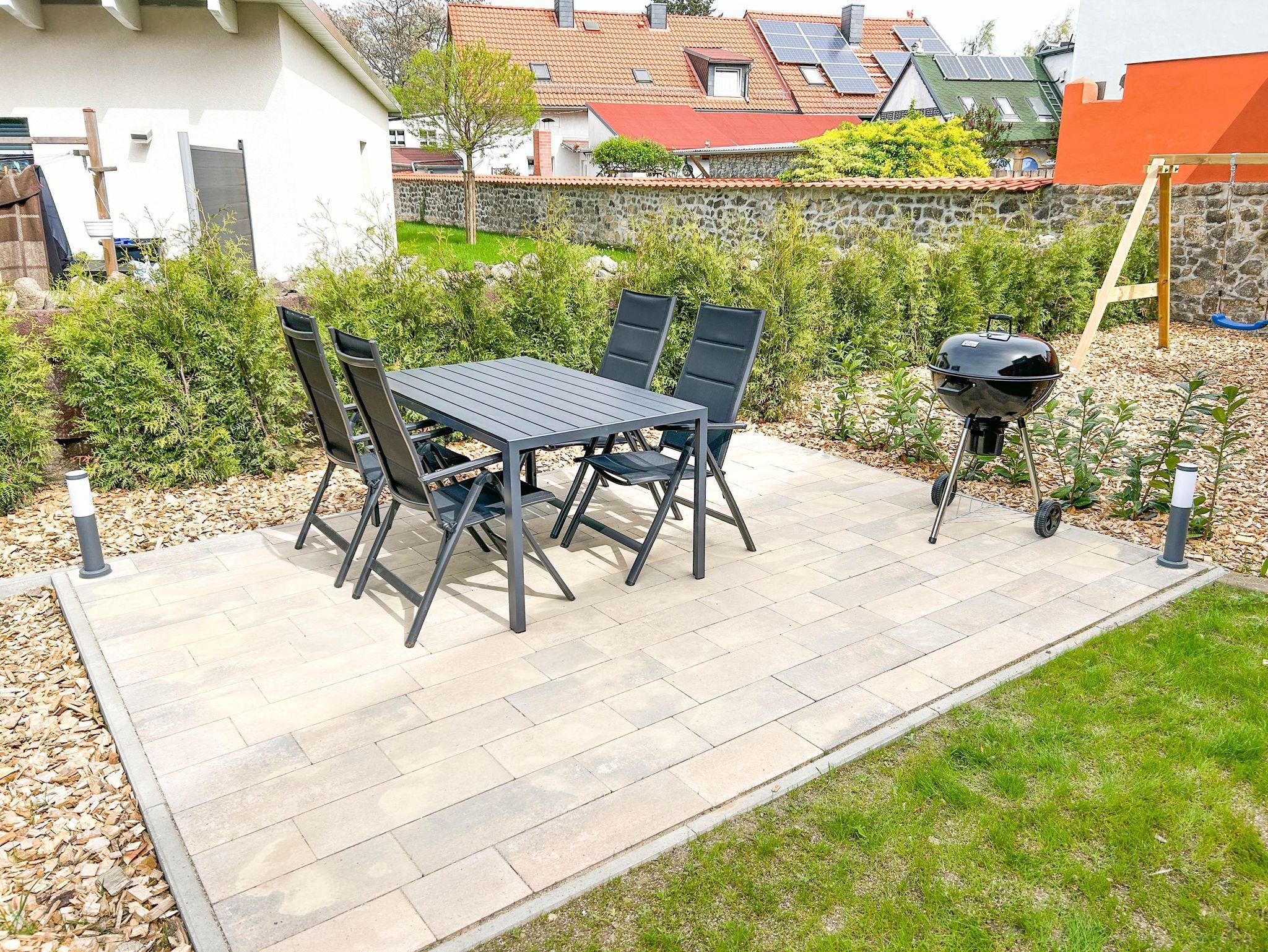Der Garten bietet Ihnen eine Terrasse mit Sitzgruppe, Grillmöglichkeit und Spielplatz für die kleinen Gäste.