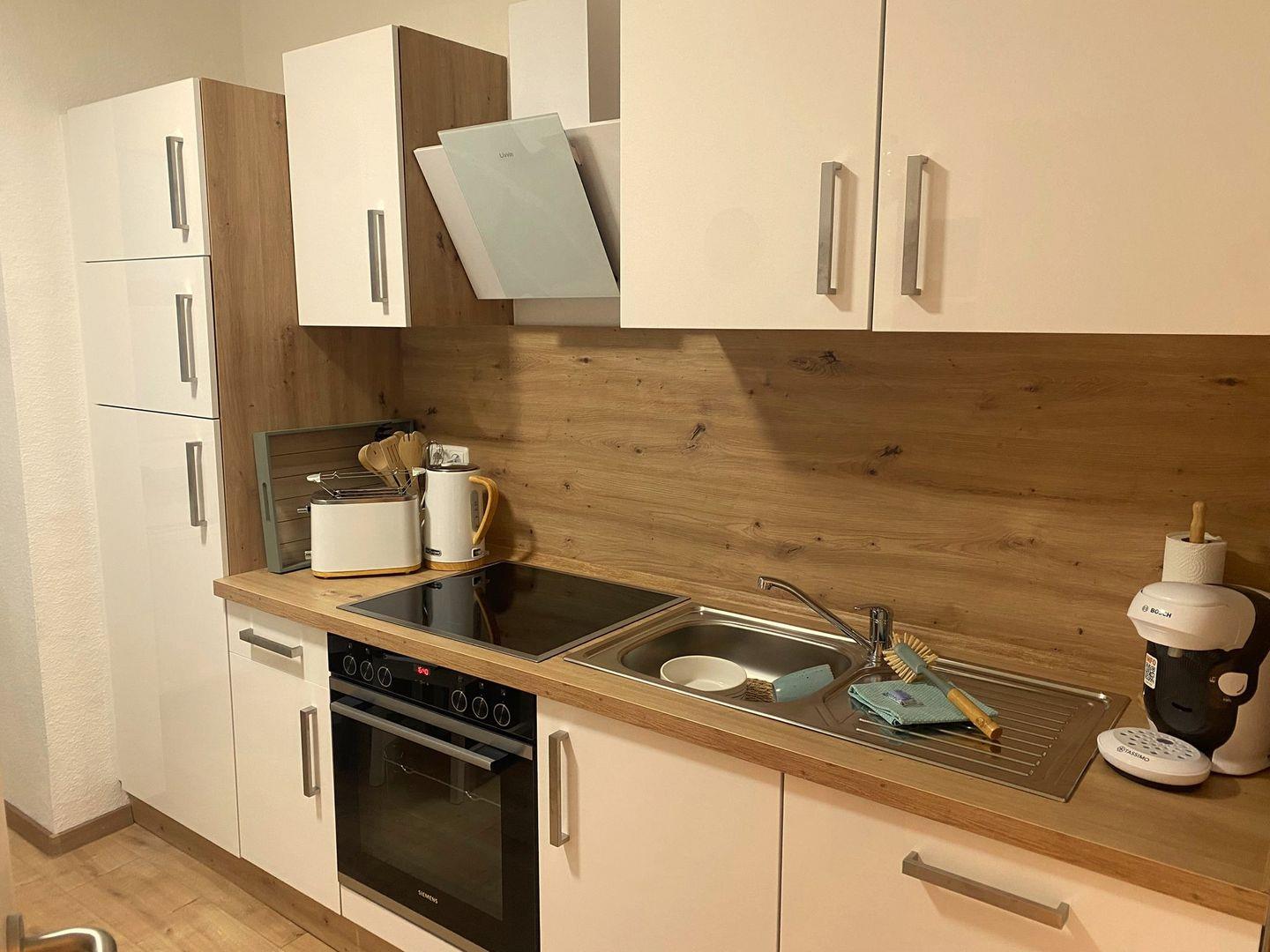 Die voll ausgestattete und helle Wohnküche mit Cerankochfeld, Backofen, Geschirrspüler und Essplatz lässt keine Hobbykoch-Wünsche offen. Ihren Kaffee können Sie „klassisch“ per Filter- oder spontan mit der Tassimo-Maschine zubereiten.