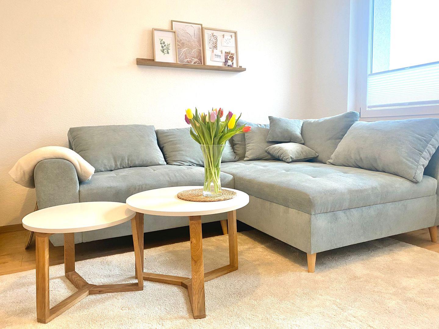 Das Wohnzimmer hält zum Entspannen nach Wanderungen und anderen Unternehmungen im Harz ein gemütliches Sofa, Schaukelstuhl sowie eine Wohnwand mit Smart-TV, DVD-Player und kostenfreies WLAN für Sie bereit. Das Sofa kann bei Bedarf für ein Kind zusätzlich aufgebettet werden