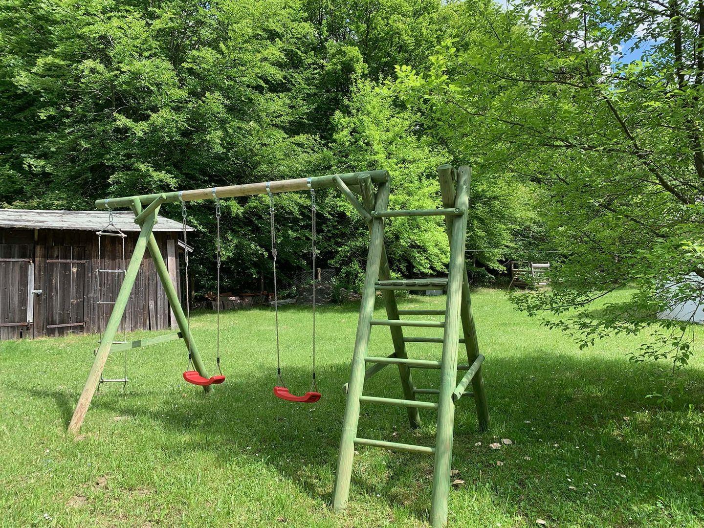 Das eingezäunte Grundstück liegt mitten im Wald, fernab von Durchgangsstraßen. Hier hört man statt Straßenlärm nur Vogelstimmen und das Rauschen der Bäume. Der große Garten mit Grillbereich, Spielplatz und Sitzgelegenheiten steht euch komplett zur Verfügung – perfekt für gemeinsame Abende oder entspannte Lesestunden im Grünen.