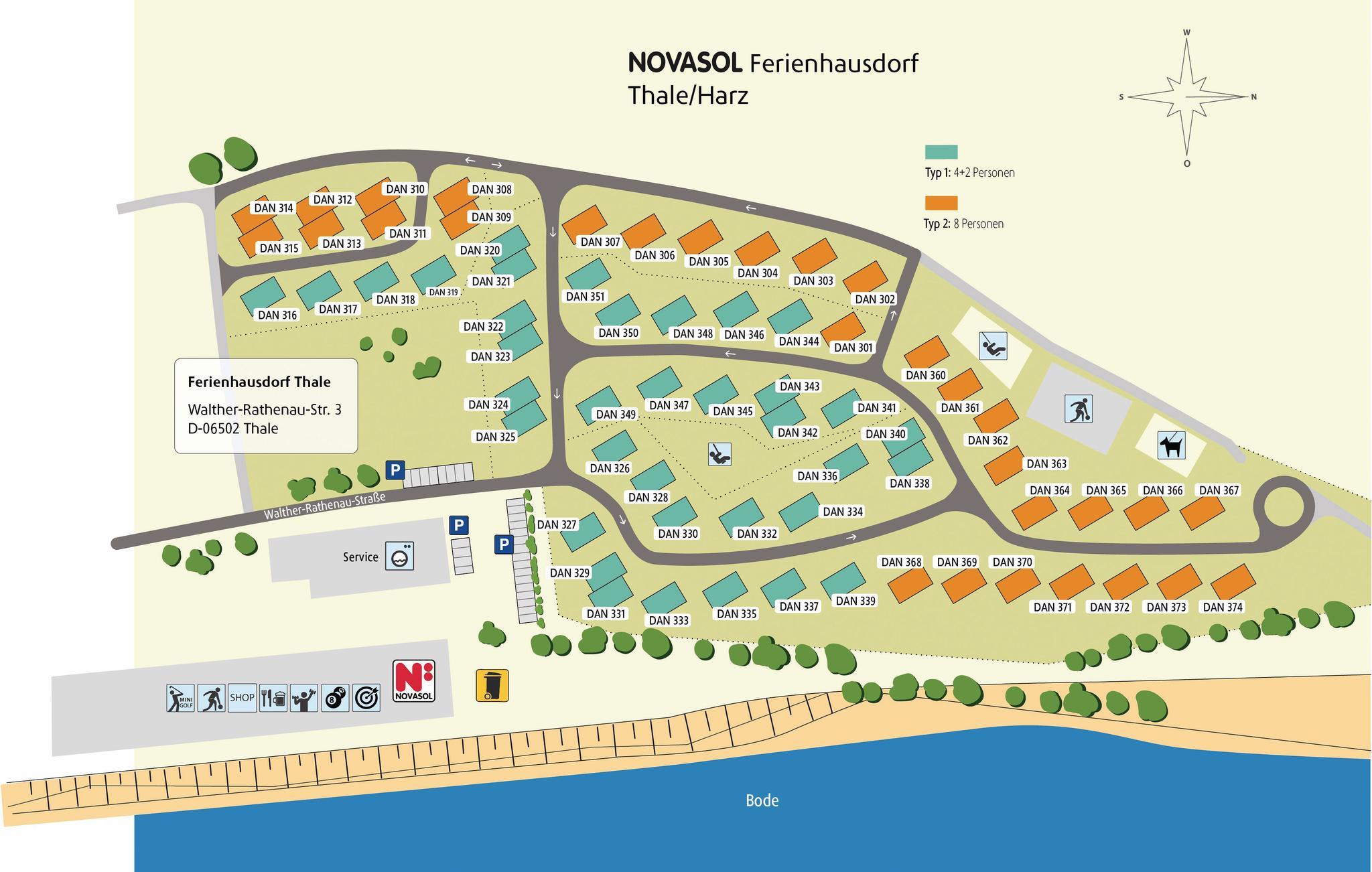 I kan også gå til klatreparken og svævebanen, der fører jer op til Rosstrappe. Her er udendørs minigolfbane, bob-rutsjebane og et berømt anlæg til monuntainbikere, der kan lide, at det går hurtigt nedad. I feriehusbyen er der mange former for bekvemmeligheder (mod betaling): en restaurant, et indendørs fritidsområde med fodboldbord, dart og sportsbare, bowlingbane og en eventyr minigolfbane, der sikrer, I aldrig kommer til at kede jer.