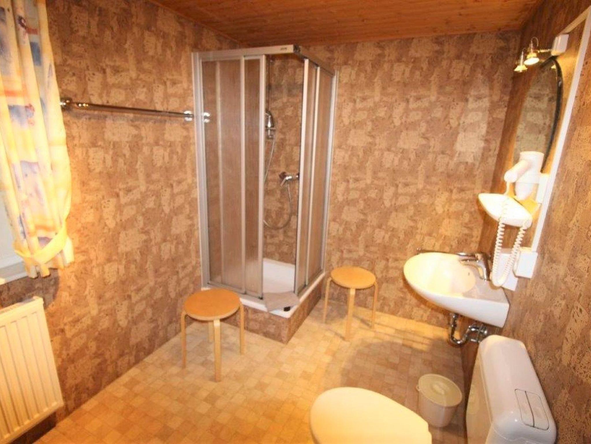 Beide Bäder sind ausgestattet mit WC, Waschbecken, Dusche, Spiegel, Fön, Handtuchhalter, Wandschrank, Hocker, Schmutzwäschebehälter.