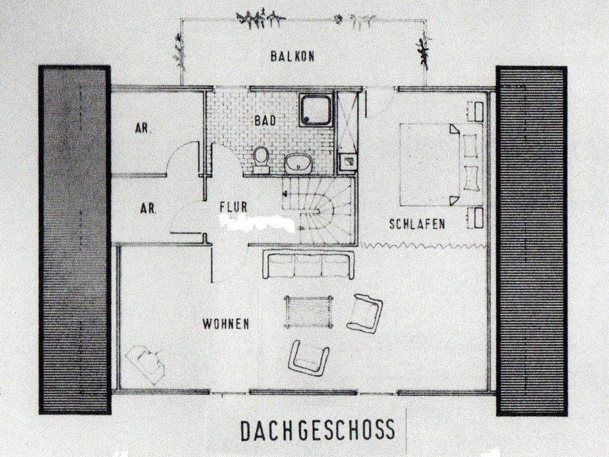 Im Obergeschoß ist ein Schafzimmer mit 1 Doppelbett eingerichtet und verfügt über einen Ausgang auf den überdachten Balkon.