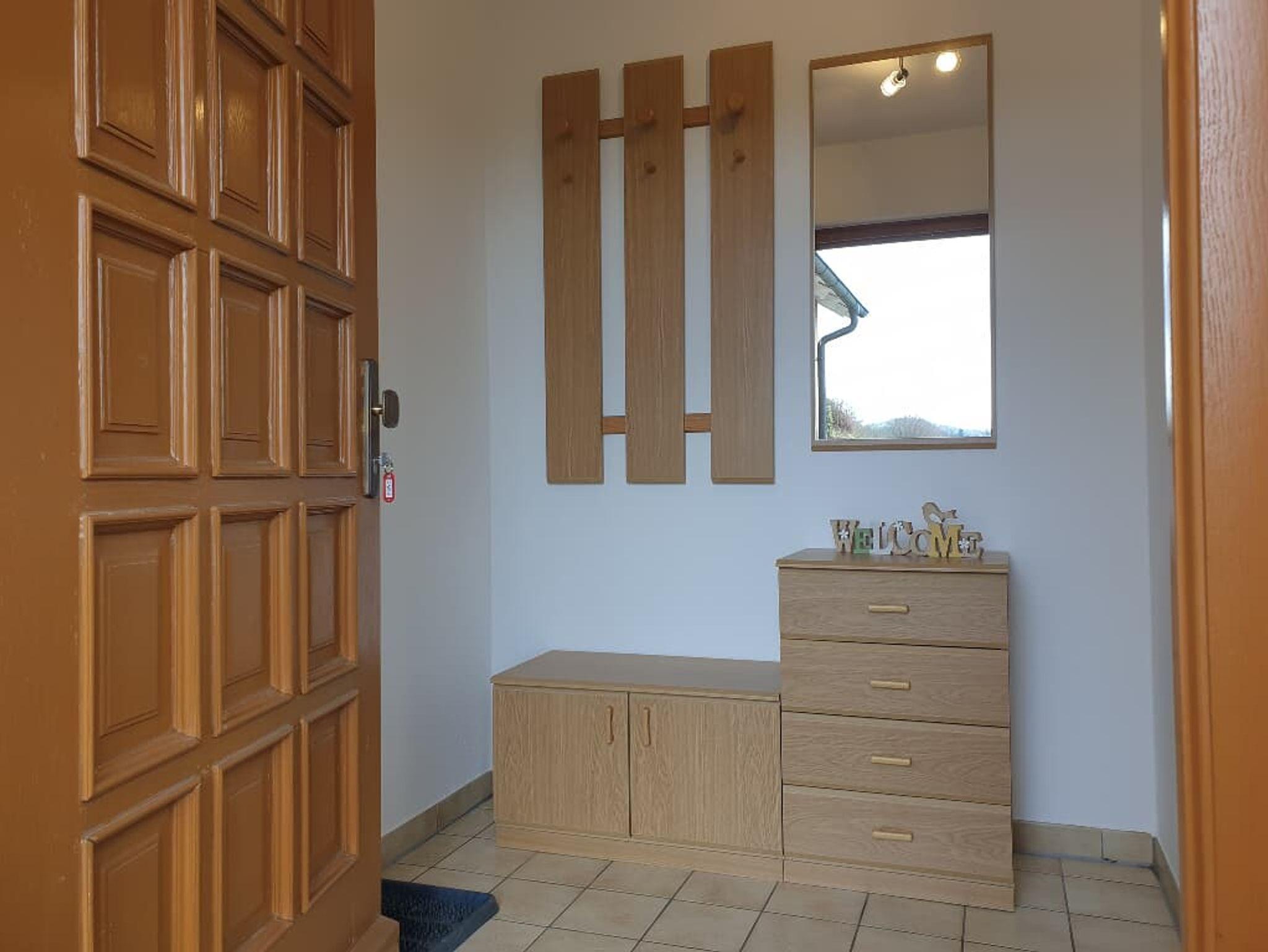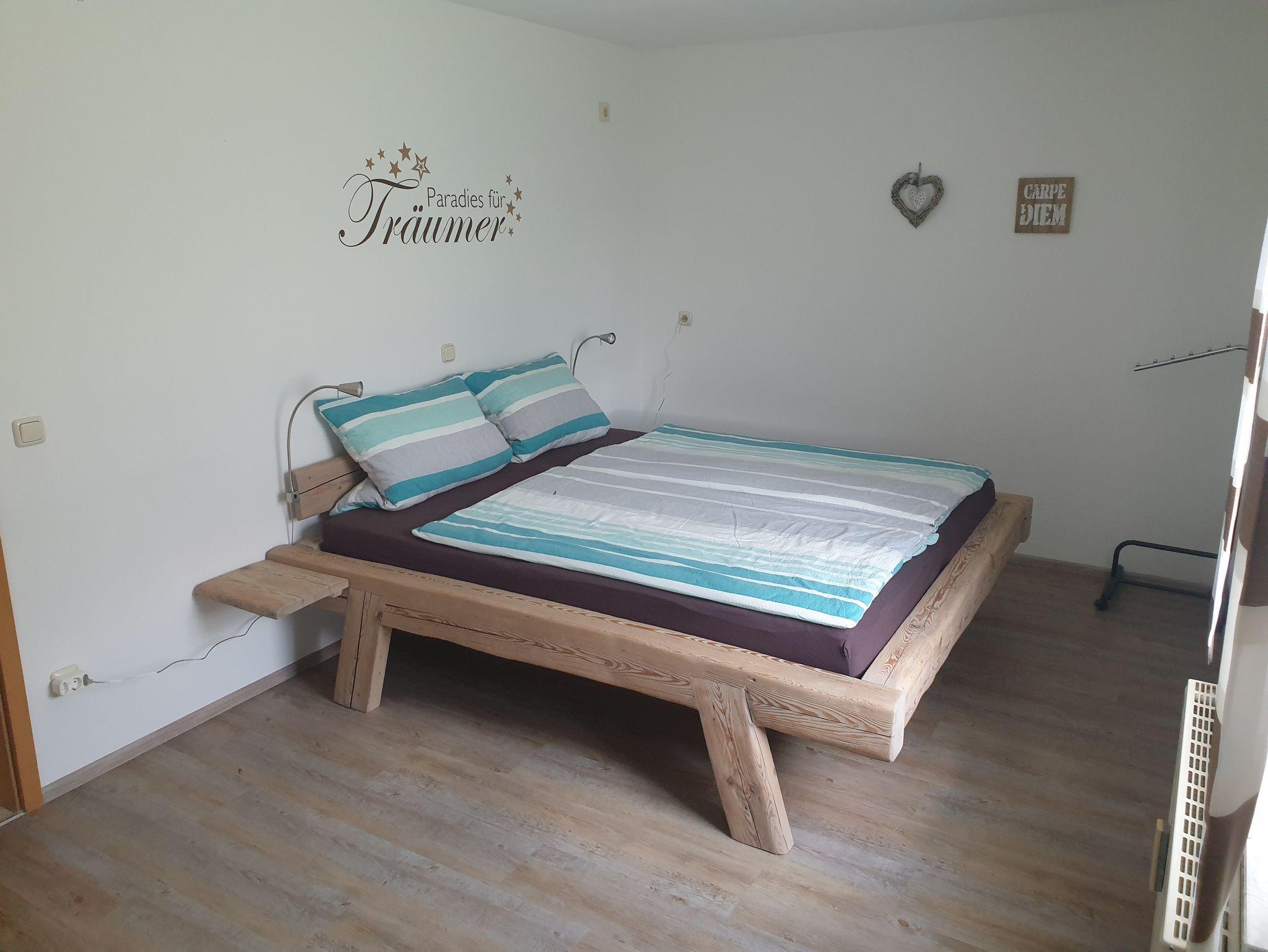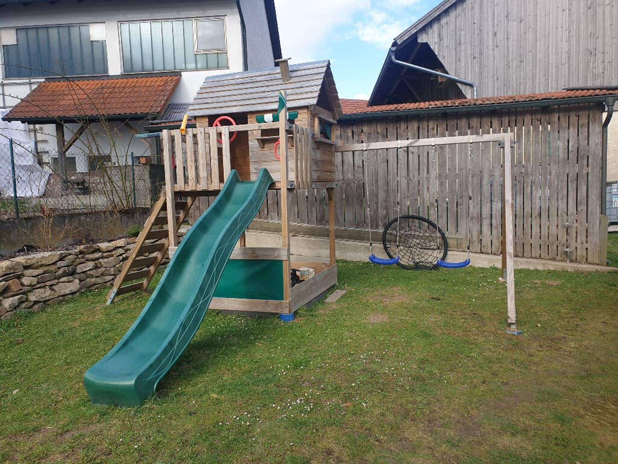 Unsere 108qm große Ferienwohnung im Parterre ist sehr komfortabel ausgestattet. Die Wohnung verfügt über einen separaten Eingang, eine Wohnküche, ein Wohnzimmer mit Couch und Flachbild-TV, 2 Schlafräume, ein Bad mit WC und ebenerdiger Dusche und eine überdachte Terrasse. Die Wohnküche ist ausgestattet mit Backofen, Glaskeramikfeld, Mikrowelle, Geschirrspülmaschine, Kühlschrank mit Gefrierfach, Toaster, Kaffeemaschine und Kaffeepadmaschine, elektrische Brotmaschine, Wasserkocher und Eierkocher. Die beiden Schlafräume sind mit einem Doppelbett 1,80m x 2,00m mit einem erhöhten Betteinstieg ausgestattet und eines zusätzlich mit einem Einzelbett. Unsere Bettdecken haben eine Überlänge (155cmx220cm). Von der großen überdachten Terrasse zur Alleinnutzung haben Sie einen herrlichen Blick ins Tal! Auf der Terrasse finden Sie eine Grillmöglichkeit vor. In der Unterkunft erwartet Sie kostenfreies WLAN. Im Garten befindet sich ein Spielplatz für die Kinder. Für die kleinen Gäste ist ein Gitterbett und ein Hochstuhl vorhanden.