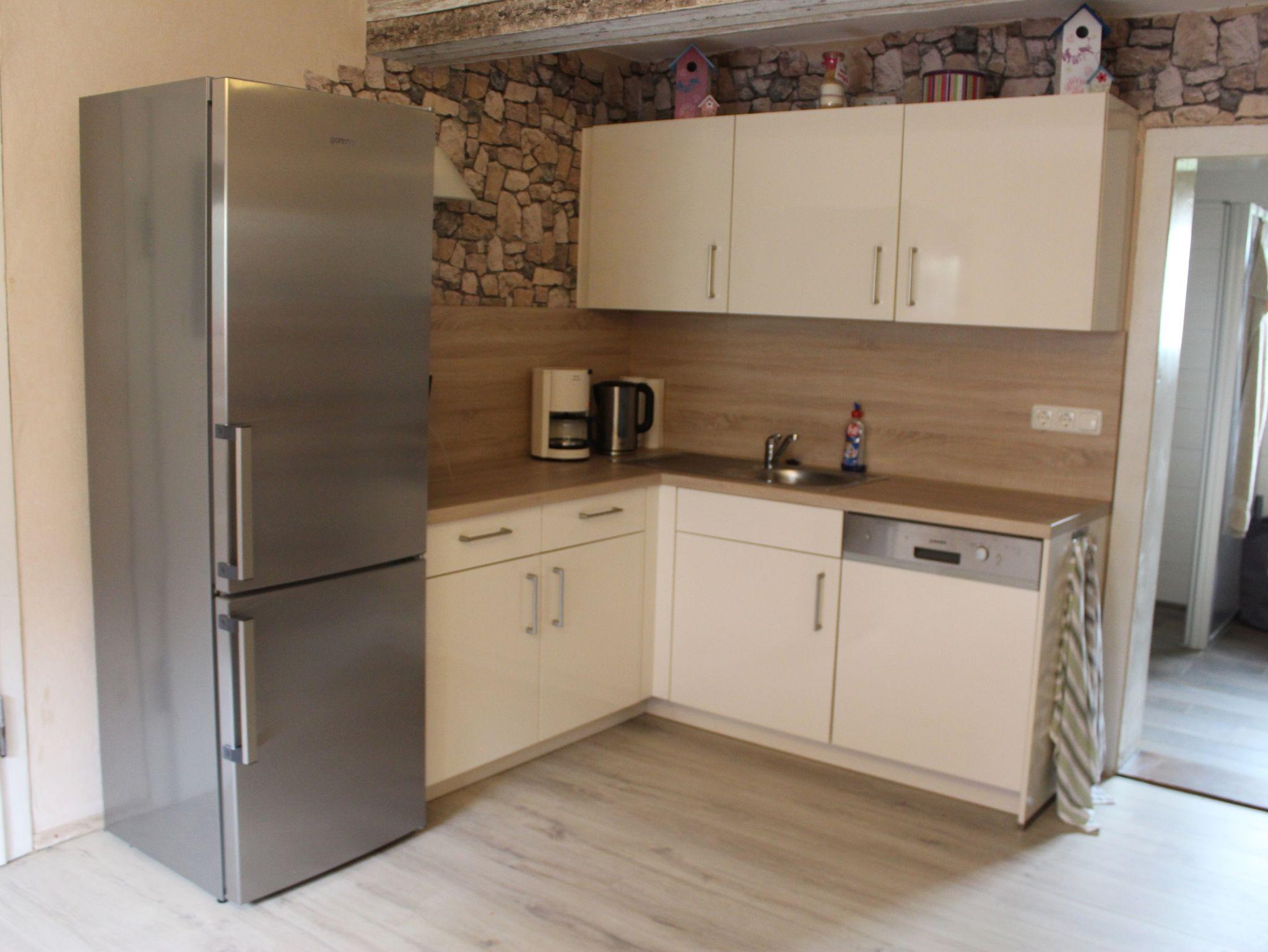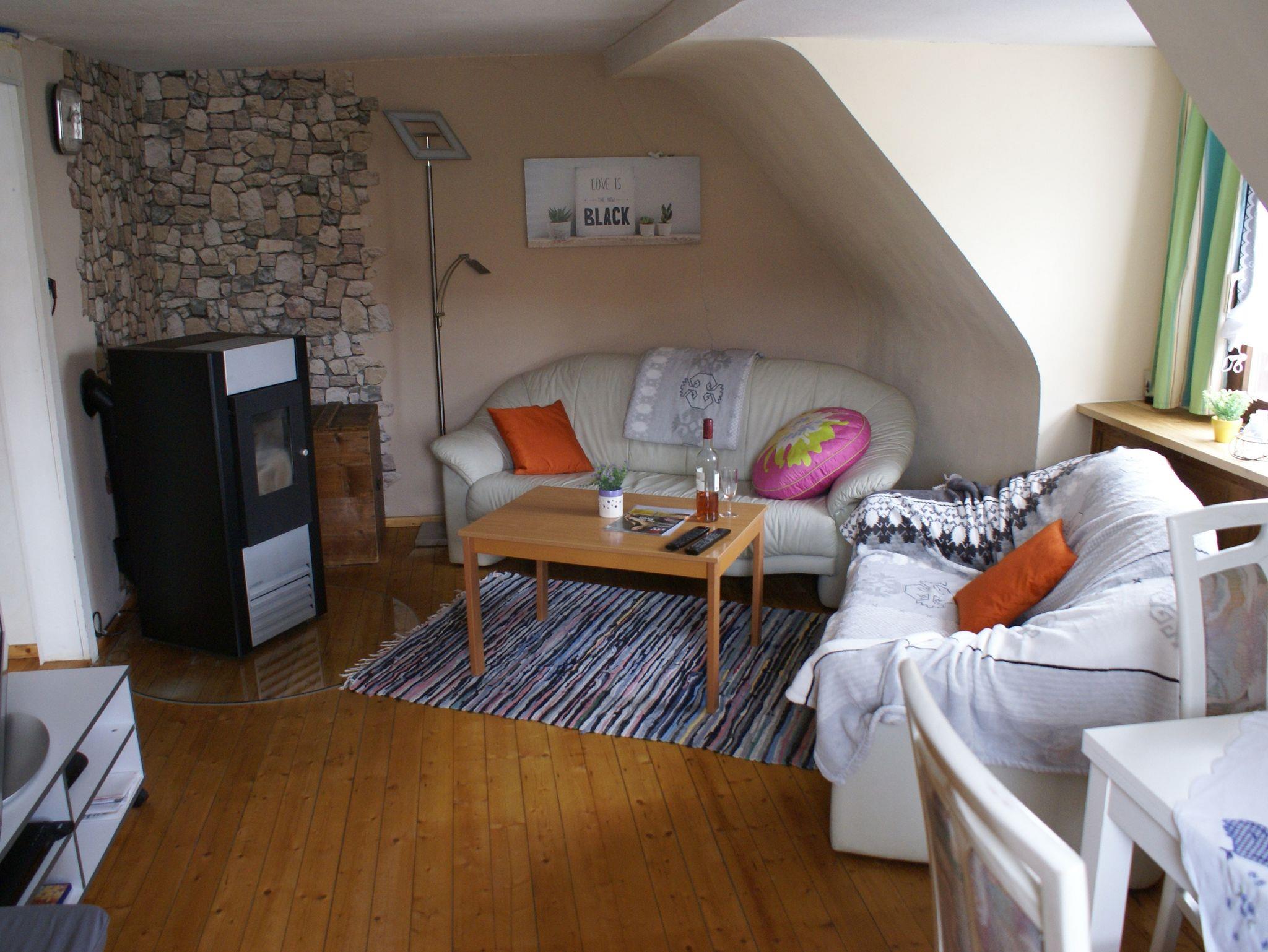 Unsere Gäste erwartet ein neu renoviertes Haus (2017) mit neuer und ausreichender, vielfältiger Ausstattung. Seit September 2018 sind wir mit Drei-Sternen vom Deutschen Tourismusverband klassifiziert worden. Im EG befindet sich die Küche mit Holzofenherd (für die kalten Wintermonate), Elektroherd, Kühlschrank, Spülmaschine, Mikrowelle, Kaffeemaschine und Wasserkocher, kl. Stereoanlage. Geschirr, Töpfe und Pfannen sind vorhanden. Geschirrhandtücher werden gestellt. Das vorhandene Telefon kann für Inlandsgespräche ins Festnetz kostenfrei mit benutzt werden.