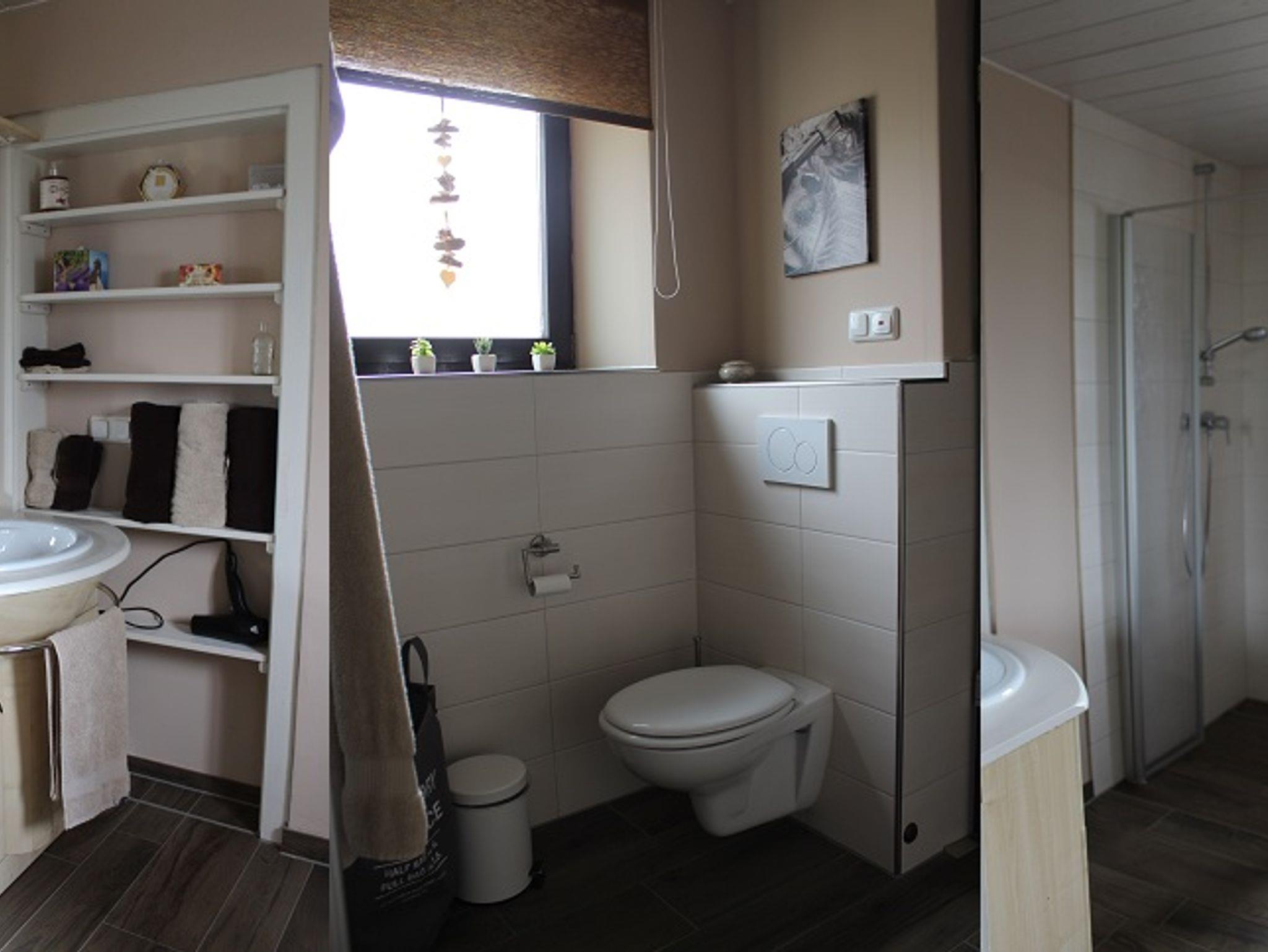 Neben der Küche befindet sich das Bad (EG) mit Waschtisch, Dusche und Toilette. Ein Fön, sowie eine Körperwaage und zwei Kosmetikspiegel sind vorhanden. Handtücher (und Bettwäsche) werden gestellt. Im Bad befindet sich auch ein Zugang (Terrassentür) zur Terrasse, welche vom Garten und einer neuen Bruchsteinmauer im südländischen Stil umrandet wird. (Von allen bisherigen Gästen als traumhaft schön und ruhig bezeichnet.) Ein tragbares Radiogerät, mit CD-Player und USB-Anschluss, steht unseren Besuchern zur Verwendung auf der Terrasse oder im Haus zur Verfügung.