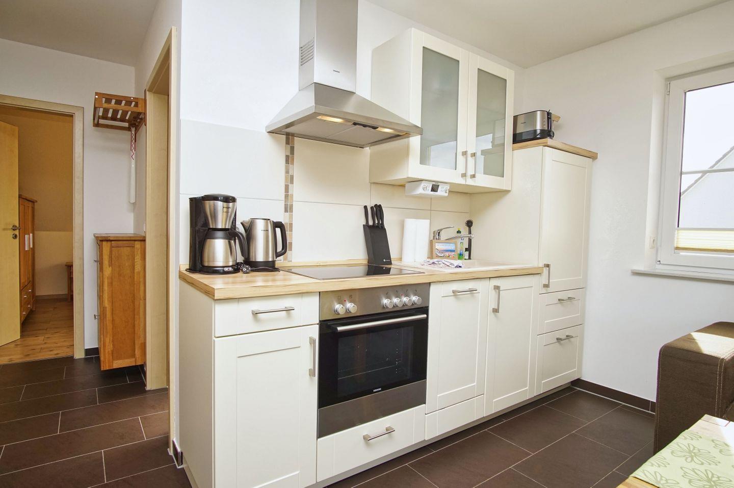 KÜCHE // offene Küche, 4-Platten Cerankochfeld, Spülmaschine, Kühlschrank mit Gefrierfach, Backofen, Toaster, Wasserkocher, Kaffeemaschine, reichlich Besteck, Geschirr und Küchenutensilien ++