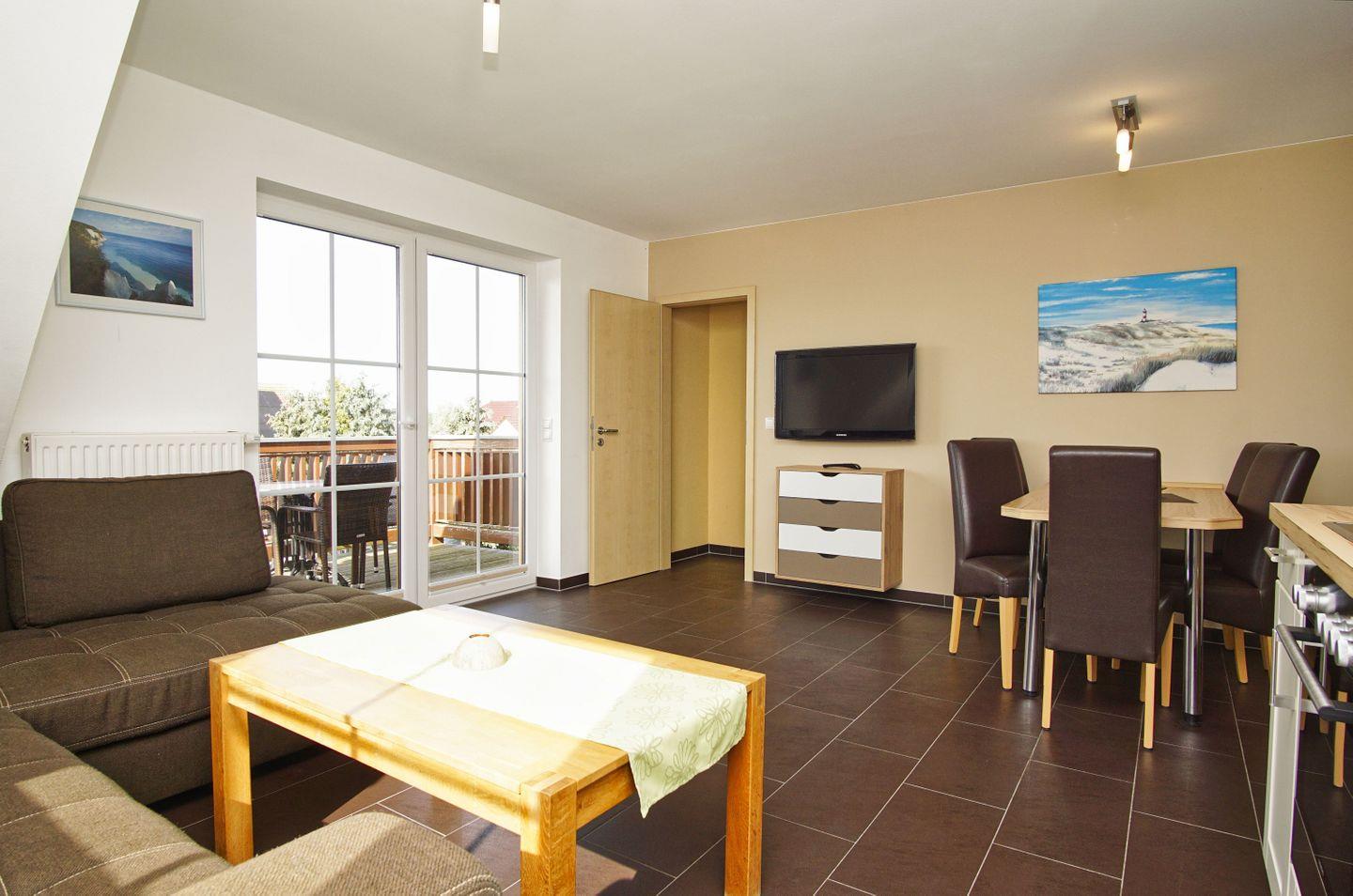 WOHNEN // Wohnraum mit Essbereich, Sitzgarnitur mit bequemer Couch, Flachbild-TV, Sat-TV, Radio mit CD-Player ++