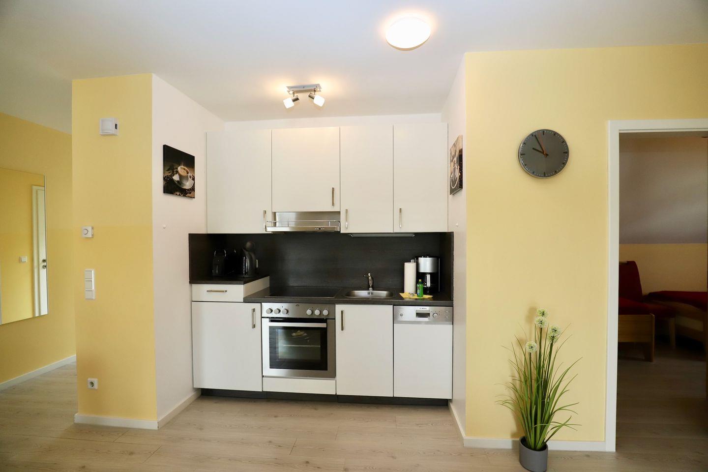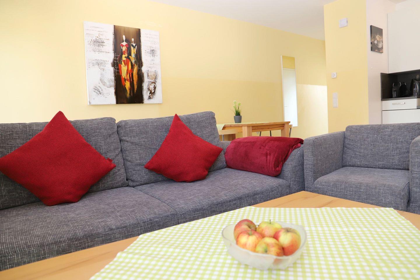 Das Wohnzimmer hat ein Essbereich mit offener, hochwertiger Küchenzeile, die mit einem Backofen, Ceran-Kochfeld, Geschirrspüler, Kühlschrank mit Eisfach, Kaffeemaschine, Wasserkocher, Toaster und allem, was man zum Kochen braucht, ausgestattet ist und eine gemütliche Sofaecke mit Couchtisch, Flachbild-TV, DVD-Player, Sideboard mit Gesellschaftspielen.