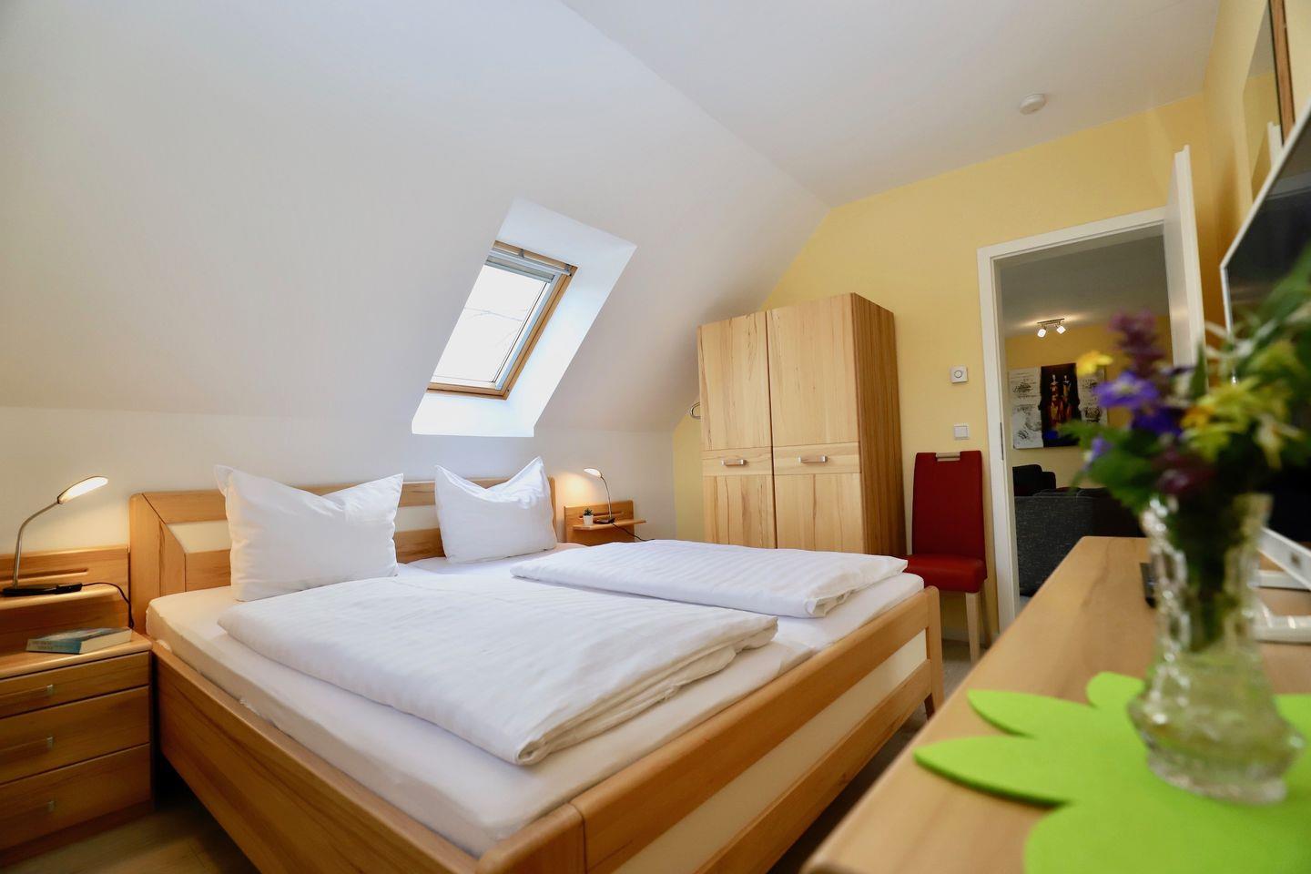In einem Schlafzimmer befindet sich zusätzlich ein Flachbild-TV.