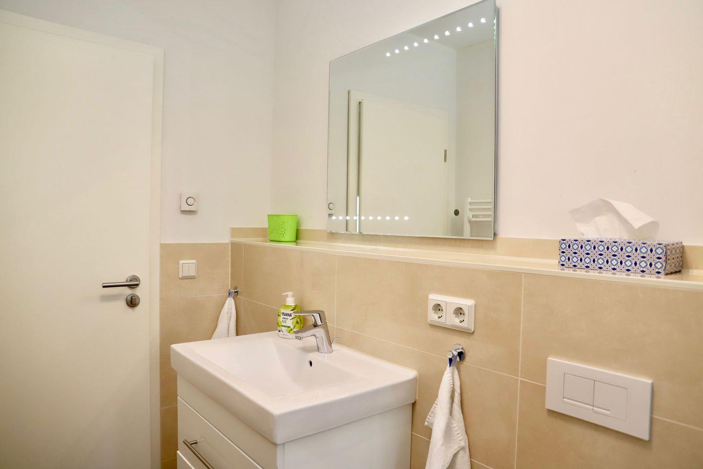 Das moderne Tageslichtbad ist mit ebenerdiger Dusche, einem WC, und einem großen Waschtisch ausgestattet.