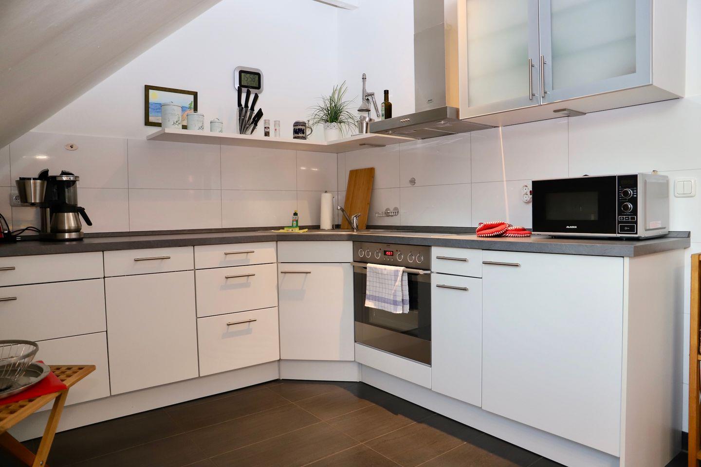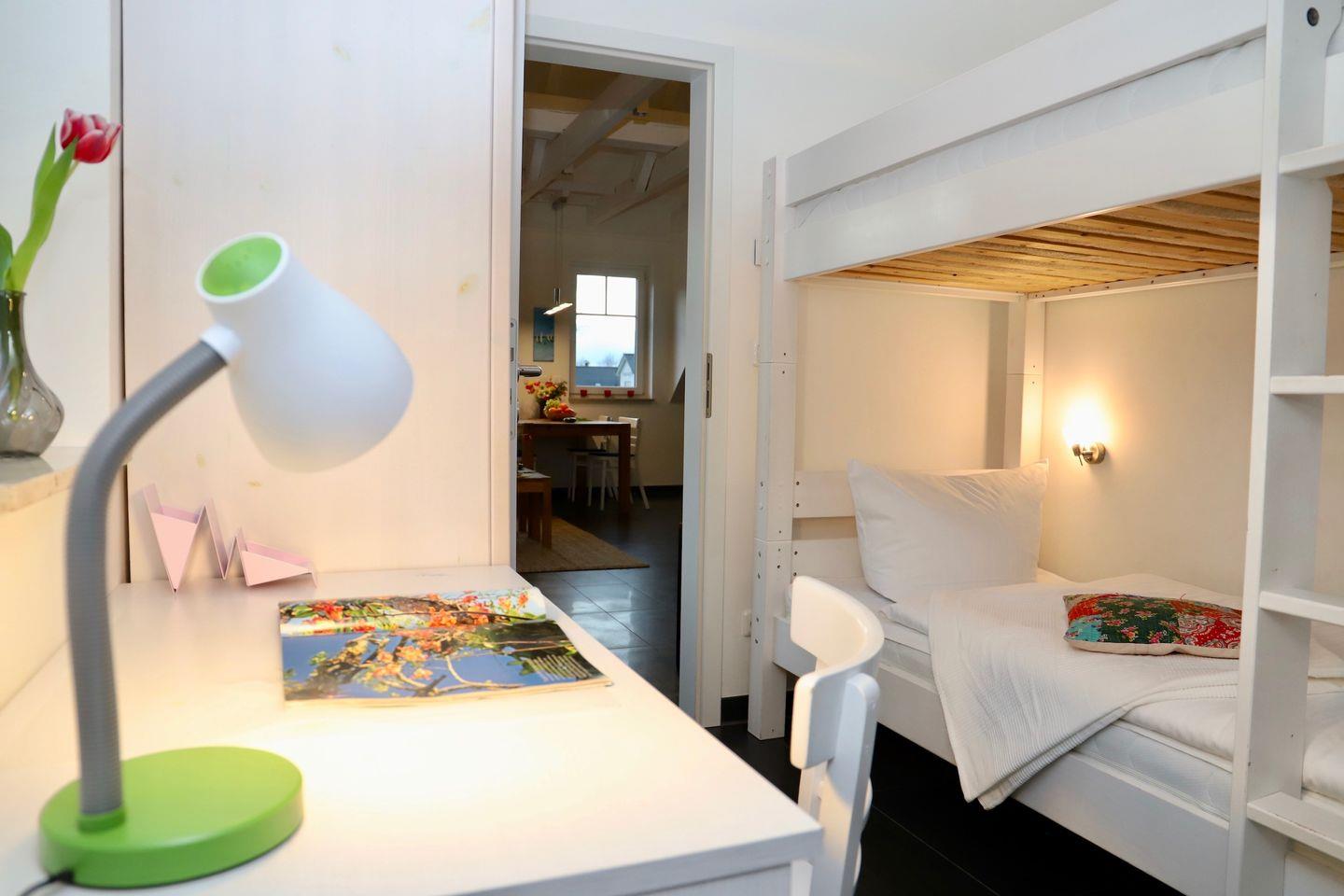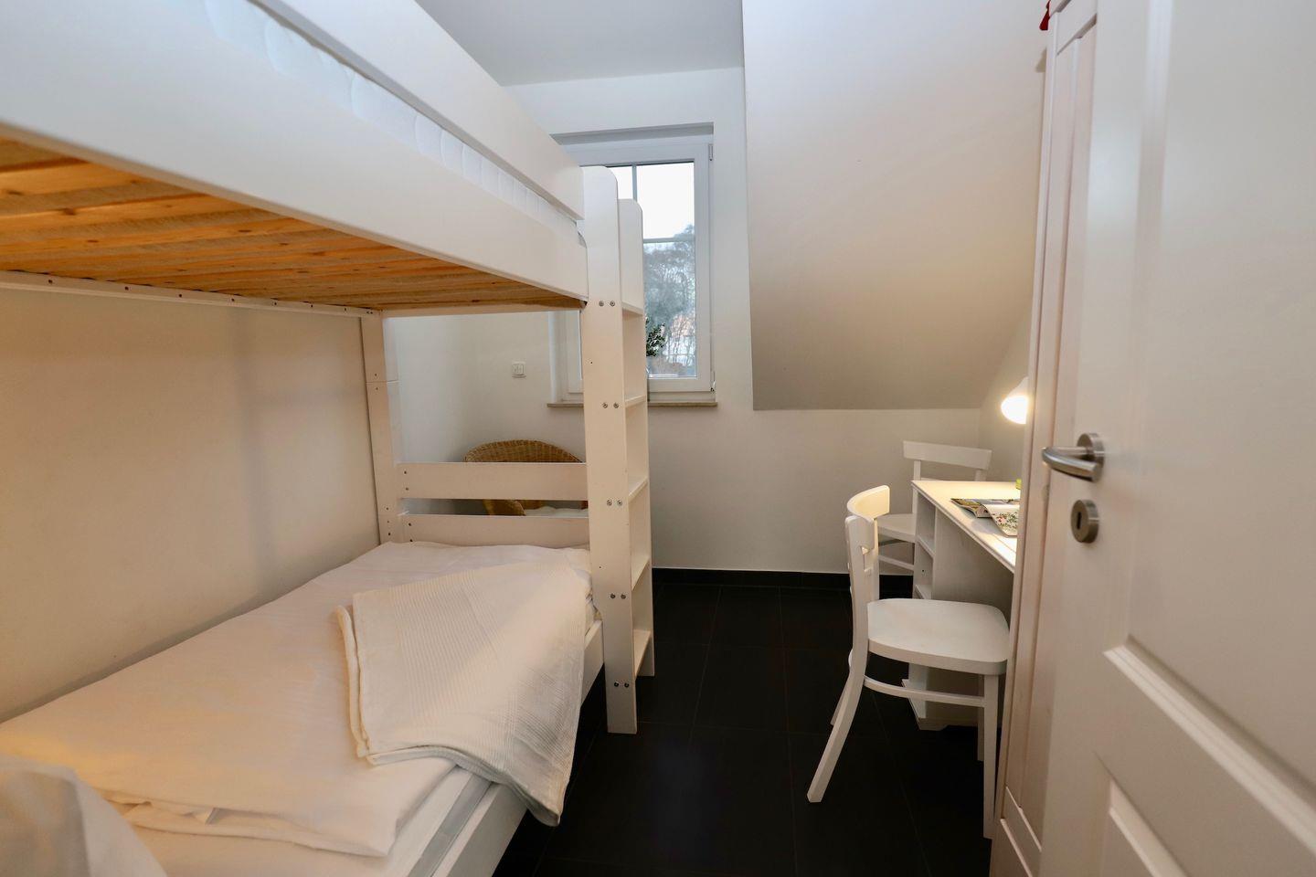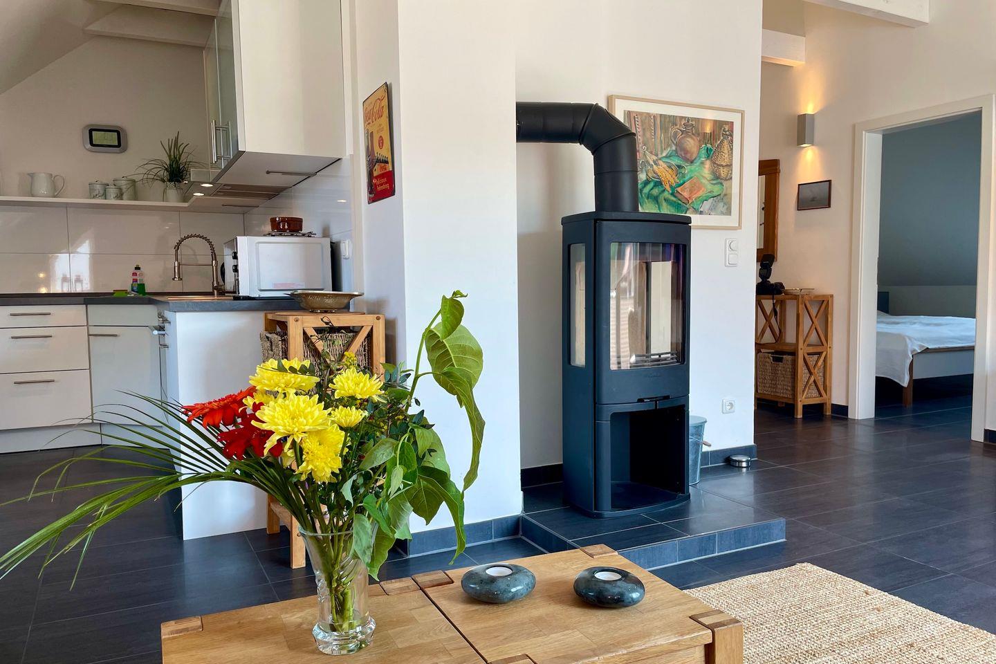 Die 60qm große 3 Zimmer Wohnung liegt im 1.OG. Die lichtdurchflutete Wohnung ist hochwertig ausgestattet. Zur Ausstattung gehören Flat-TV, DAB-Radio, Blu-Ray und CD-Player und kostenloses WLAN. Im großen Wohnzimmer befindet sich neben den modernen Wohn- und Essmöbeln ein Kaminofen. Die volleingerichtete Einbauküche ist mit Ceran-Kochfeld, Mikrowelle, Backofen, Kühlschrank mit Gefrierfach und Spülmaschine, Toaster, Wasserkocher, Kaffemaschine und diversen Küchenutensilien ausgestattet. Im größeren Schlafzimmer befindet sich ein Doppelbett ( 180/ 200 cm ) zusammen mit einem Kleiderschrank, zwei Nachtkommoden sowie 2 Herrendienern. Das zweite Schlafzimmer ist ausgestattet mit einem Etagenbett ( 2x90 x 200cm ), Kleiderschrank und einem kleinen Schreibtisch vor dem Fenster mit wunderschönem Blick. Die Fenster in beiden Schlafzimmern sind mit Insektenschutzgittern, Verdunklungsplisse´s und Rolläden ausgestattet. Das moderne Bad mit großer Dusche hat einen Handtuchheizkörper, Fön, Kosmetikspiegel, Waschmaschiene und einen großen Wandspiegel. Zu der Wohnung gehört ein Hauswirtschaftsraum auf der Etage. Vor dem Haus befindet sich ein kostenloser PKW-Stellplatz sowie ein abschliessbarer Fahrradschuppen.