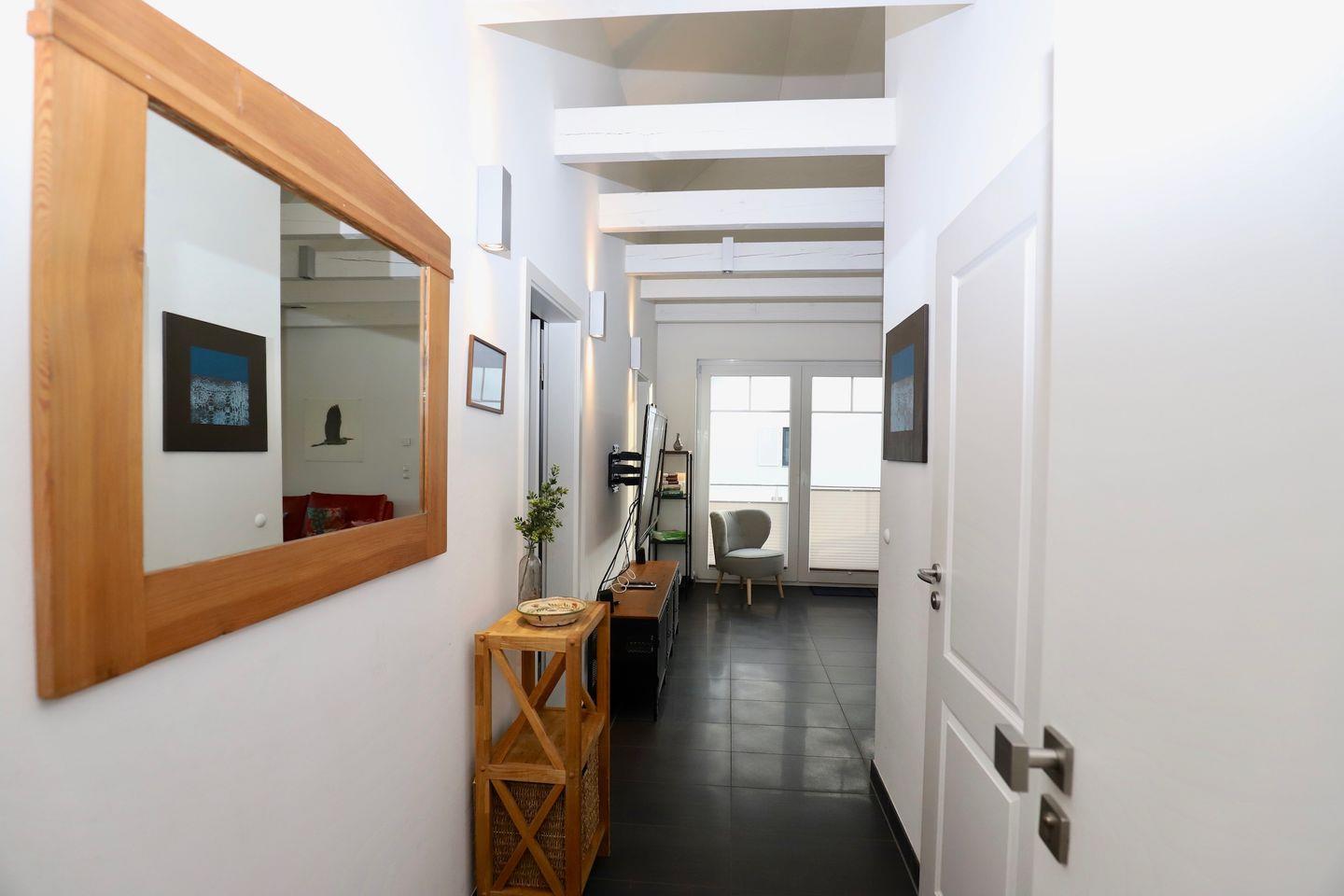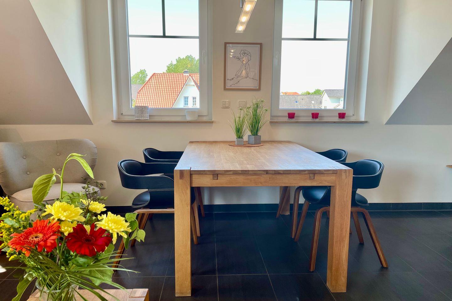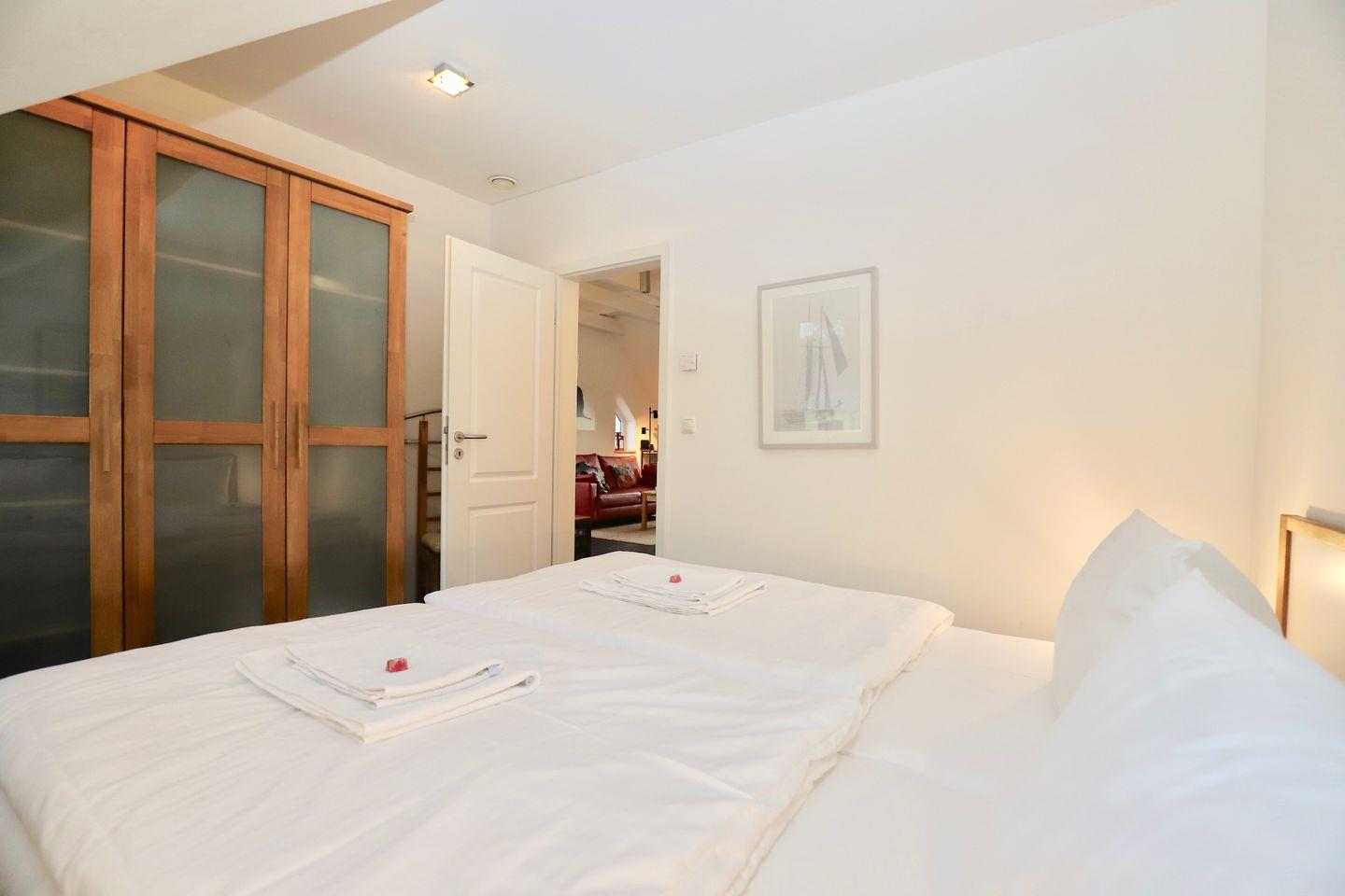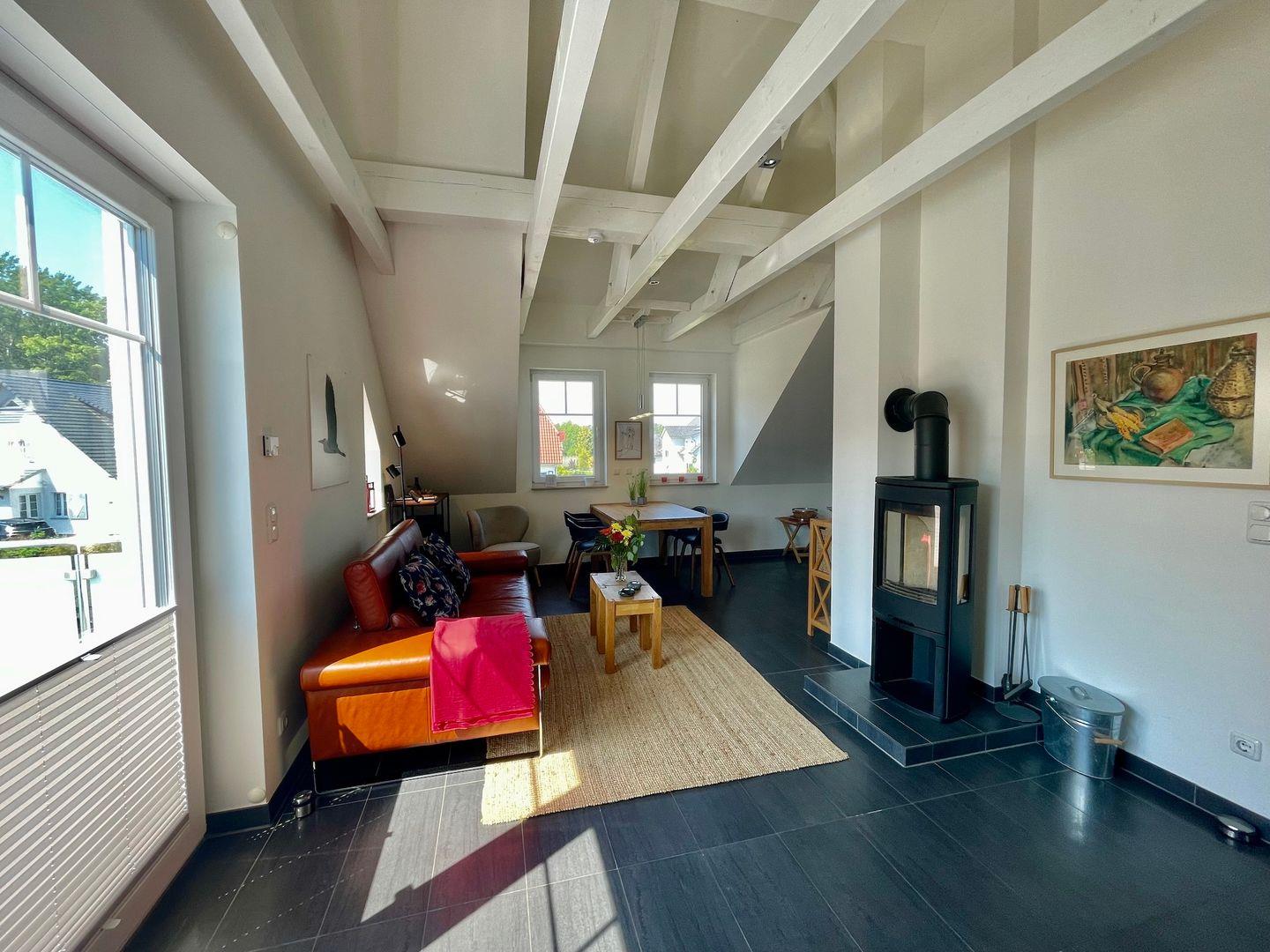 Die 60qm große 3 Zimmer Wohnung liegt im 1.OG. Die lichtdurchflutete Wohnung ist hochwertig ausgestattet. Zur Ausstattung gehören Flat-TV, DAB-Radio, Blu-Ray und CD-Player und kostenloses WLAN. Im großen Wohnzimmer befindet sich neben den modernen Wohn- und Essmöbeln ein Kaminofen. Die volleingerichtete Einbauküche ist mit Ceran-Kochfeld, Mikrowelle, Backofen, Kühlschrank mit Gefrierfach und Spülmaschine, Toaster, Wasserkocher, Kaffemaschine und diversen Küchenutensilien ausgestattet. Im größeren Schlafzimmer befindet sich ein Doppelbett ( 180/ 200 cm ) zusammen mit einem Kleiderschrank, zwei Nachtkommoden sowie 2 Herrendienern. Das zweite Schlafzimmer ist ausgestattet mit einem Etagenbett ( 2x90 x 200cm ), Kleiderschrank und einem kleinen Schreibtisch vor dem Fenster mit wunderschönem Blick. Die Fenster in beiden Schlafzimmern sind mit Insektenschutzgittern, Verdunklungsplisse´s und Rolläden ausgestattet. Das moderne Bad mit großer Dusche hat einen Handtuchheizkörper, Fön, Kosmetikspiegel, Waschmaschiene und einen großen Wandspiegel. Zu der Wohnung gehört ein Hauswirtschaftsraum auf der Etage. Vor dem Haus befindet sich ein kostenloser PKW-Stellplatz sowie ein abschliessbarer Fahrradschuppen.
