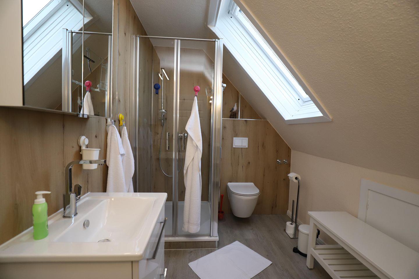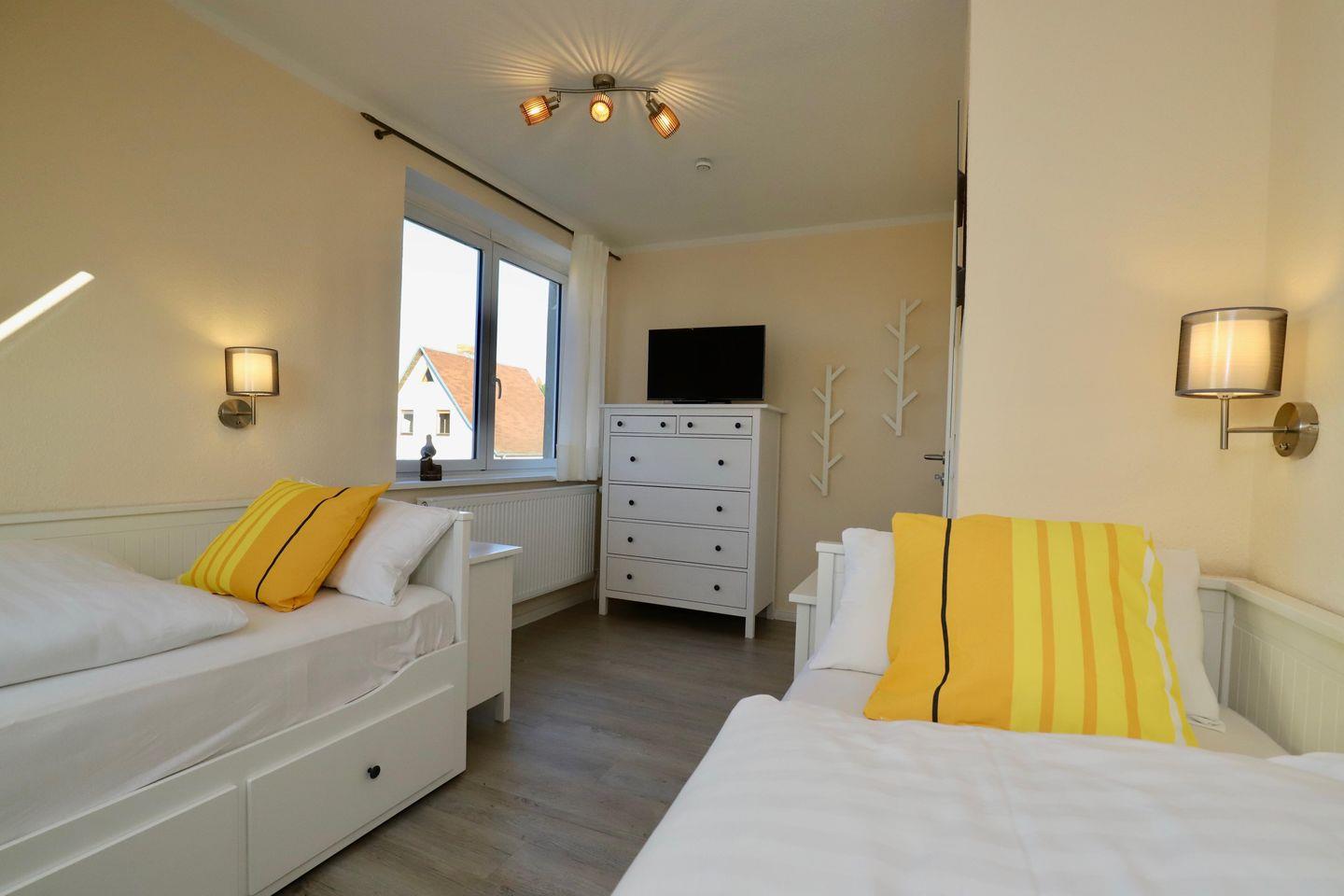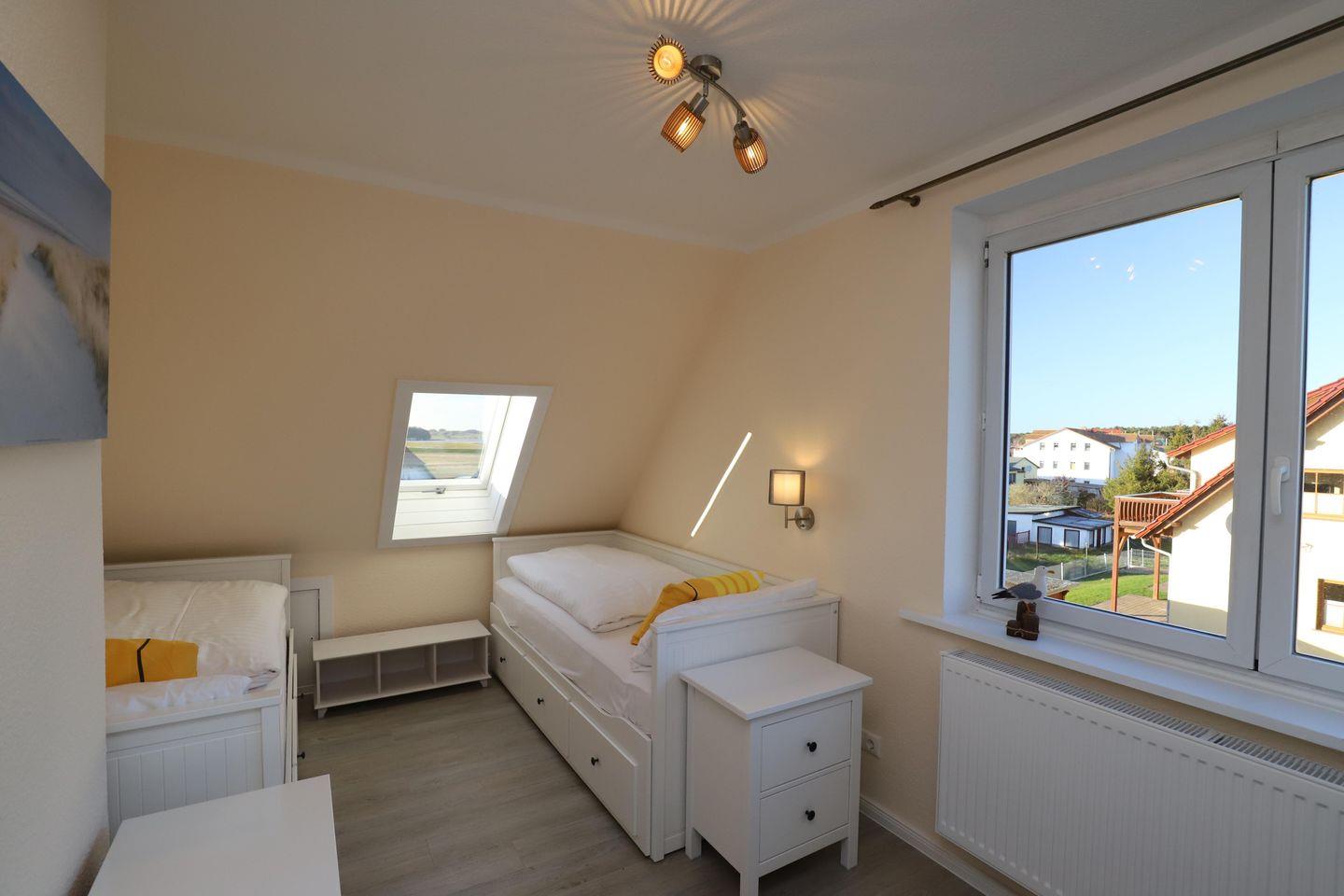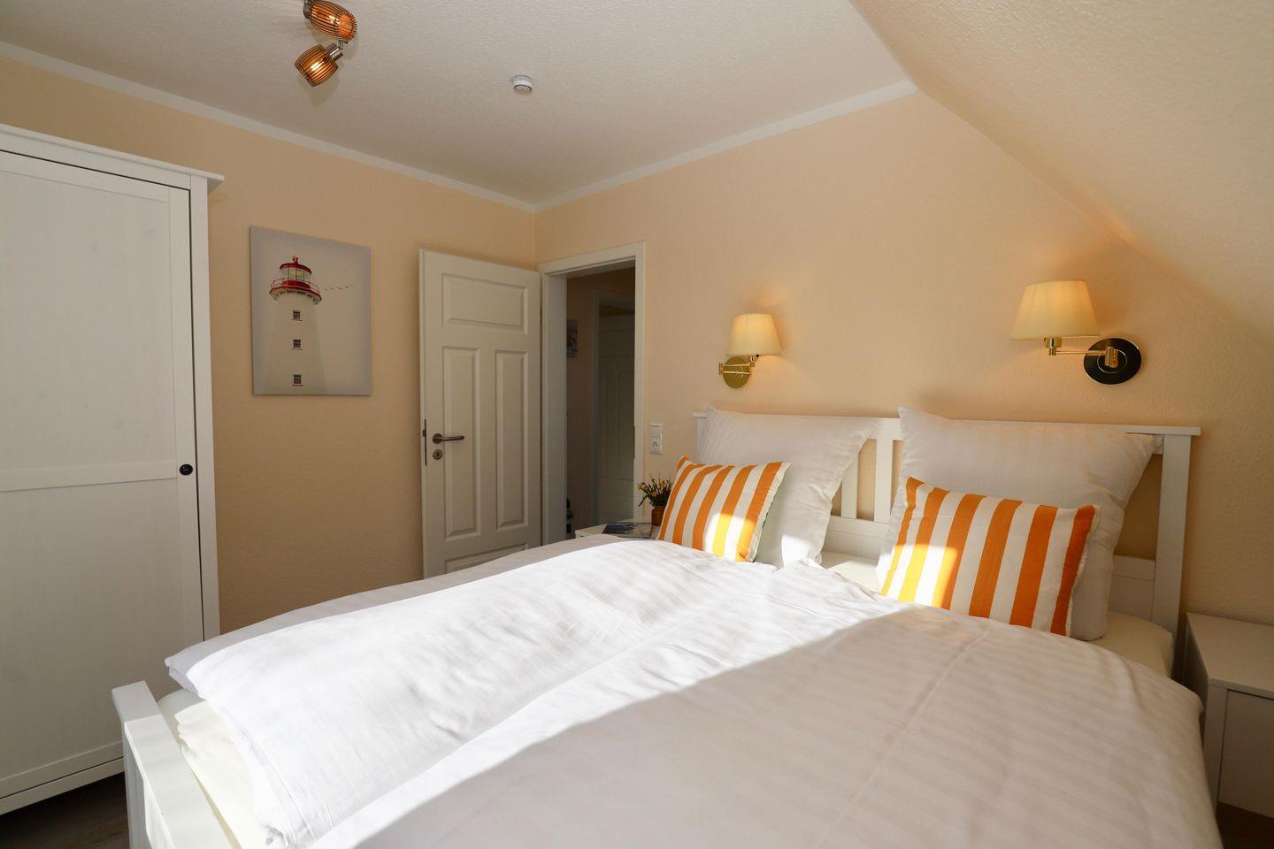Die Ferienwohnung "Lachmöwe" wurde im Jahr 2020 neu renoviert und modern eingerichtet. Die 110qm große Wohnung für 6 Personen befindet sich im Haus "Meerglück" und erstreckt sich über zwei Etagen. Im Dachgeschoss befinden sich drei Schlafzimmer und ein Bad mit ebenerdiger Dusche. Das erste Schlafzimmer hat ein Doppelbett, eine Kommode, über der sich ein Flachbildschirm befindet, einen Kleiderschrank, zwei Nachttischkommoden. Im zweiten Schlafzimmer sind zwei Einzelbetten mit Nachttischen, ein Kleiderschrank und ein Flachbildschirm. Das dritte Schlafzimmer mit einem fantastischem Blick über die Salzwiesen und den Lotsenberg hat zwei Einzelbetten, eine Kommode und ein Flachbildschirm.