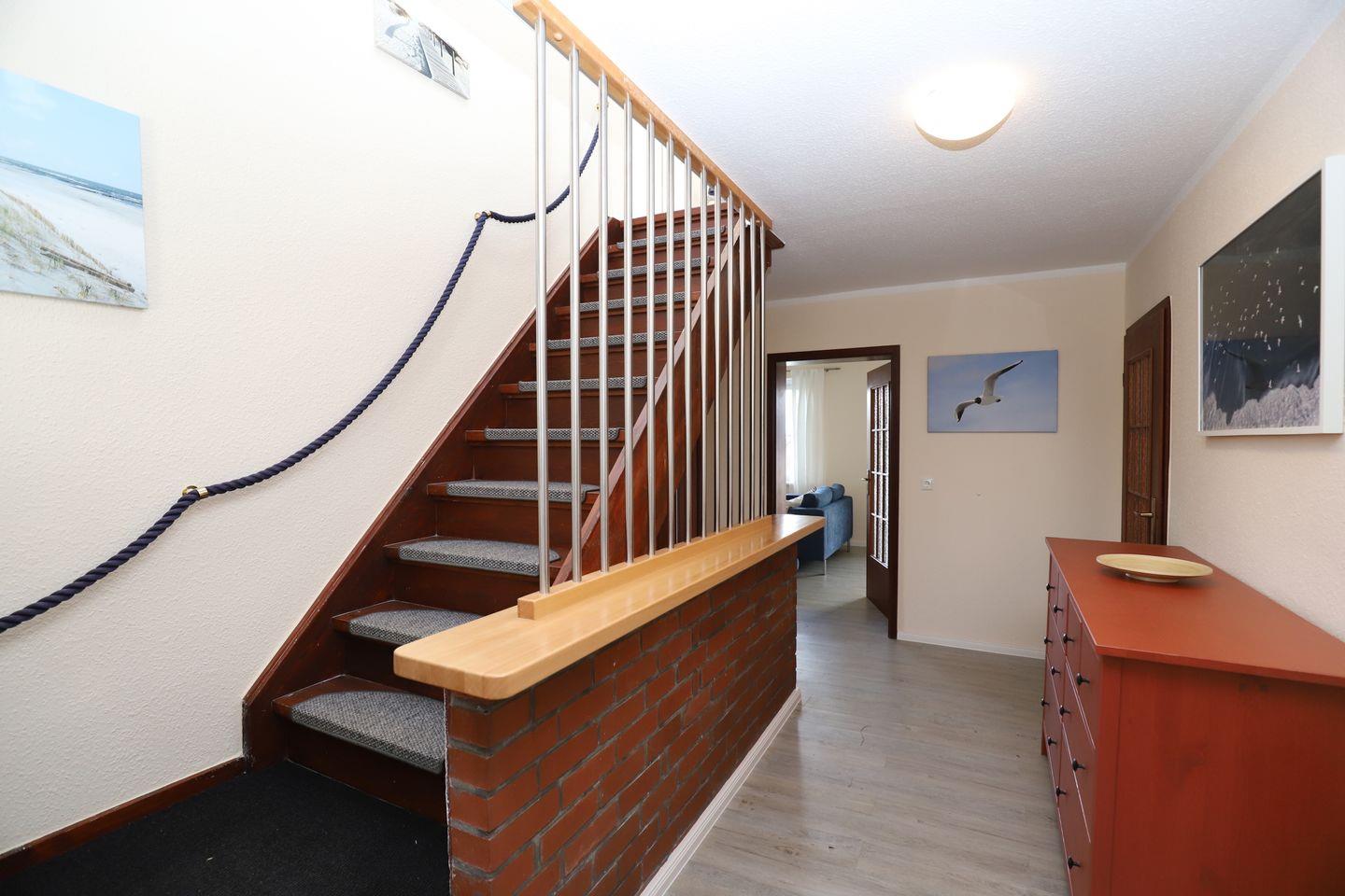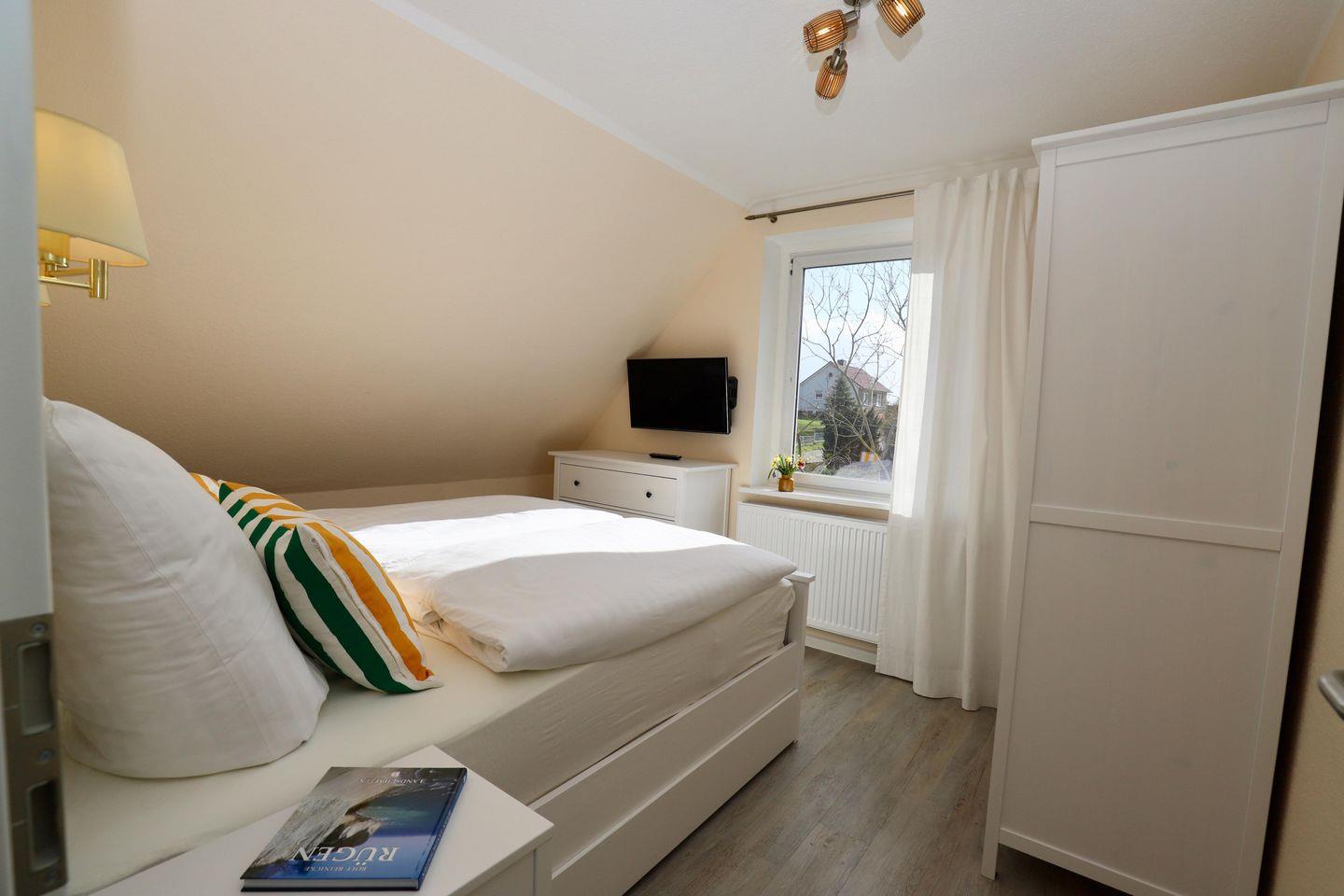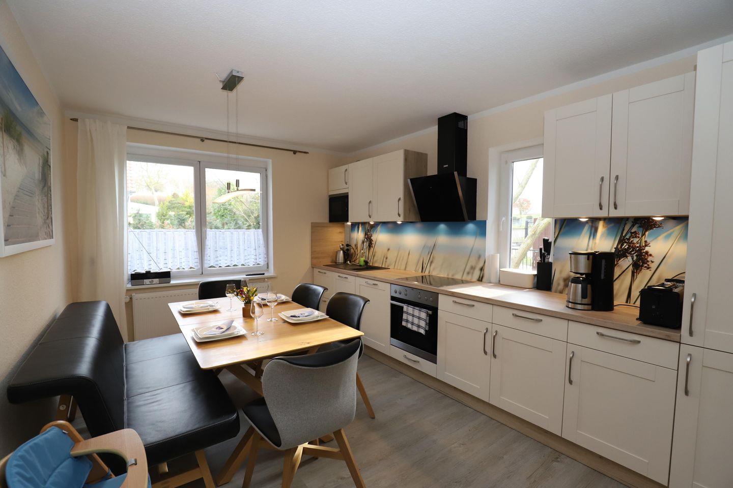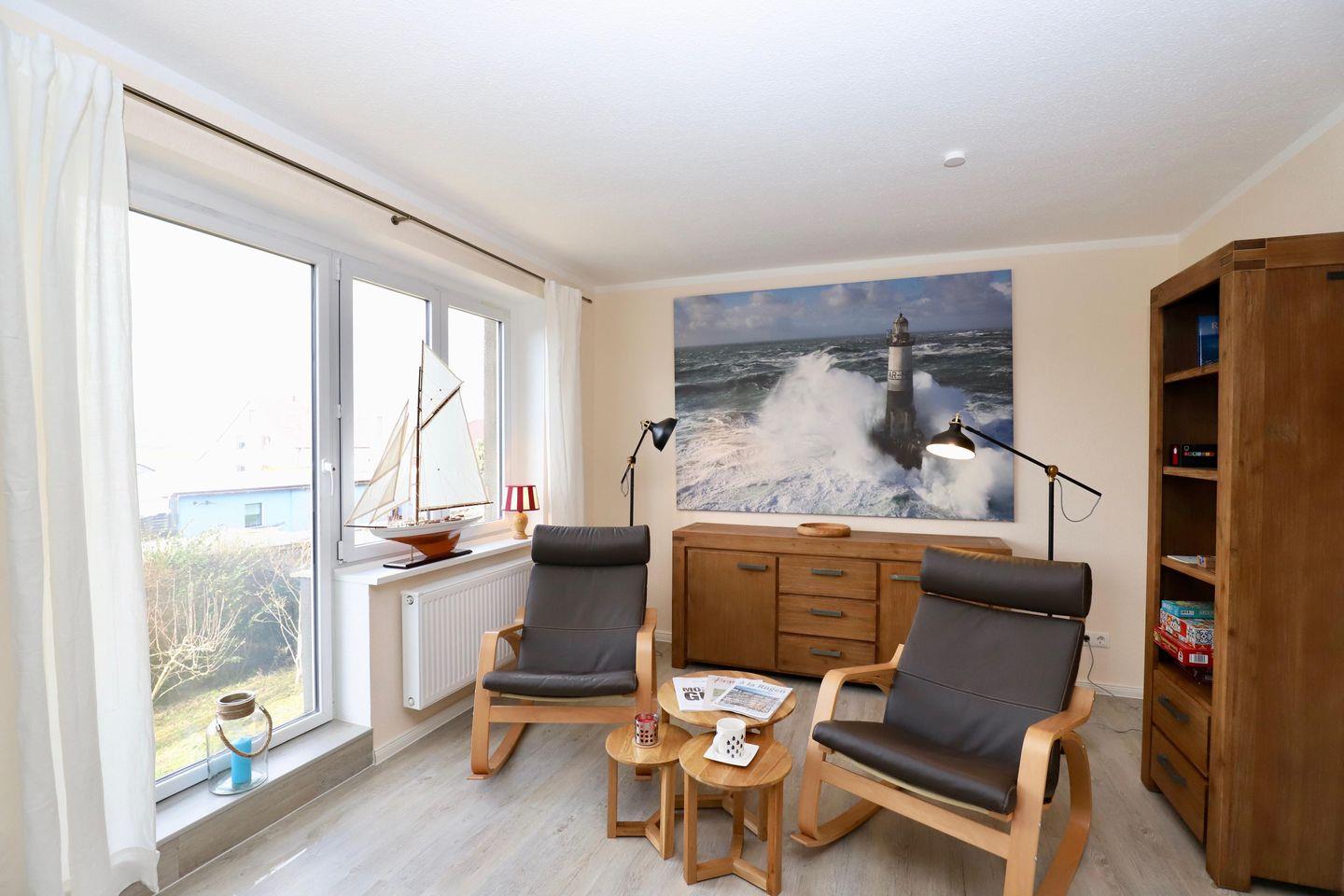 Sie erstreckt sich auf 2 Etagen, wobei die Schlafzimmer im Dachgeschoss liegen und im Erdgeschoss befindet sich die Küche und das große Wohnzimmer mit einer Sitzecke von wo aus man einen wunderschönem Blick über Thiessow genießen kann.