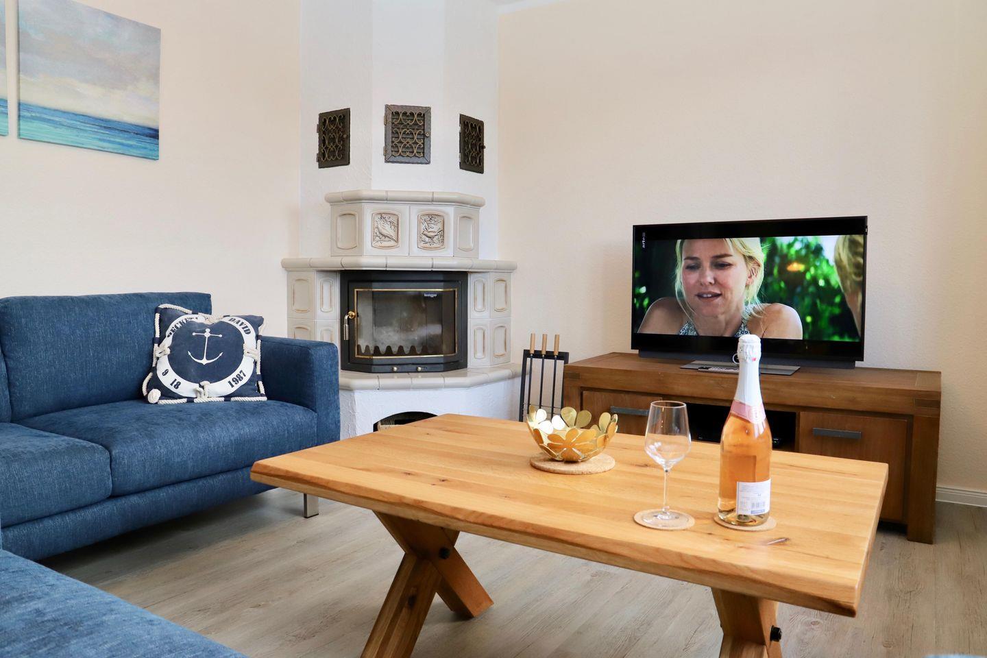 Die untere Etage hat ein großes Wohnzimmer. Eine bequeme Sofaecke mit Flachbild TV und Kamin sorgen für gemütliches Beisammensein. Eine Sitzecke mit zwei Schaukelsesseln und Bibliothek mit wunderschönem Blick über Thiessow lädt zum Verweilen ein. Die große moderne Küche ist mit allem ausgestattet, was man zum Kochen braucht. Der Esstisch hat viel Platz für eine große Familie.