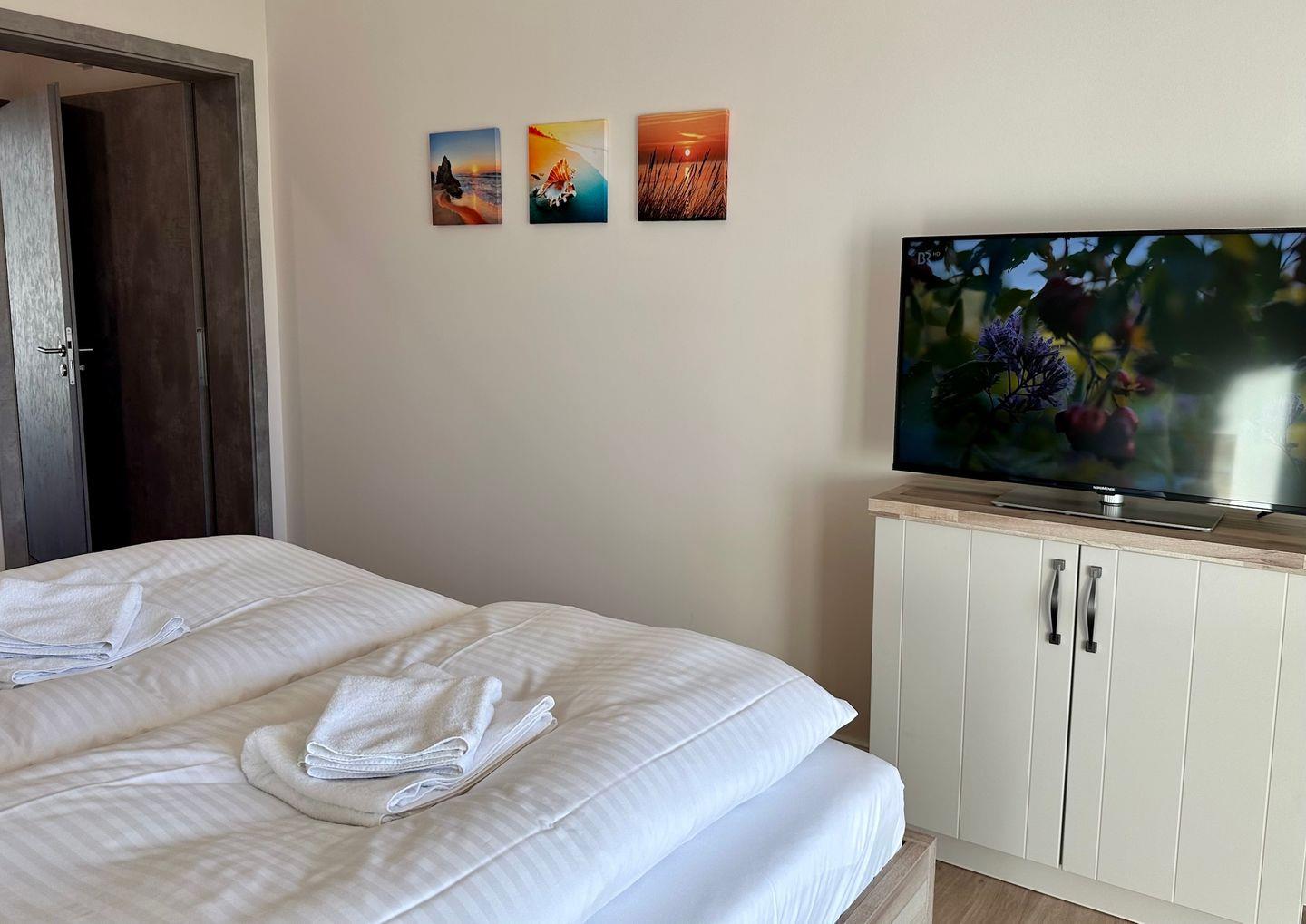 Für Ihre angenehme Nachtruhe sorgen ein hochwertiges Doppelbett im Schlafzimmer und eine bequeme Schlafcouch im Wohnzimmer.