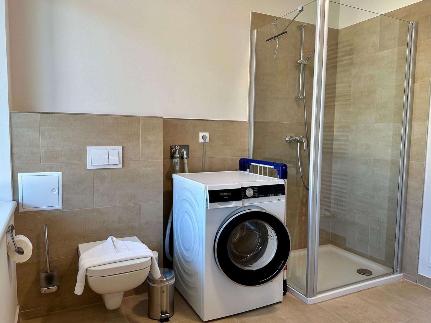 Die ebenerdige Dusche im Bad sorgt für viel Bequemlichkeit . WC, Waschtisch, Fön und eine Waschmaschine ergänzen die Ausstattung. Das Bad verfügt über zwei große Fenster.