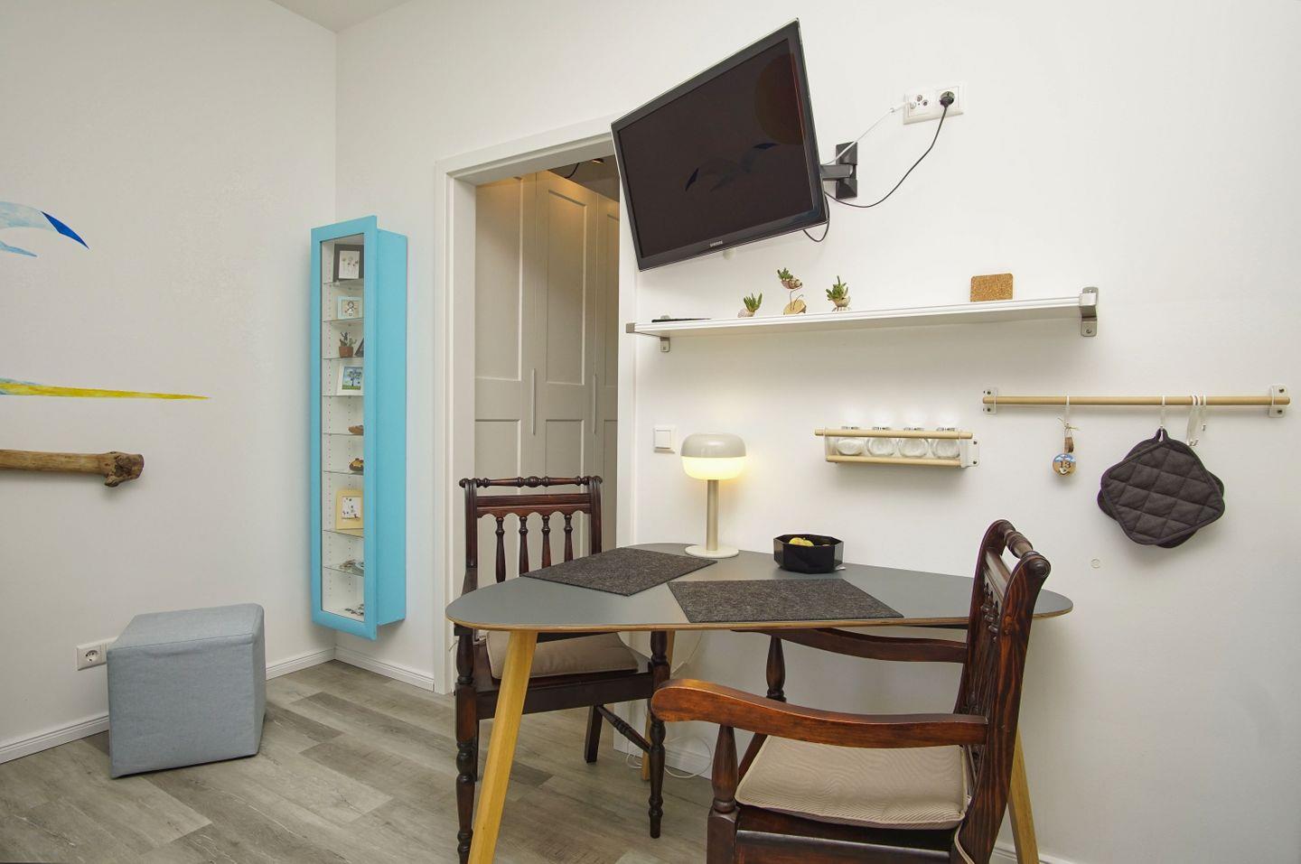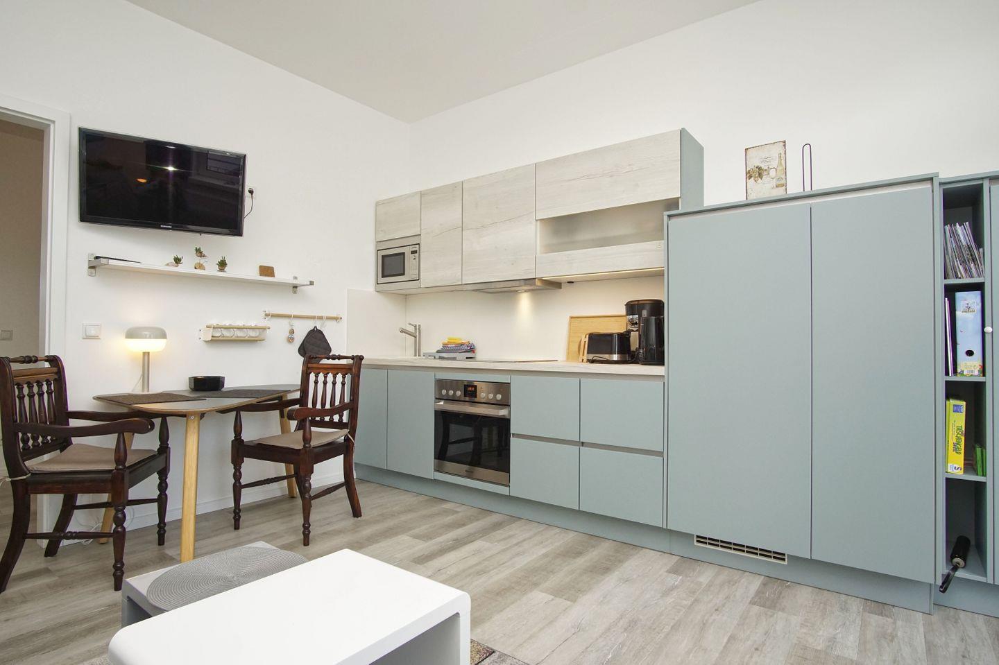 WOHN- UND KÜCHENBEREICH // Wohnraum mit Essbereich, bequemer Couch, Flachbild-TV, offene Küche, Ceranfeld, Spülmaschine, Kühlschrank mit Gefrierfach, Backofen, Toaster, Wasserkocher, Mikrowelle, Kaffeemaschine, reichlich Besteck, Geschirr und Küchenutensilien ++