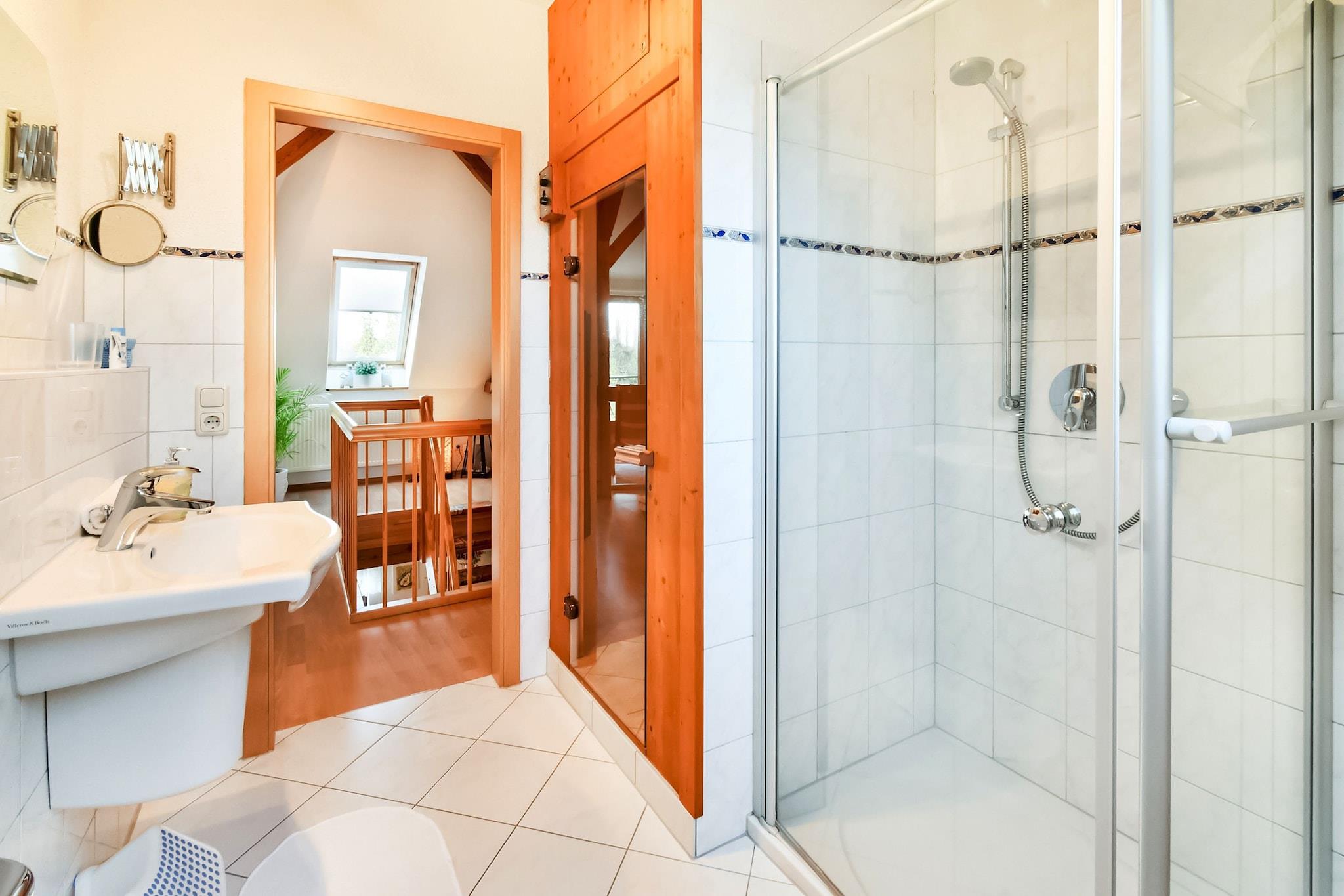 Nyd en afslappende ferie i dette rummelige familievenlige hjem i Thorstorf, kun 4 km fra Østersøstranden Wohlenberger Wiek. Perfekt til op til 6 gæster, huset er fordelt på tre etager og har en privat sauna, WiFi og en stor indhegnet have. Stueetagen indeholder en spisestue med tv og høj stol, et fuldt udstyret åbent køkken med bar og et soveværelse med en king-size seng og børneseng. Et badeværelse med dobbelt håndvask, bruser og vaskemaskine sikrer komfort og bekvemmelighed. Ovenpå finder du en hyggelig stue med fladskærms-tv, dvd-afspiller og lydsystem, plus et andet soveværelse med en king-size seng og en-suite badeværelse med sauna. Soveværelset i galleriet på øverste etage, der er tilgængeligt via stejle trapper, byder på to enkeltsenge, perfekt til børn. Udenfor kan du nyde en privat terrasse, have med legeredskaber, grill, liggestole og cykelopbevaring. Der ligger en café kun 100 m derfra, og lokale attraktioner såsom Boltenhagen og Grevesmühlen er i nærheden.