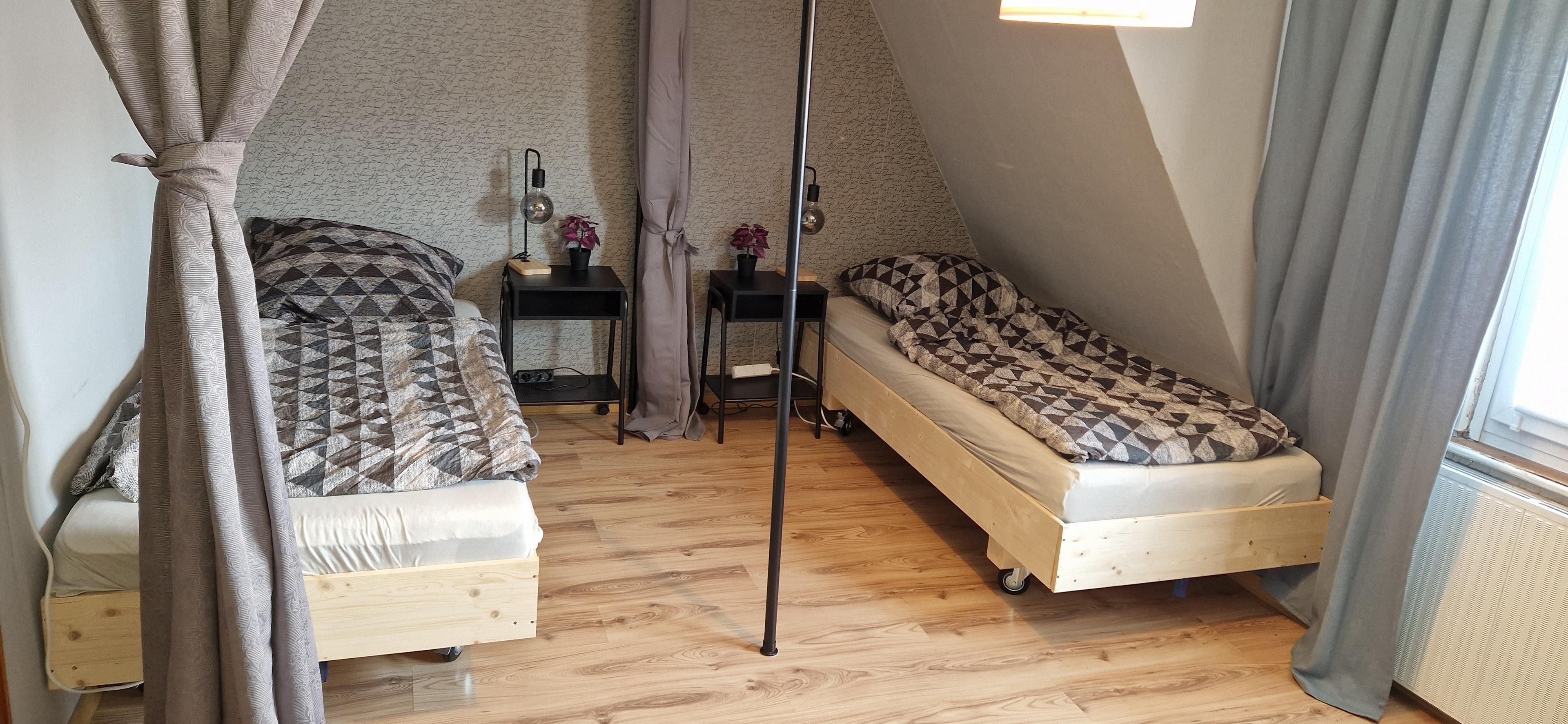 Die Einzelbetten können zum Doppelbett zusammen geschoben werden.