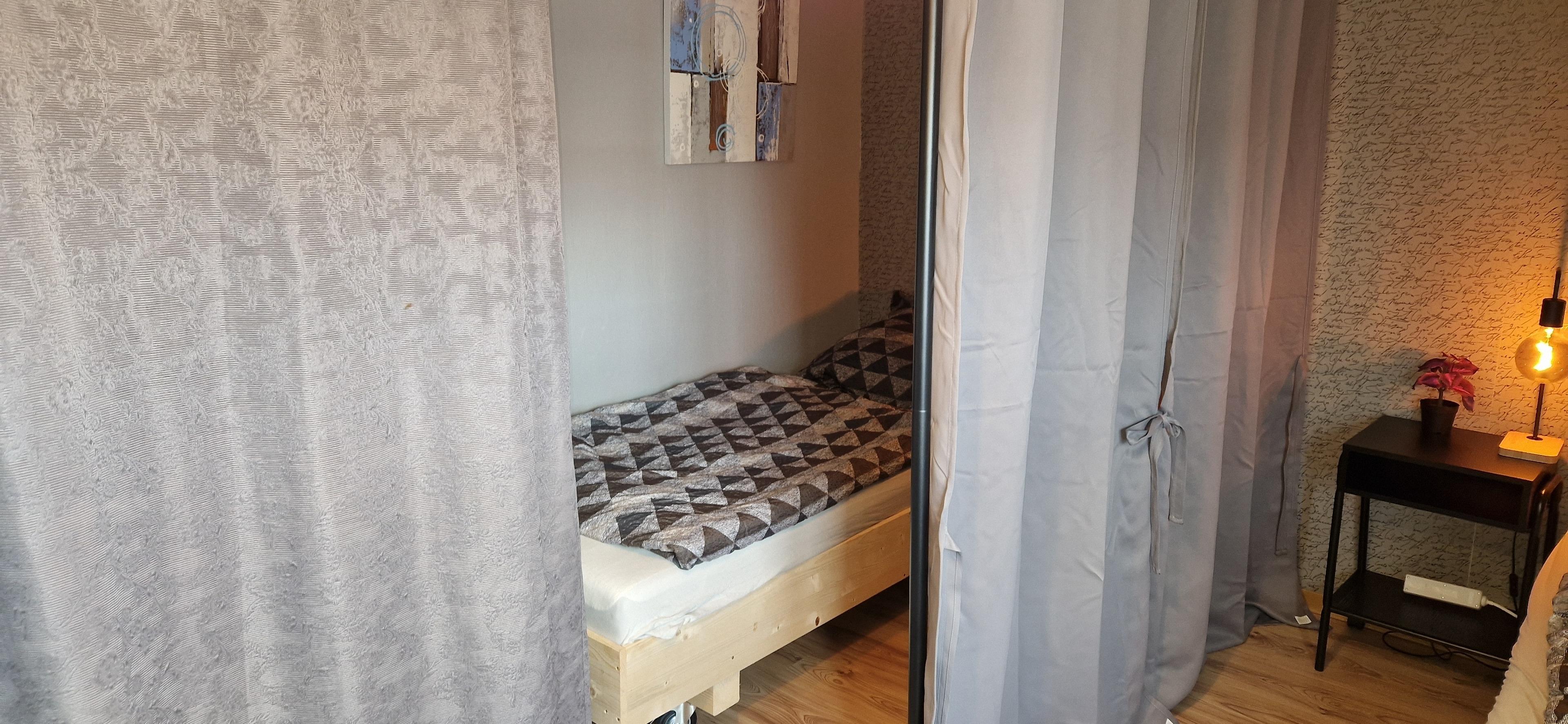 Der Schlafbereich kann aber durch einen Vorhang abgehängt werden.