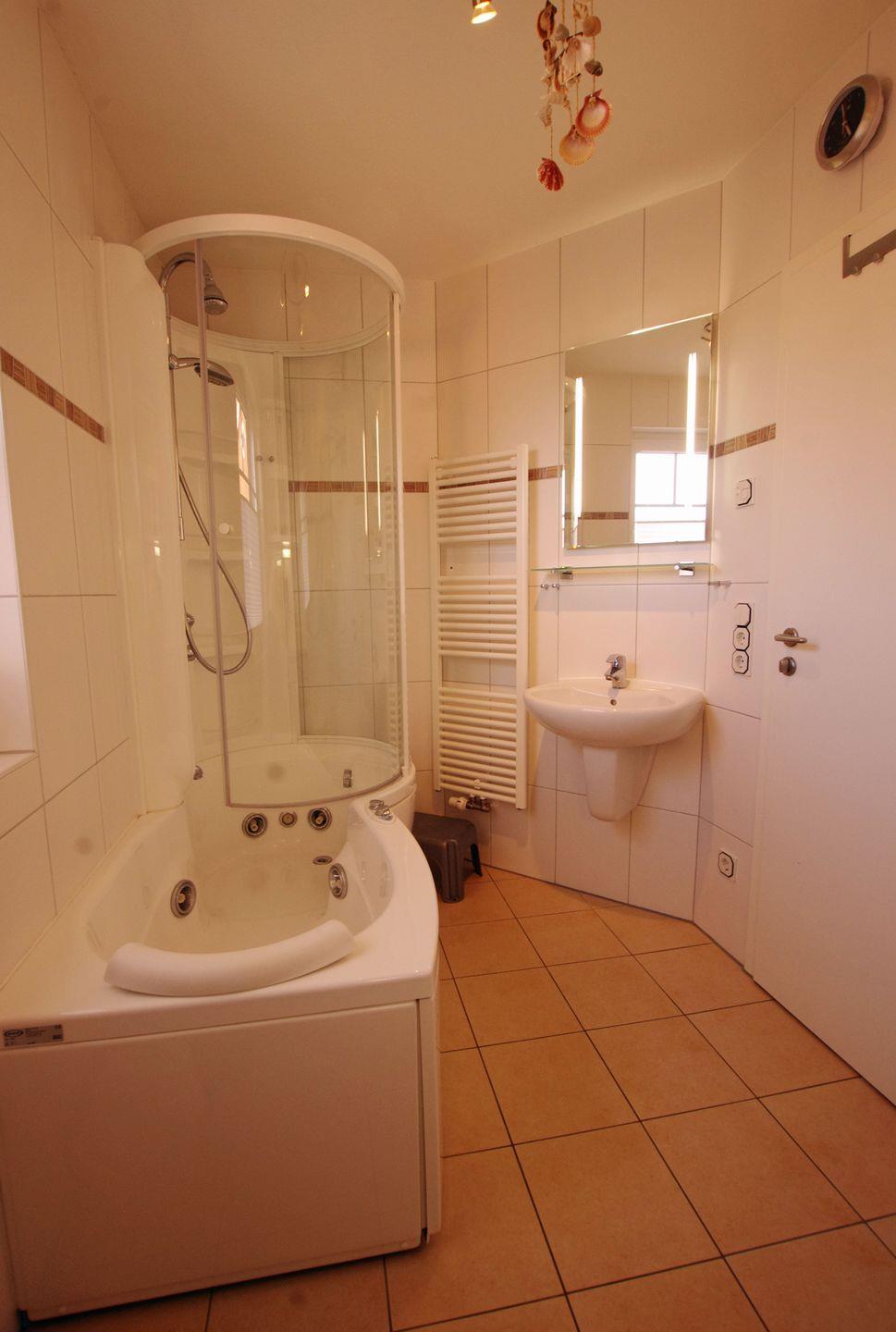 Das Ferienhaus verfügt über zwei Badezimmer, um den Komfort für alle Gäste zu gewährleisten. In einem der Bäder erwartet Sie eine entspannende Badewanne mit Whirlvorrichtung, während das andere Badezimmer mit einer ebenerdigen Dusche ausgestattet ist.