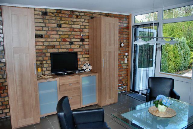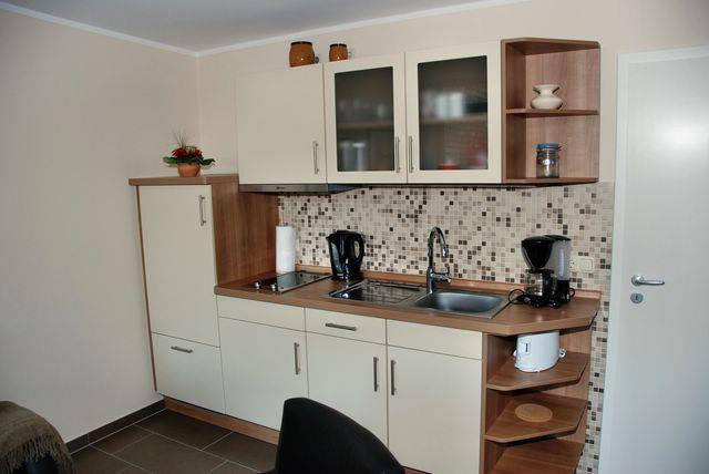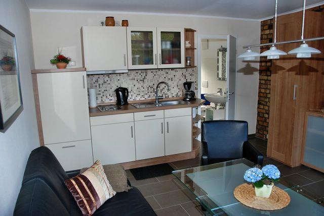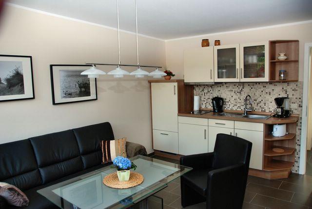 Hier können Sie schöne Stunden verbringen und den Urlaubstag entspannt bei einem Frühstück starten oder bei einem Glas Wein am Wein ausklingen lassen. Die Küche ist ebenfalls in den Wohnbereich integriert und verfügt unter anderem über einen Herd, eine Mikrowelle, einen Kühlschrank mit Gefrierfach, Kaffeemaschine und bietet gute Voraussetzungen für eine Selbstversorgung.