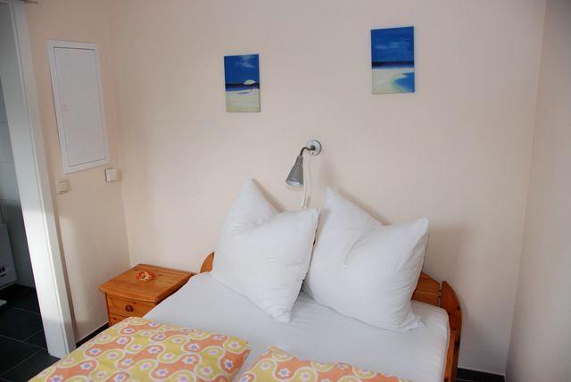 Das Schlafzimmer ist mit einem Doppelbett (140x200cm, durchgehende Matratze) und das Badezimmer mit Fenster ist mit einer großzügigen, ebenerdigen Dusche, Waschtisch, WC und Föhn ausgestattet.